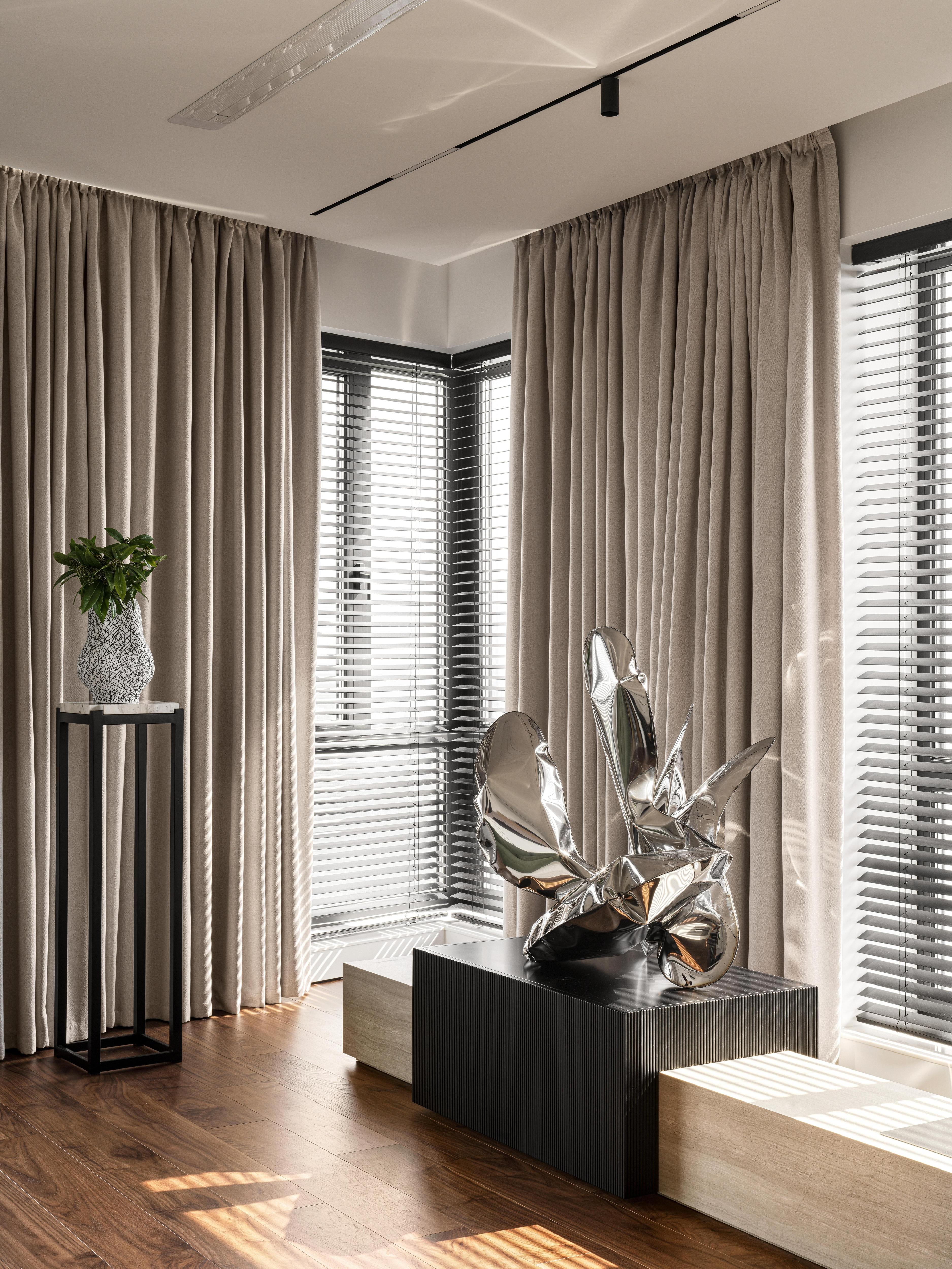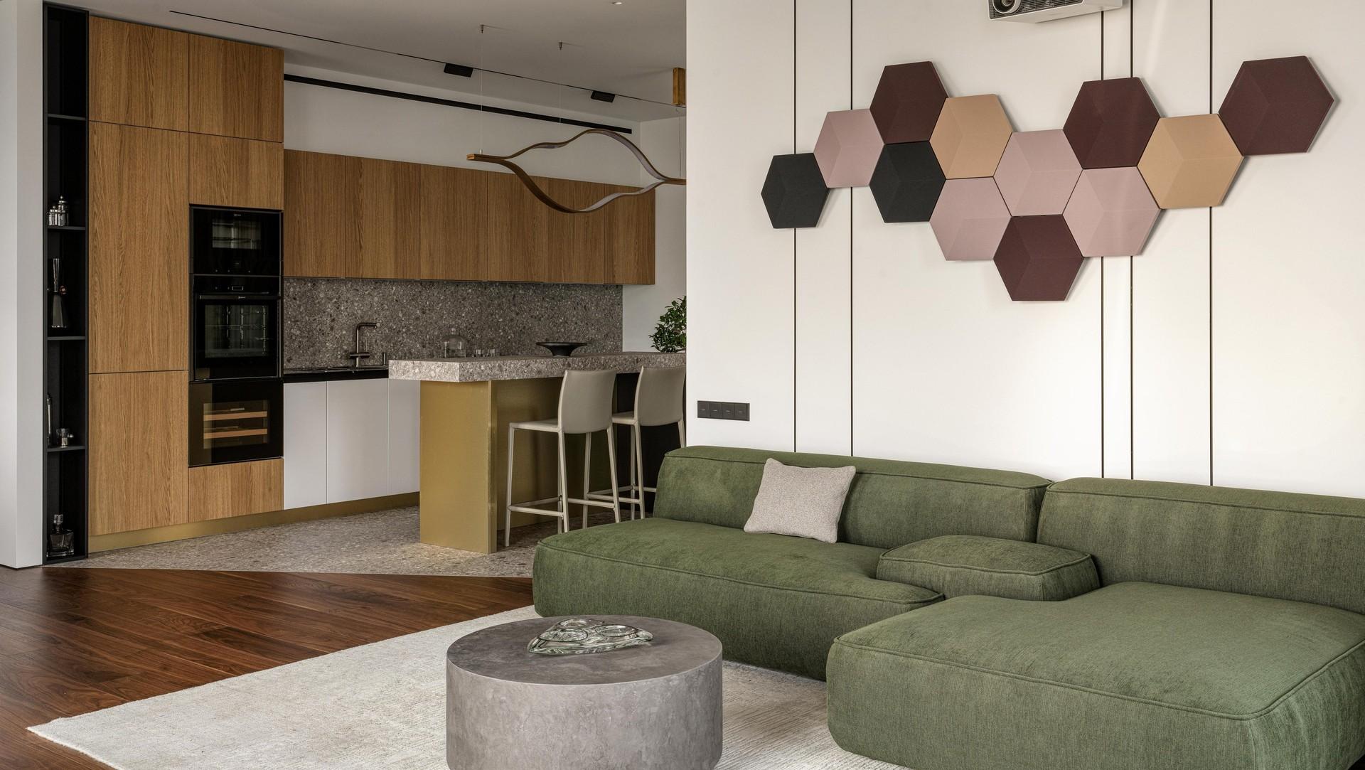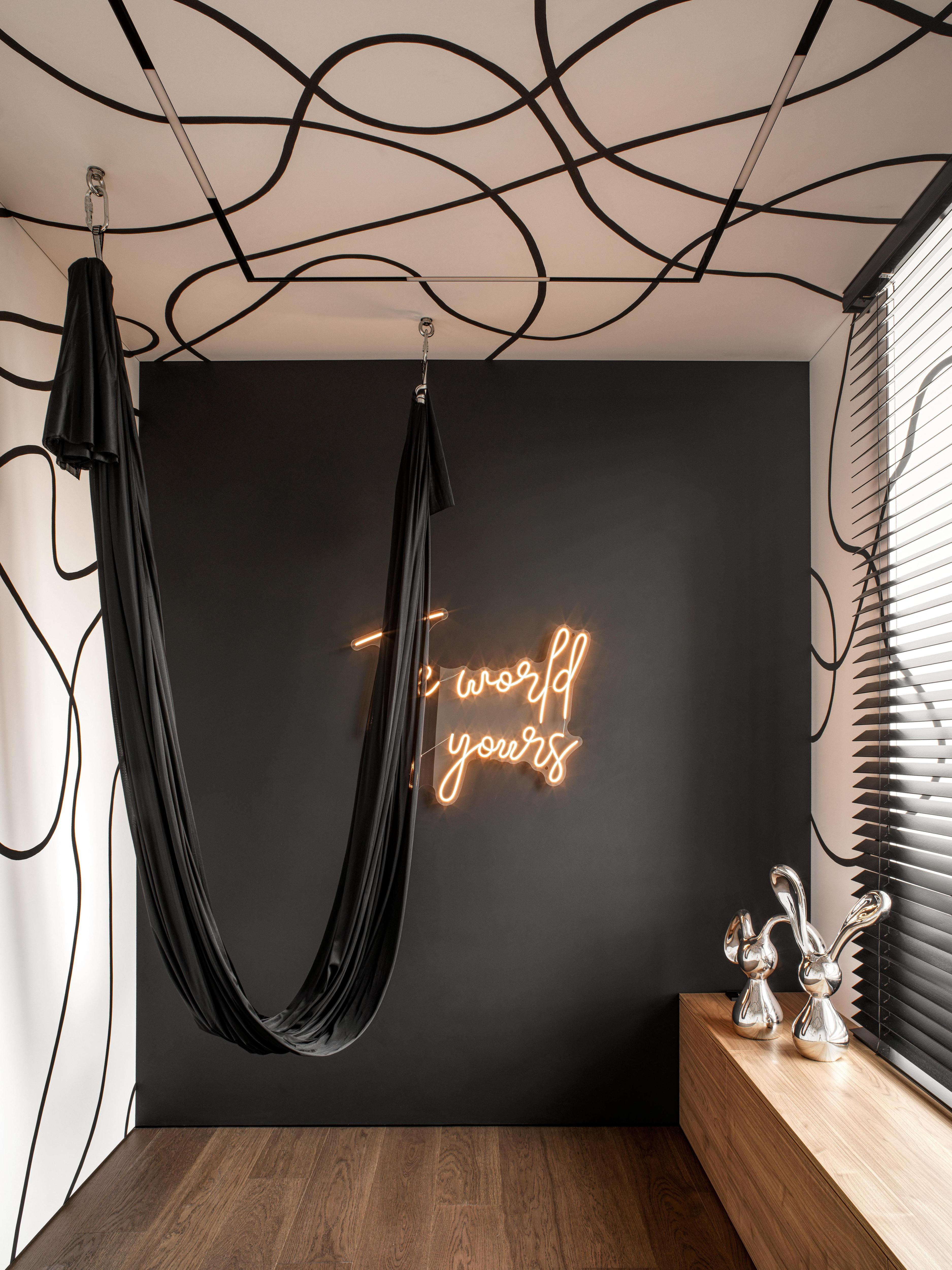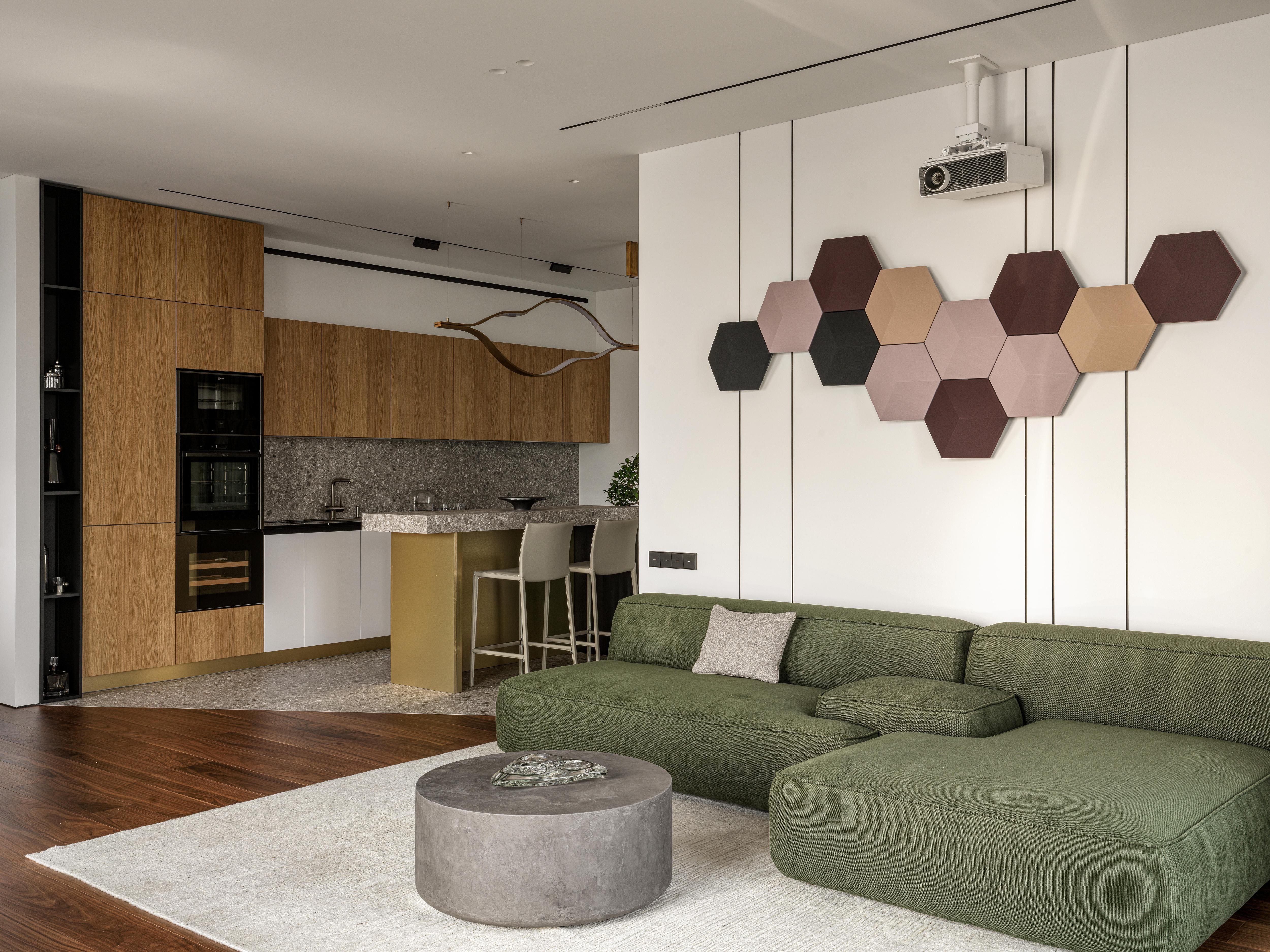 У каждой зоны есть четкая граница, но при этом все они объединены общей эстетикой и эмоцией. Особое внимание мы уделяли грамотному переходу между зонами: например, кухню и спальню разделяет комната для йоги, что делает интерьер более дышащим.