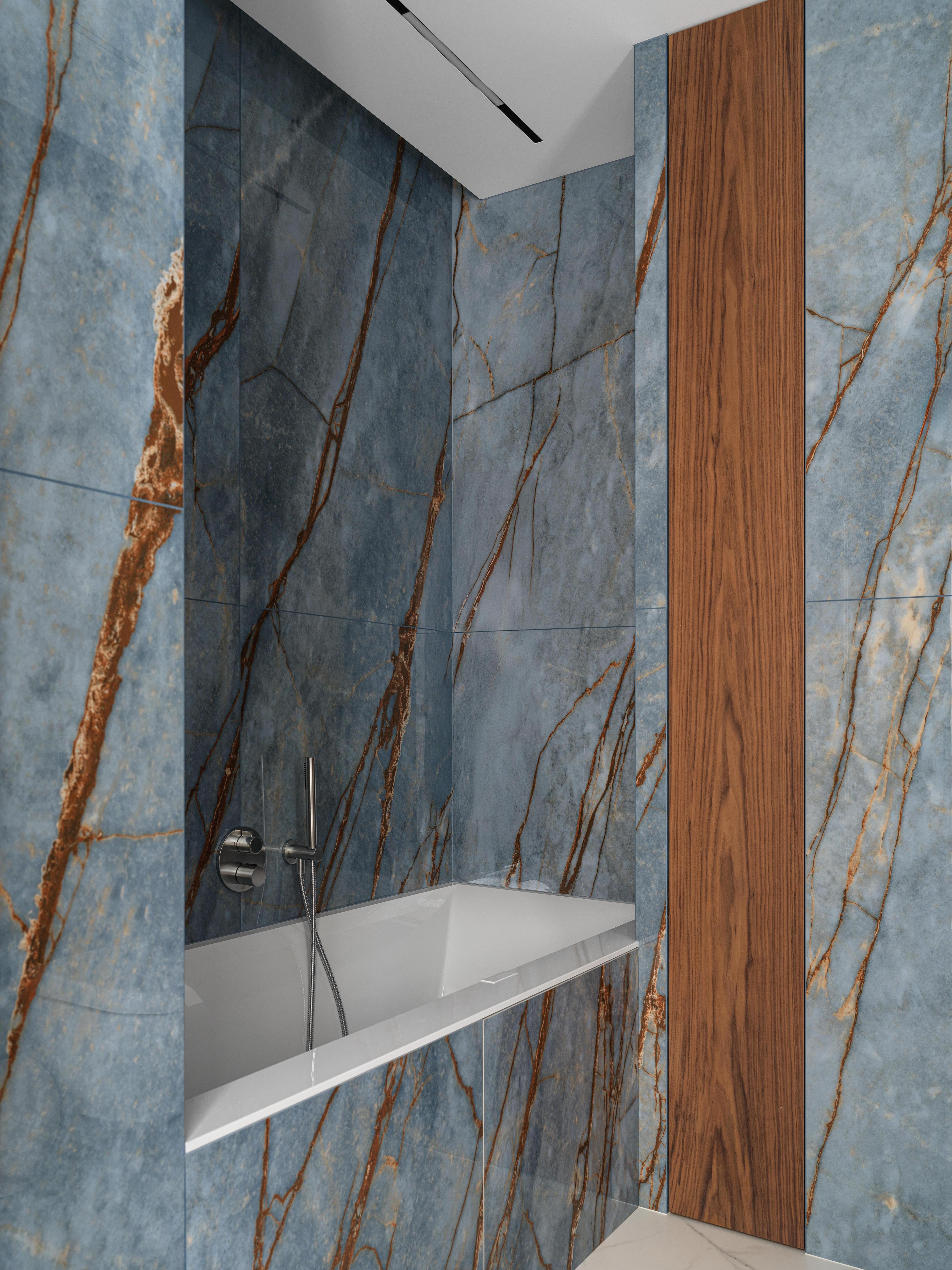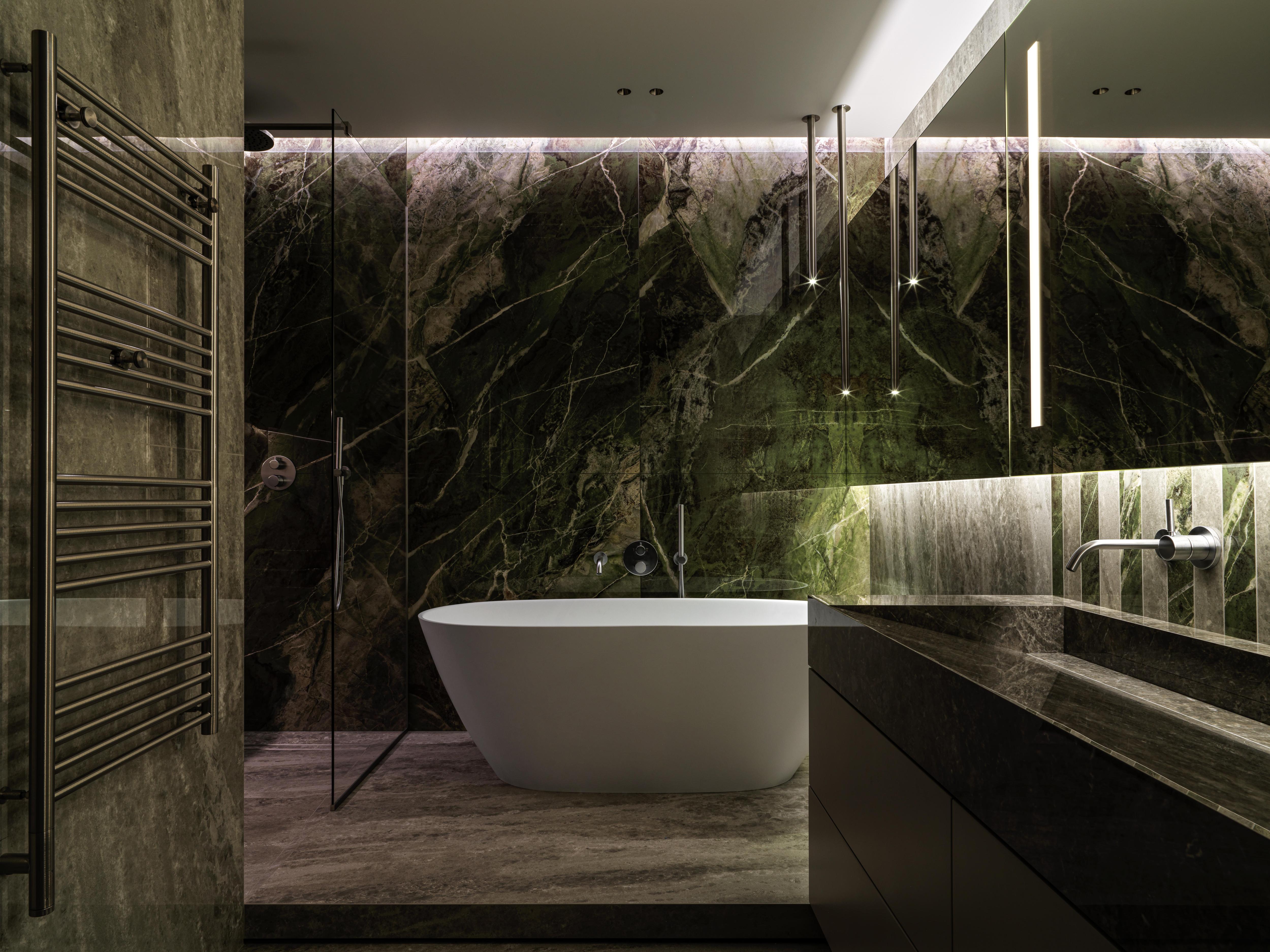 Керамогранит, Rex Ceramiche. Ванна, Salini. Смесители, Dornbracht. Полотенцесушитель, «Сунержа».