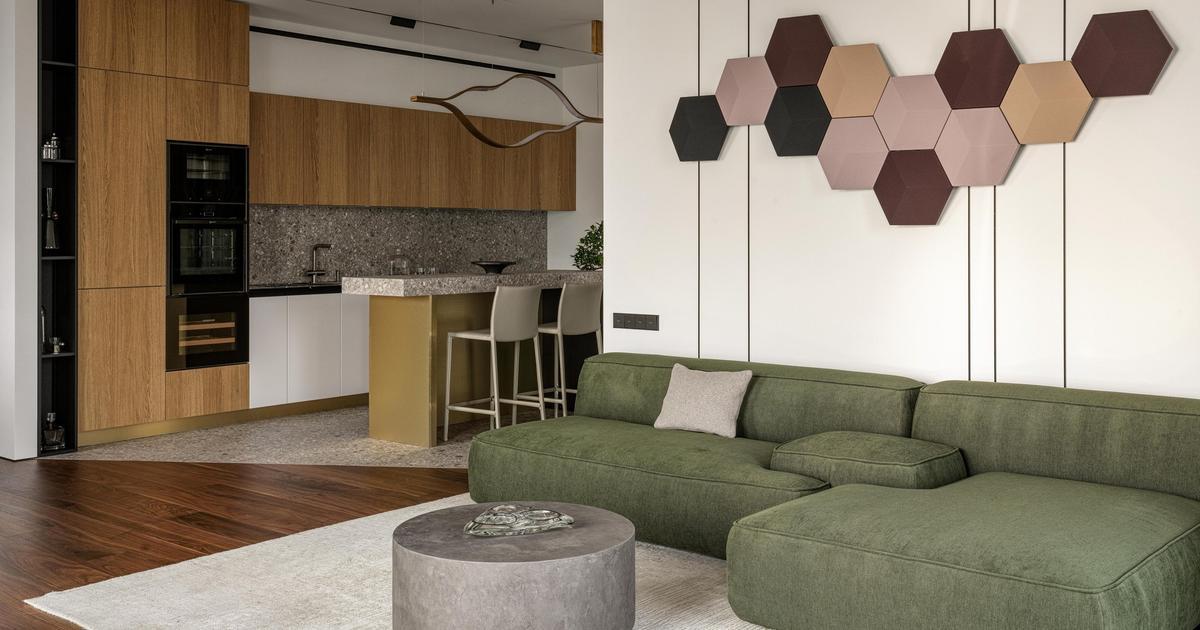 Основная палитра — натуральные и спокойные оттенки: теплый шпон, природные цвета, зеленая плитка в ванной, небесно-голубой керамогранит в гостевом санузле, нежные тона в детской. Эти цвета создают уютную и расслабляющую атмосферу. Есть и неожиданные акценты — неоновая вывеска и декоративные элементы — они добавляют индивидуальности и вместе с тем не перегружают интерьер.