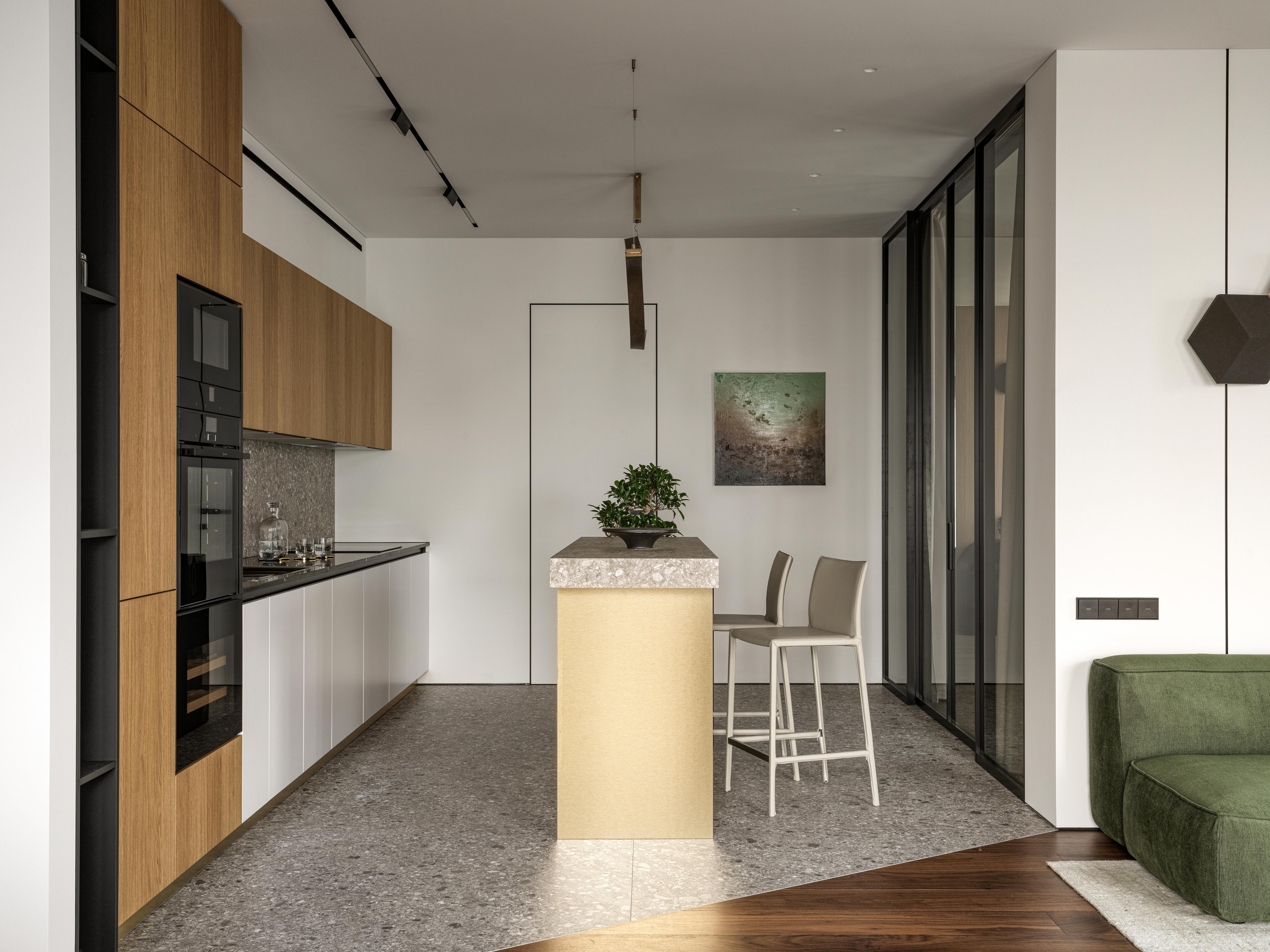 Строгую геометрию кухни разбавляет остров с деревом бонсай и светильником от Henge. От гостиной кухня зонирована другим напольным покрытием, что, с одной стороны, выделяет ее, а с другой — не дробит пространство, не делает его тесным.