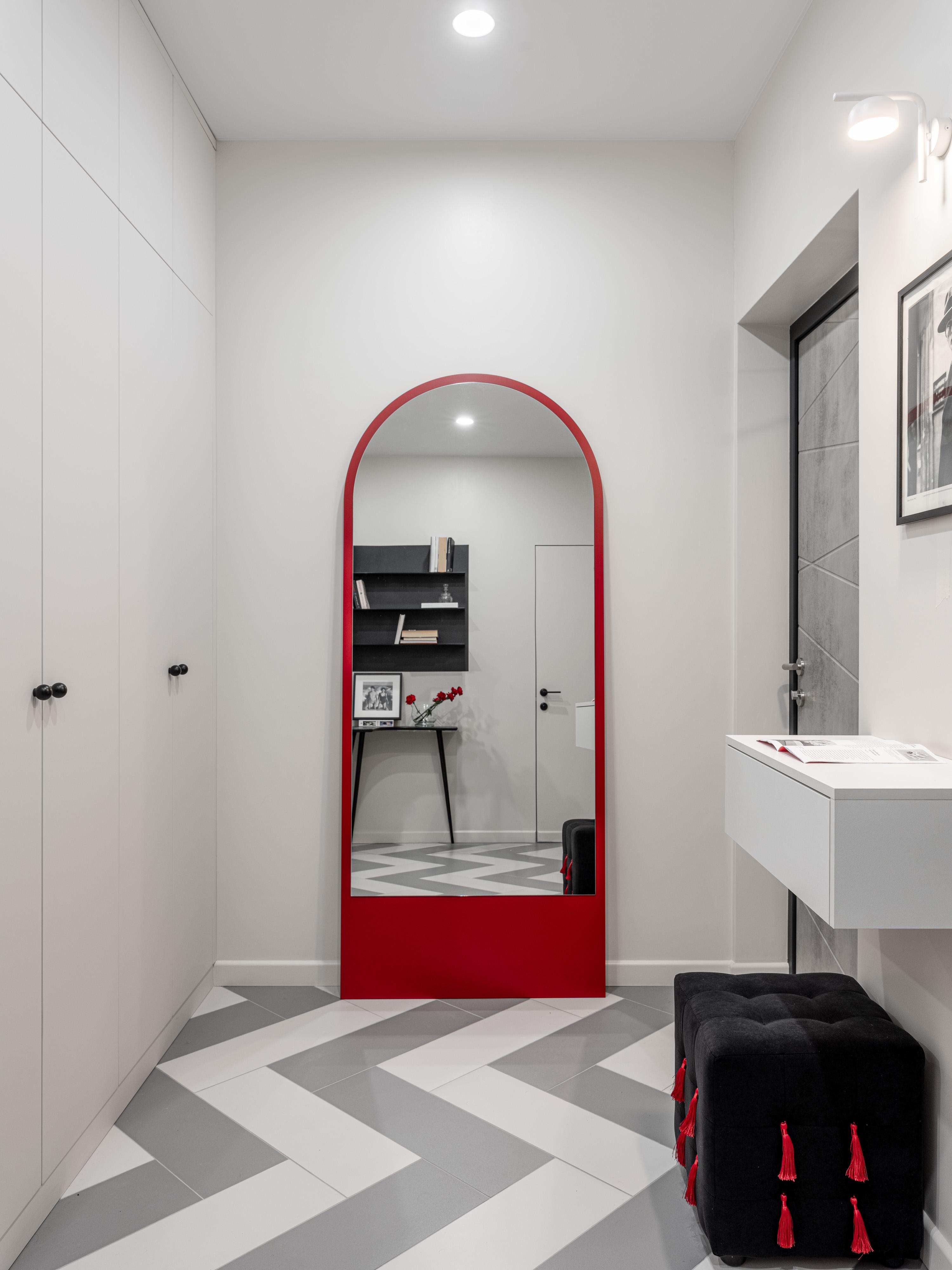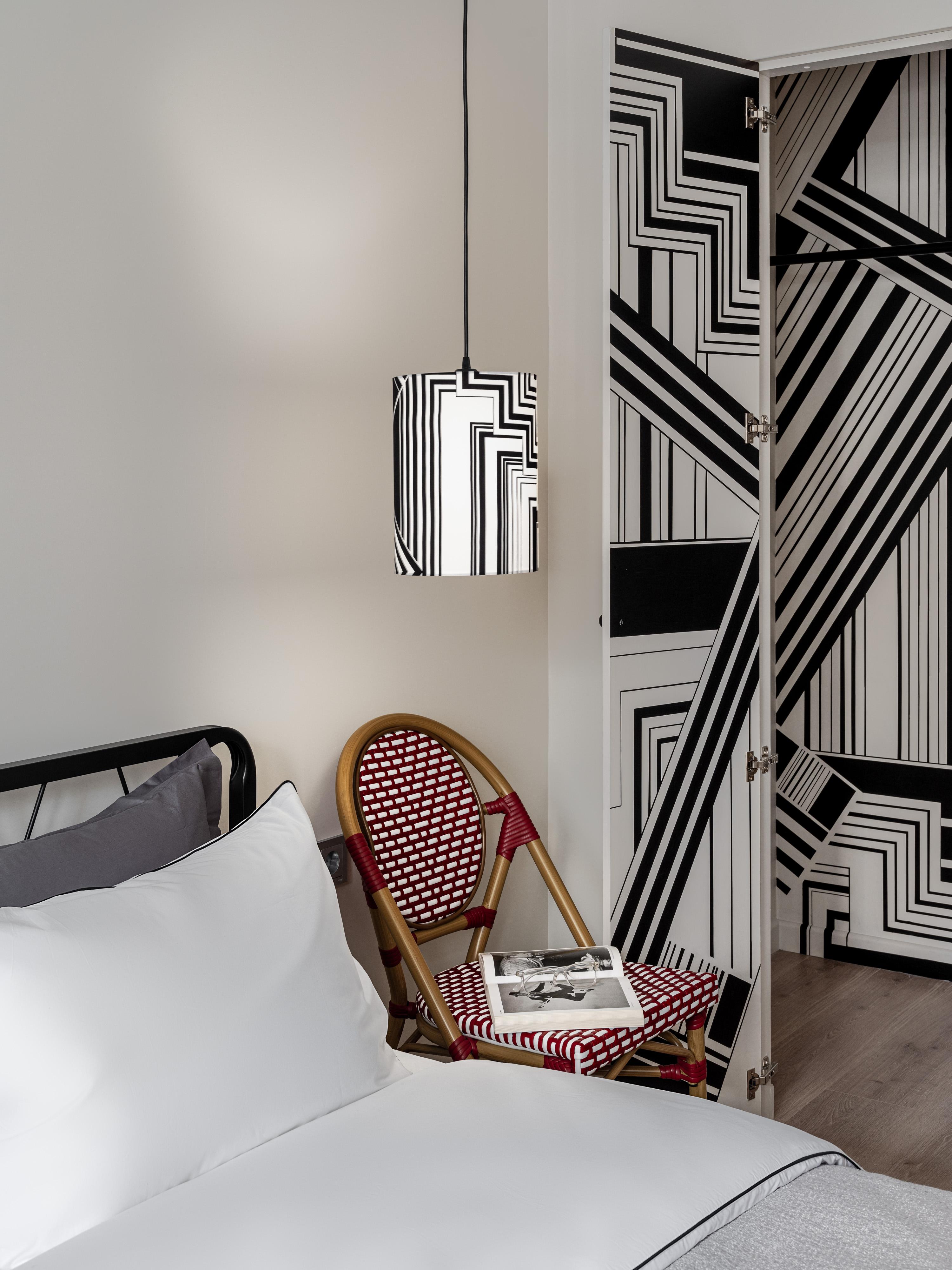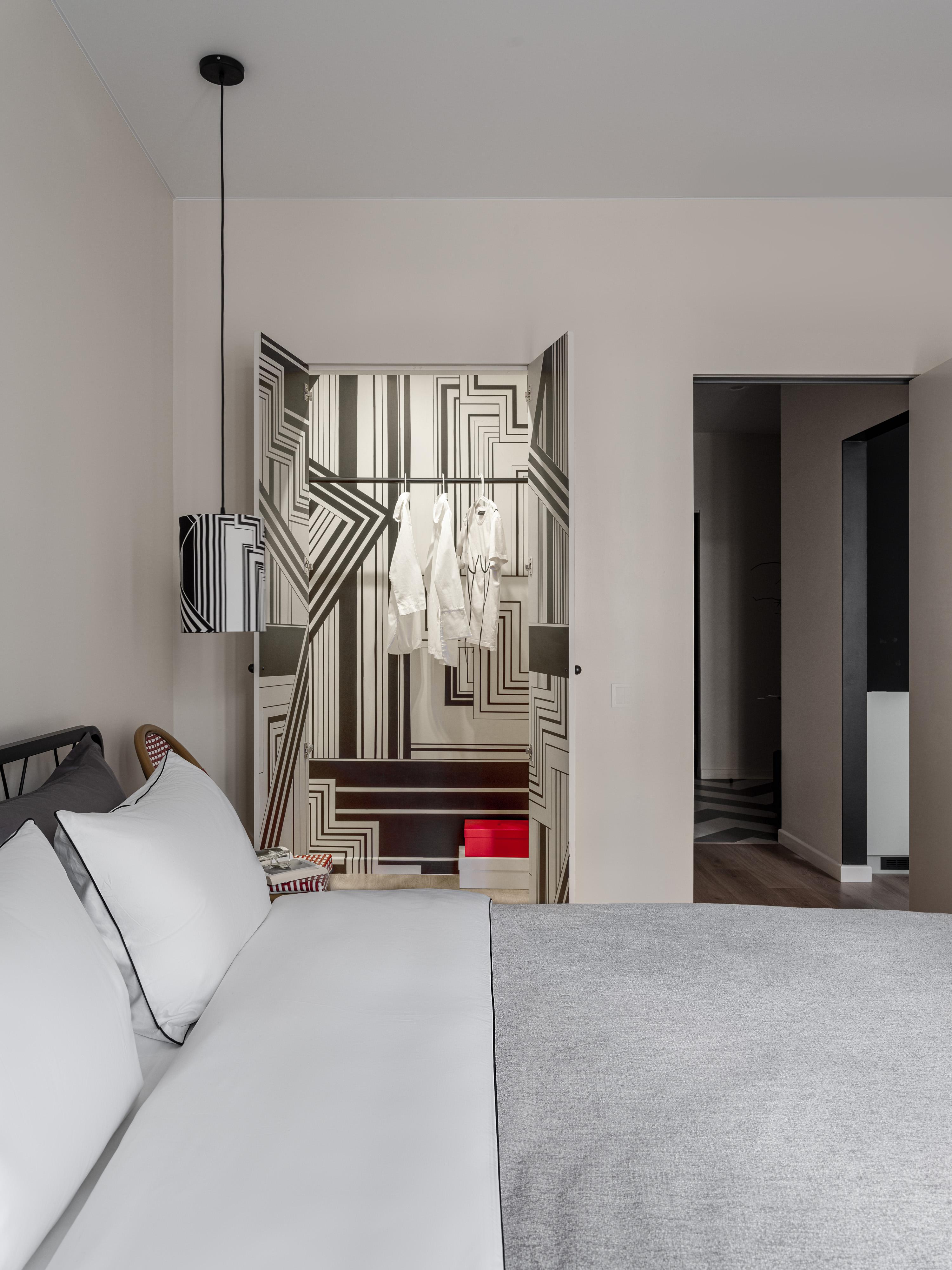 Черно-белая динамичная графика превратила гардеробную в арт-объект — нам хотелось вдохнуть искусство в повседневность. Расписать стены внутри гардероба мы пригласили художницу Алену Морозову, которая вдохновлялась рисунком ткани для абажура. А сам абажур мы доверили мастерской Юлии Сластихиной.