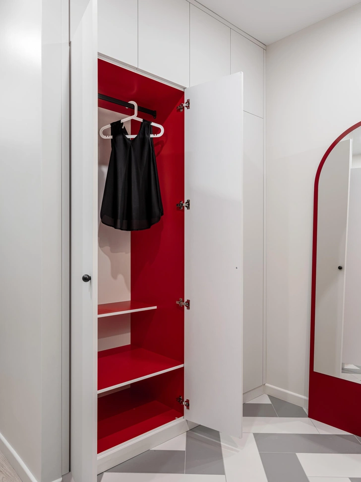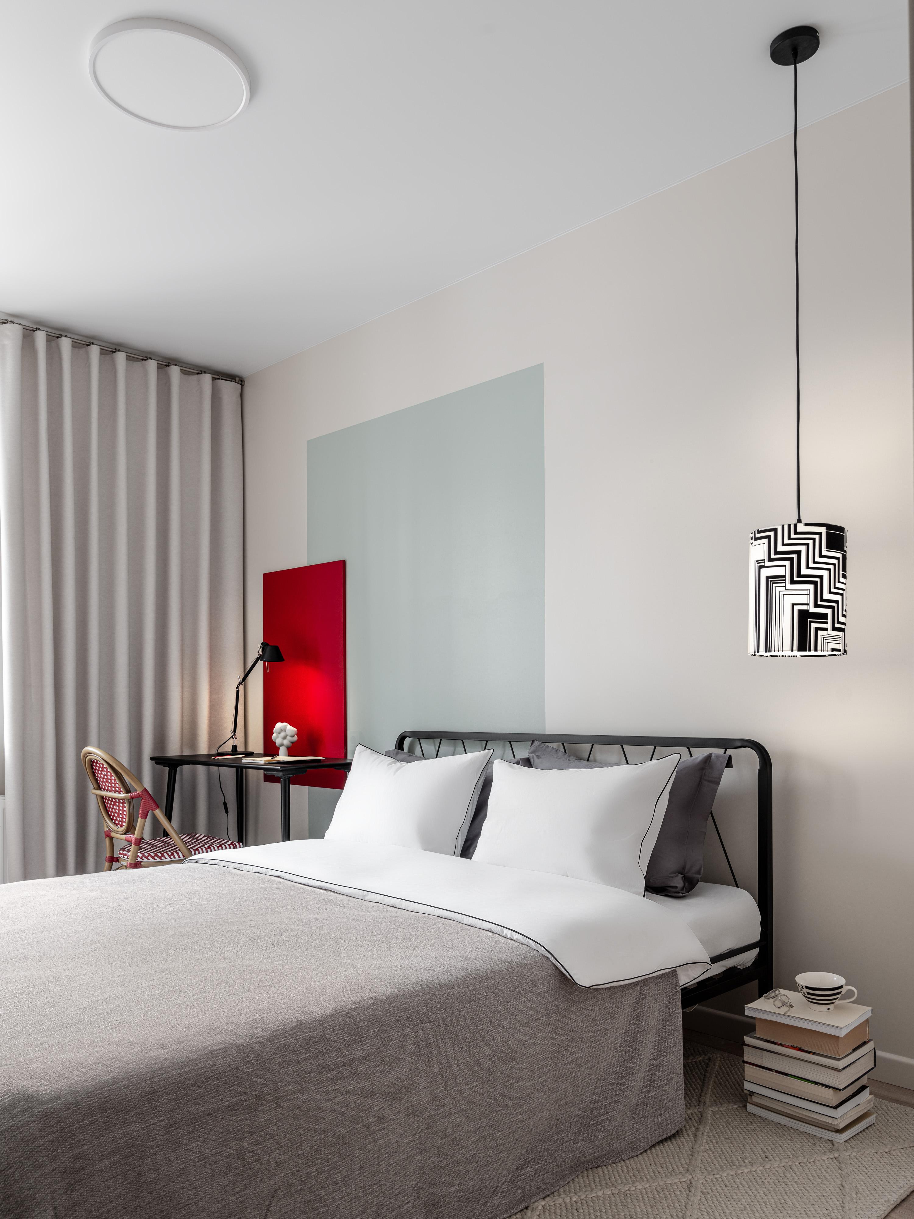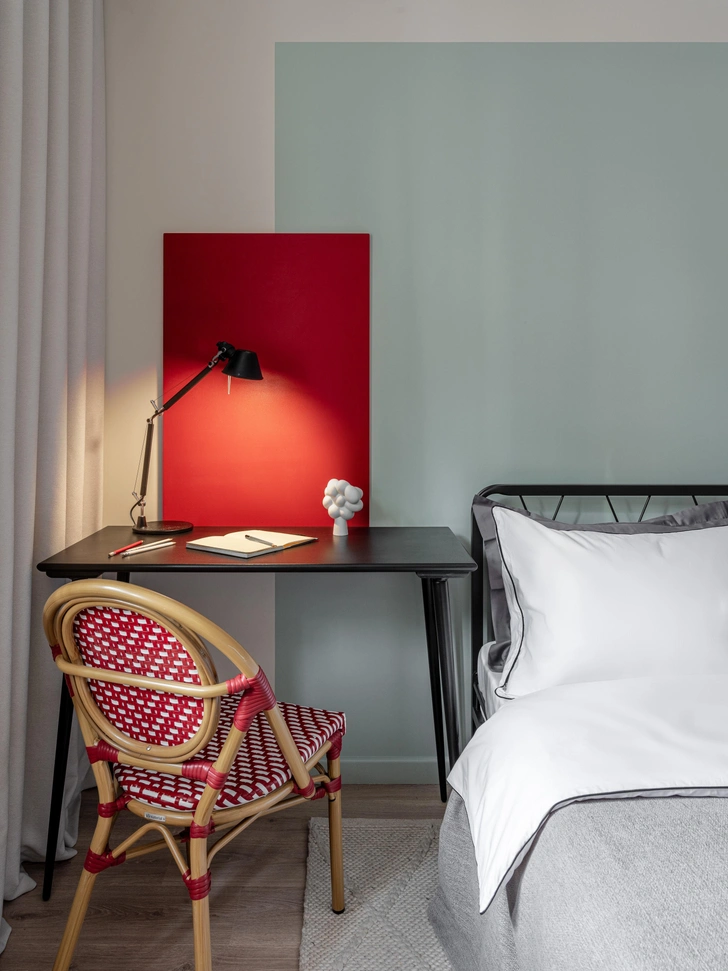 В спальне подружили нейтральные тона с выразительными акцентами: гардероб, ярко-красная декоративная панель возле стола и кресло с плетением — все это создает атмосферу парижское кафе.