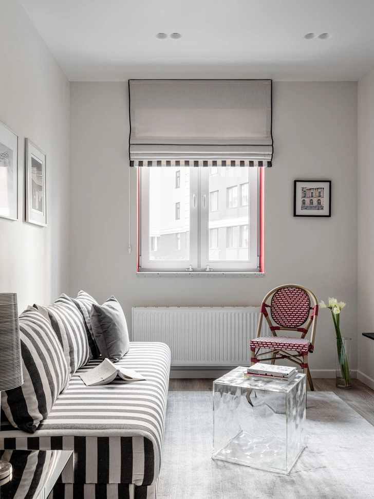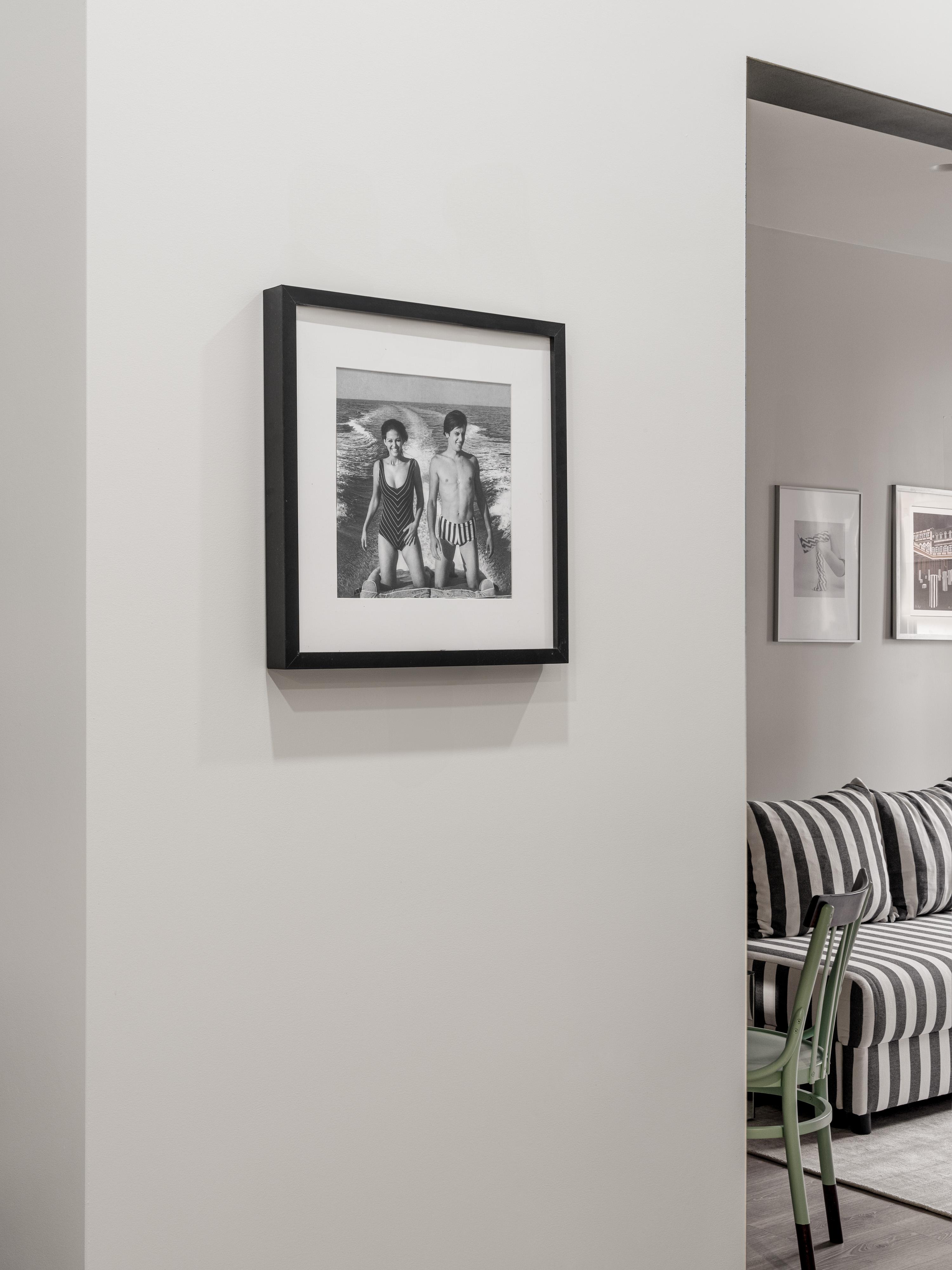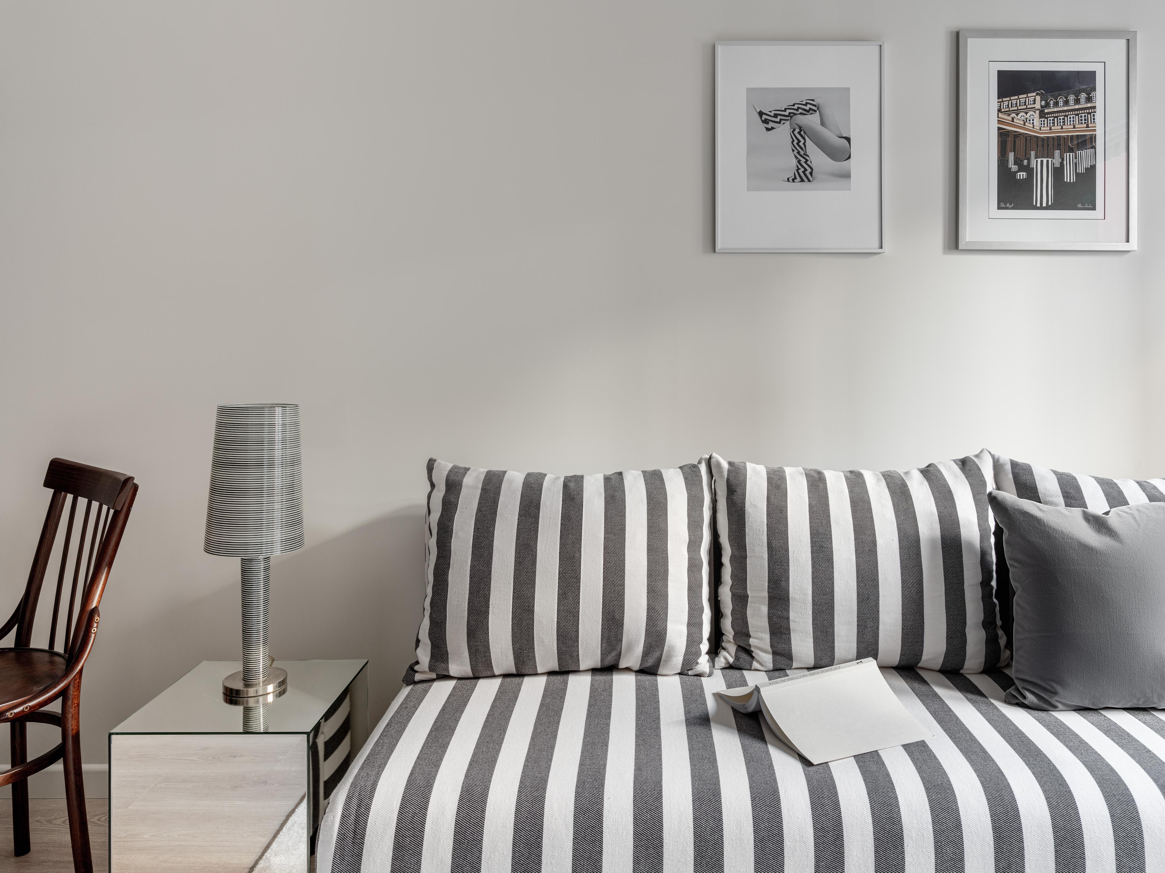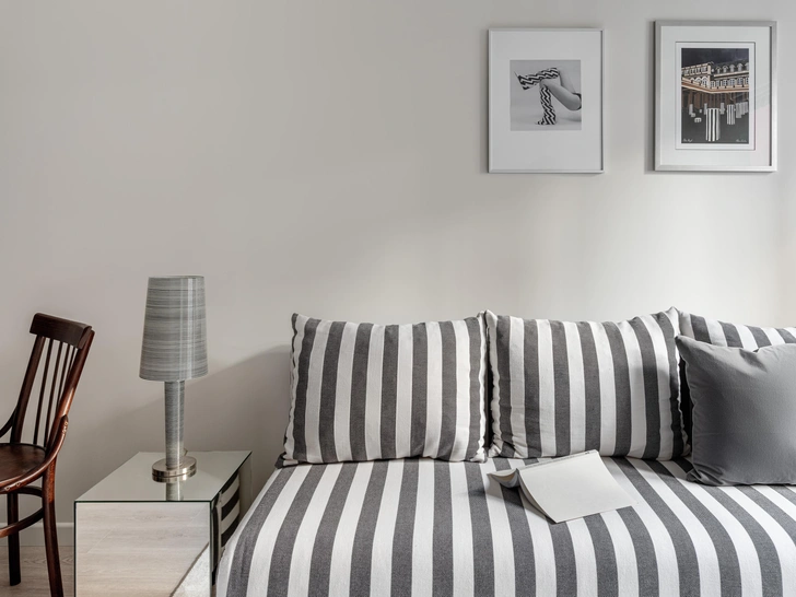Во всем интерьере в разных пропорциях прослеживается полосатый принт, он собирает все воедино: в гардеробе, на полу в прихожей и в ванной, в гостиной. Диван в серую полоску сочетается с постерами — при определенном ракурсе с прихожей, например, он забавно сочетается с пляжным костюмом кинозвезды.