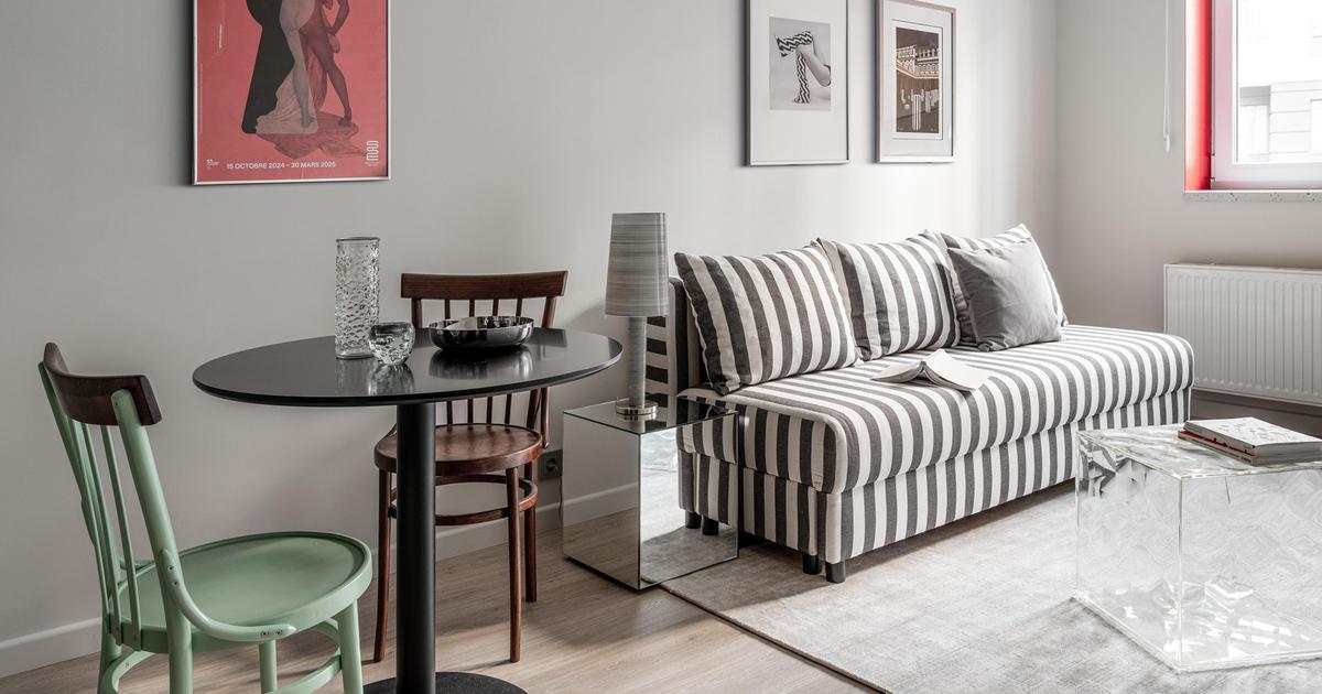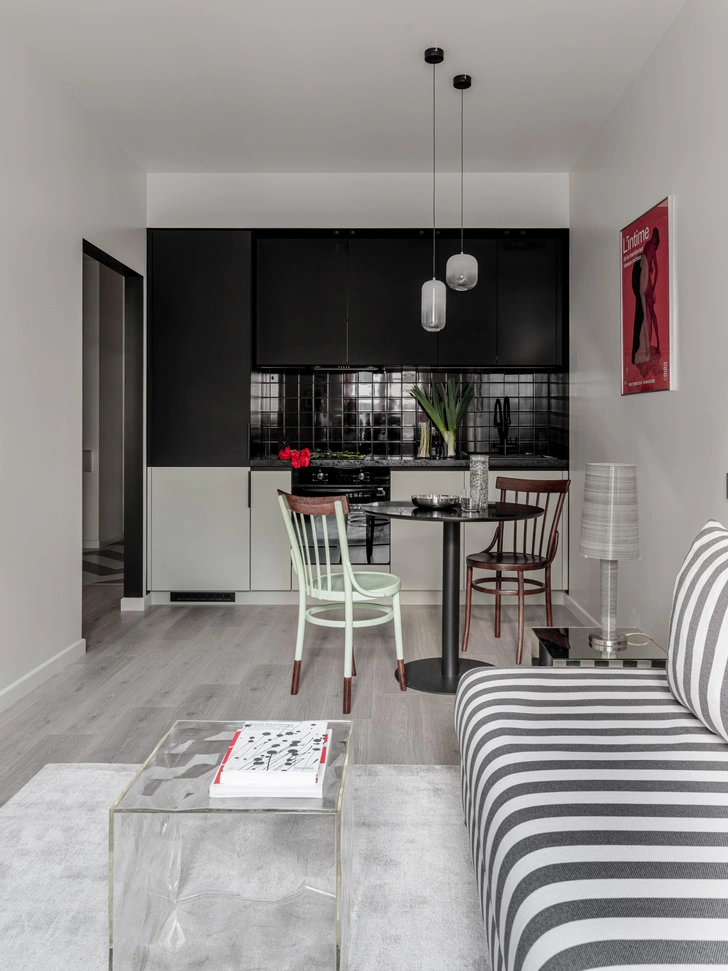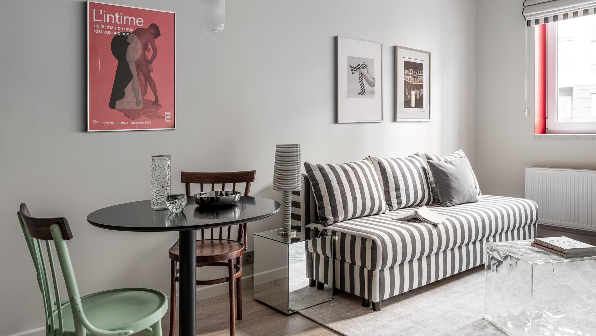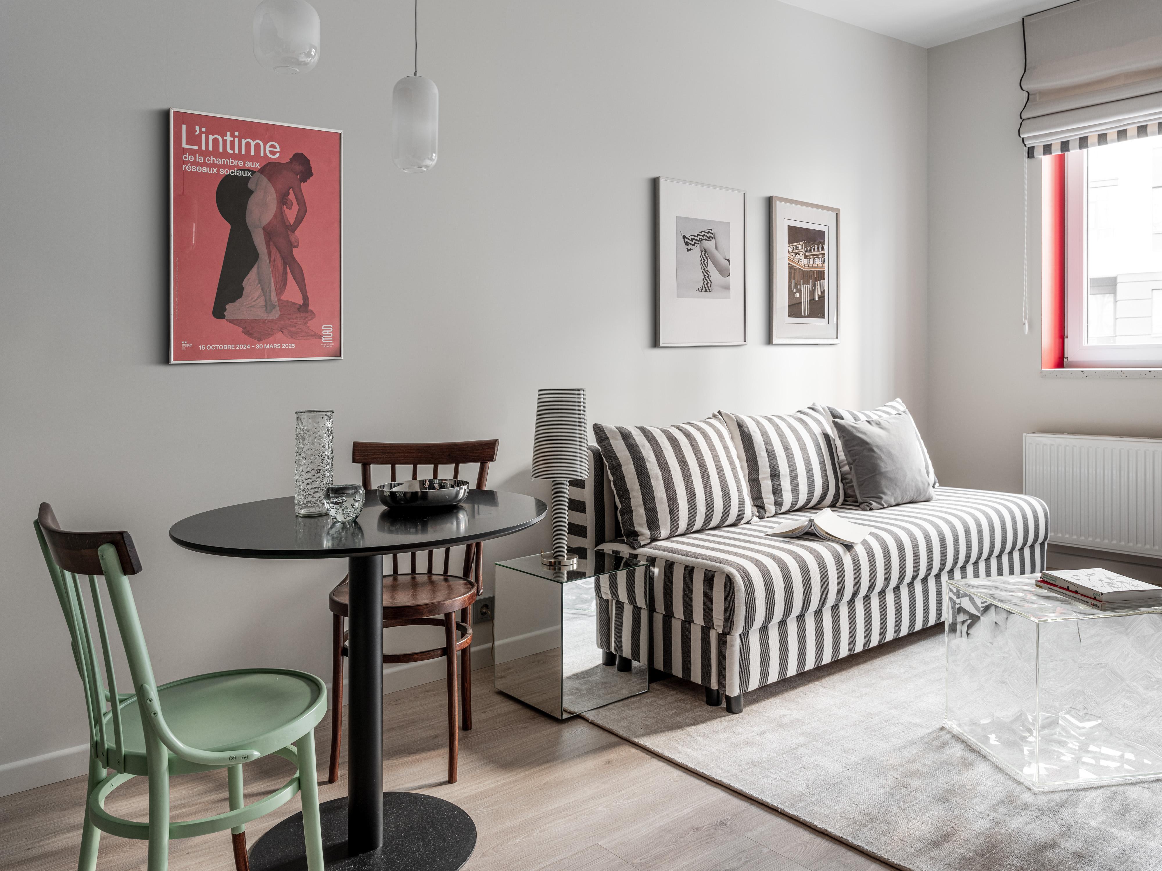 Во всем интерьере в разных пропорциях прослеживается полосатый принт, он собирает все воедино: в гардеробе, на полу в прихожей и в ванной, в гостиной. Диван в серую полоску сочетается с постерами — при определенном ракурсе с прихожей, например, он забавно сочетается с пляжным костюмом кинозвезды.