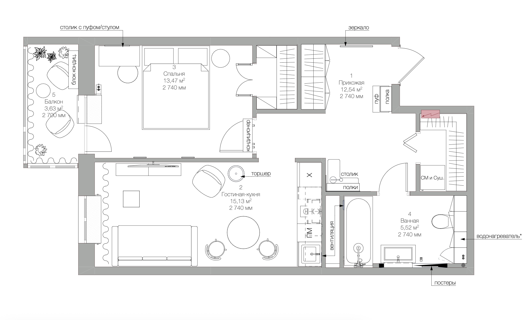 Пожалуй, самым сложным в проекте оказались условия — ограниченный бюджет и сроки, поэтому о серьезных конструкционных решениях речи не шло. Важно было на достаточно небольшой площади разместить кухню-гостиную, спальню с выделенной рабочей зоной, санузел и максимум мест для хранения. Нам досталась прямоугольная квартира без сложных архитектурных элементов. Но почти треть площади занимал коридор, и с этим надо было что-то делать. Поэтому мы разделили часть его площади между другими помещениями: так появился хозблок с постирочной и довольно просторная гардеробная при спальне, из которой мы сделали акцентную зону.