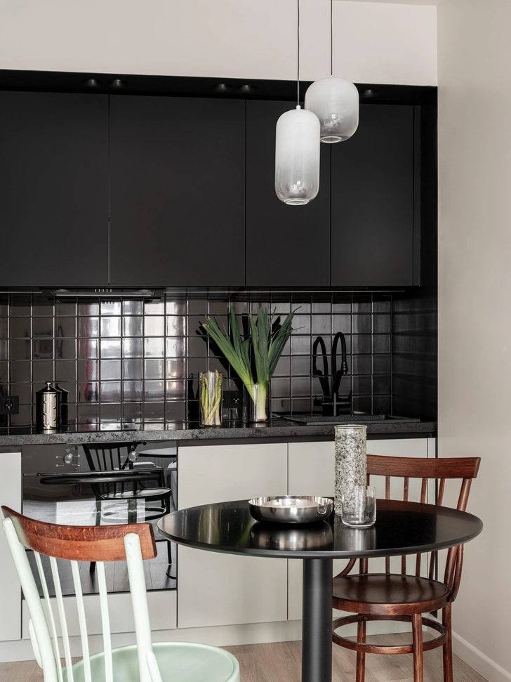 Акцентные цвета мы выбрали неслучайно. Красный — отсылка к мельнице «Мулен Руж» и красному вину. Комплементарный красному мятный — цвет кованых арок в стиле ар-нуво парижского метро и нефа Гран-Пале. Черный — главный цвет французского стиля, воспетый Шанель.