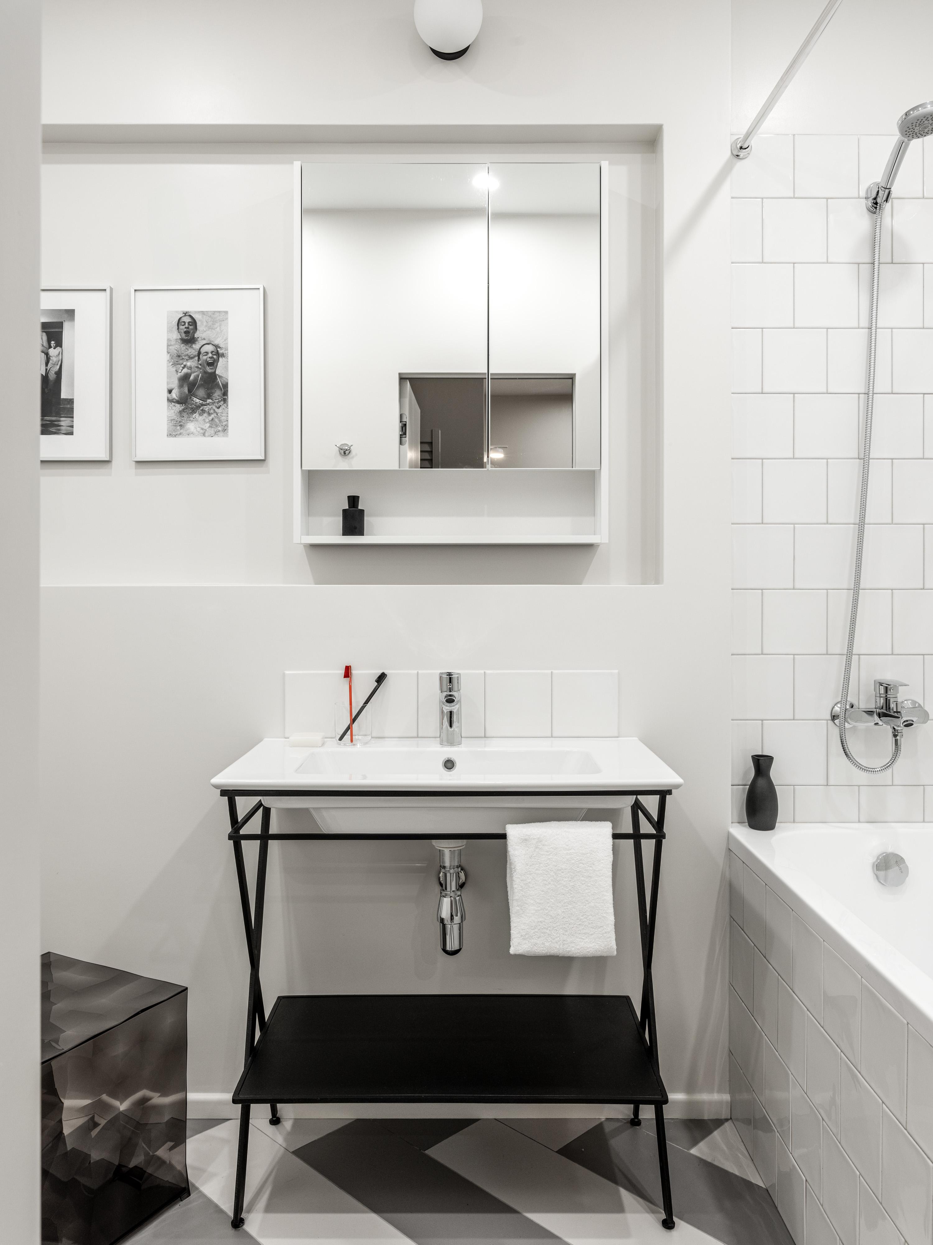 Пожалуй, самым нейтральным местом стала ванная комната. Но и она сдержанно демонстрирует французский шарм, привлекая внимание за счет строгих, полностью белых стен и черно-белых снимков в нише. На фото — кадры из фильма «Бассейн» (1969) с Аленом Делоном в главной роли.