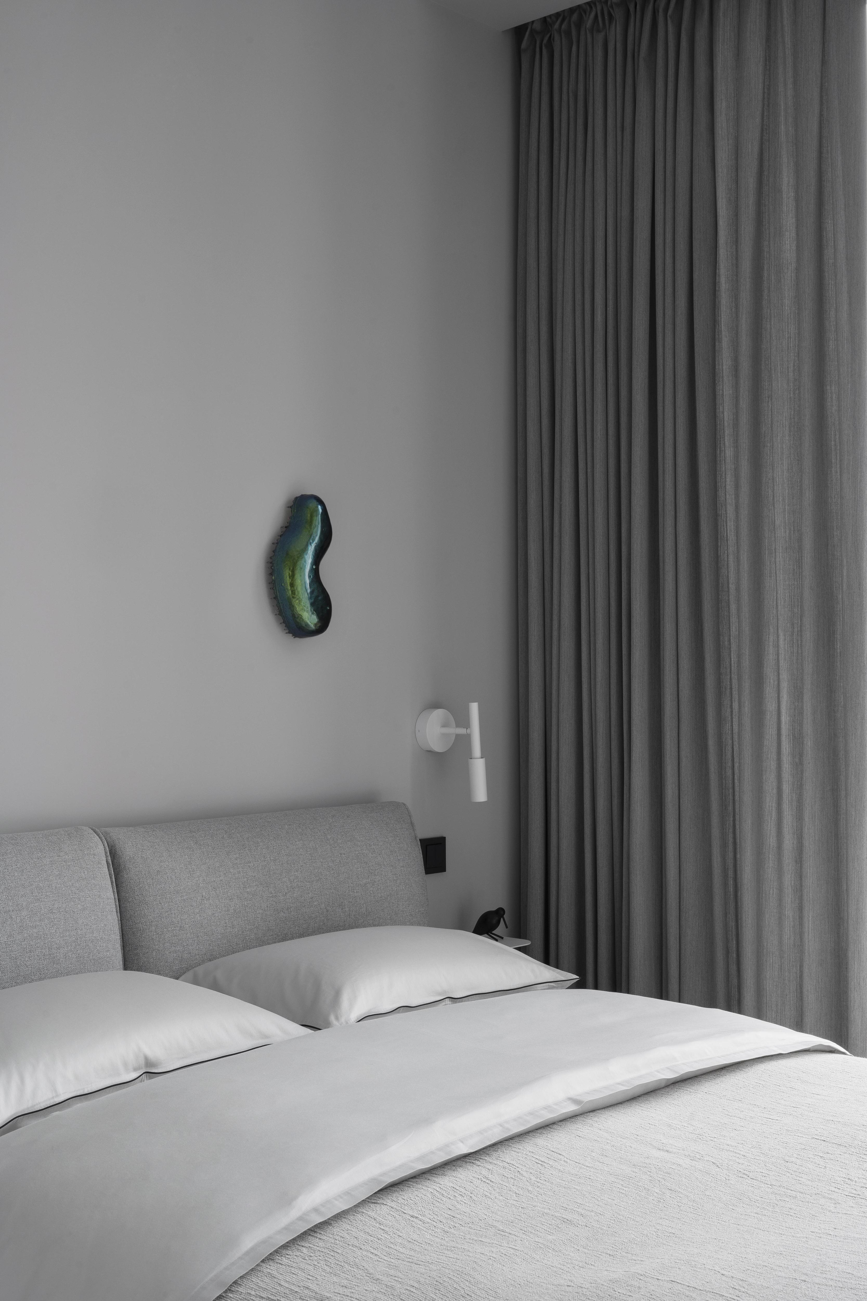 Спальня, как и остальные зоны, в светло-серых тонах. Их разбавляют полы из инженерной доски теплого медового дуба, они смягчают интерьер, придают помещениям уют и природную теплоту. Небольшим, но интересным акцентом стала работа Яна Тихоненко.