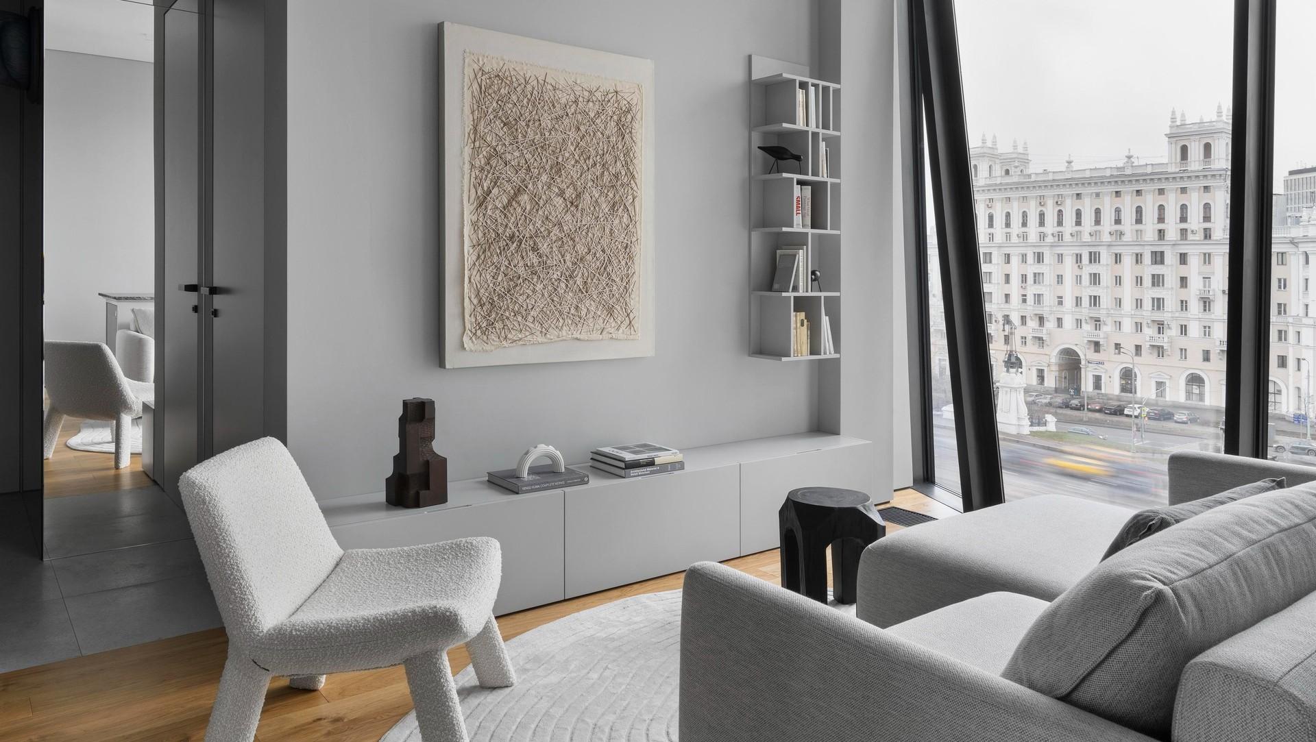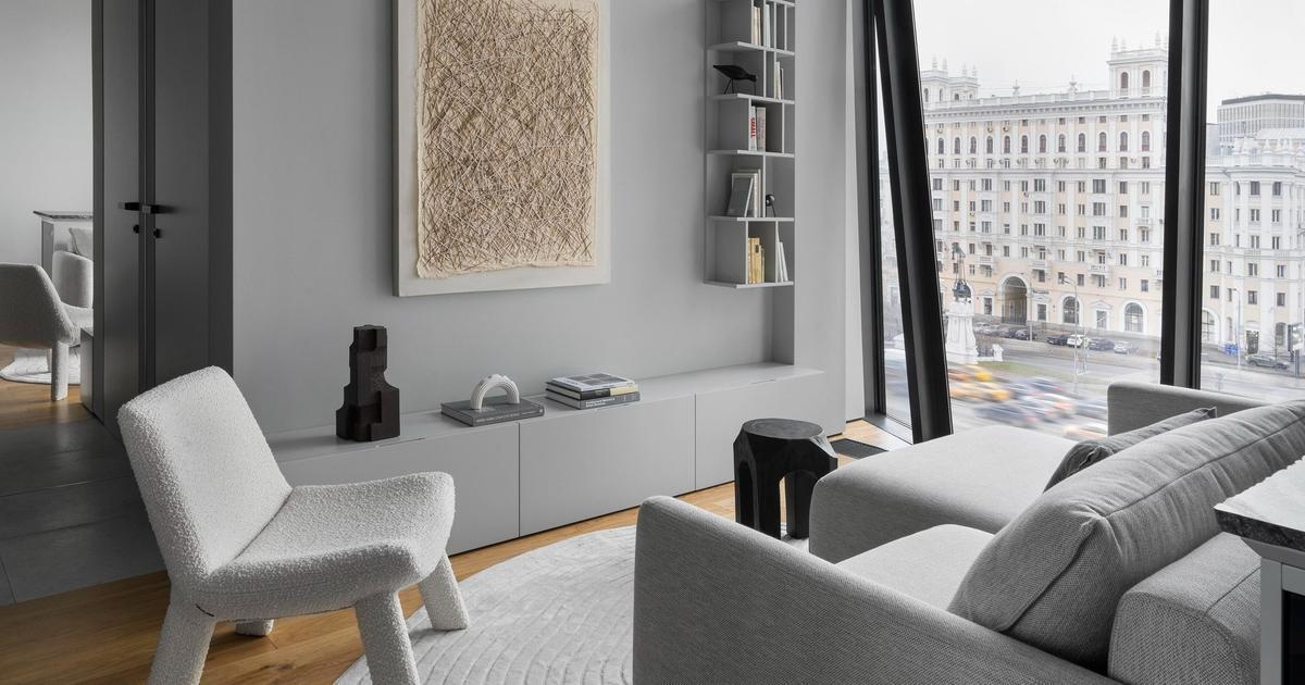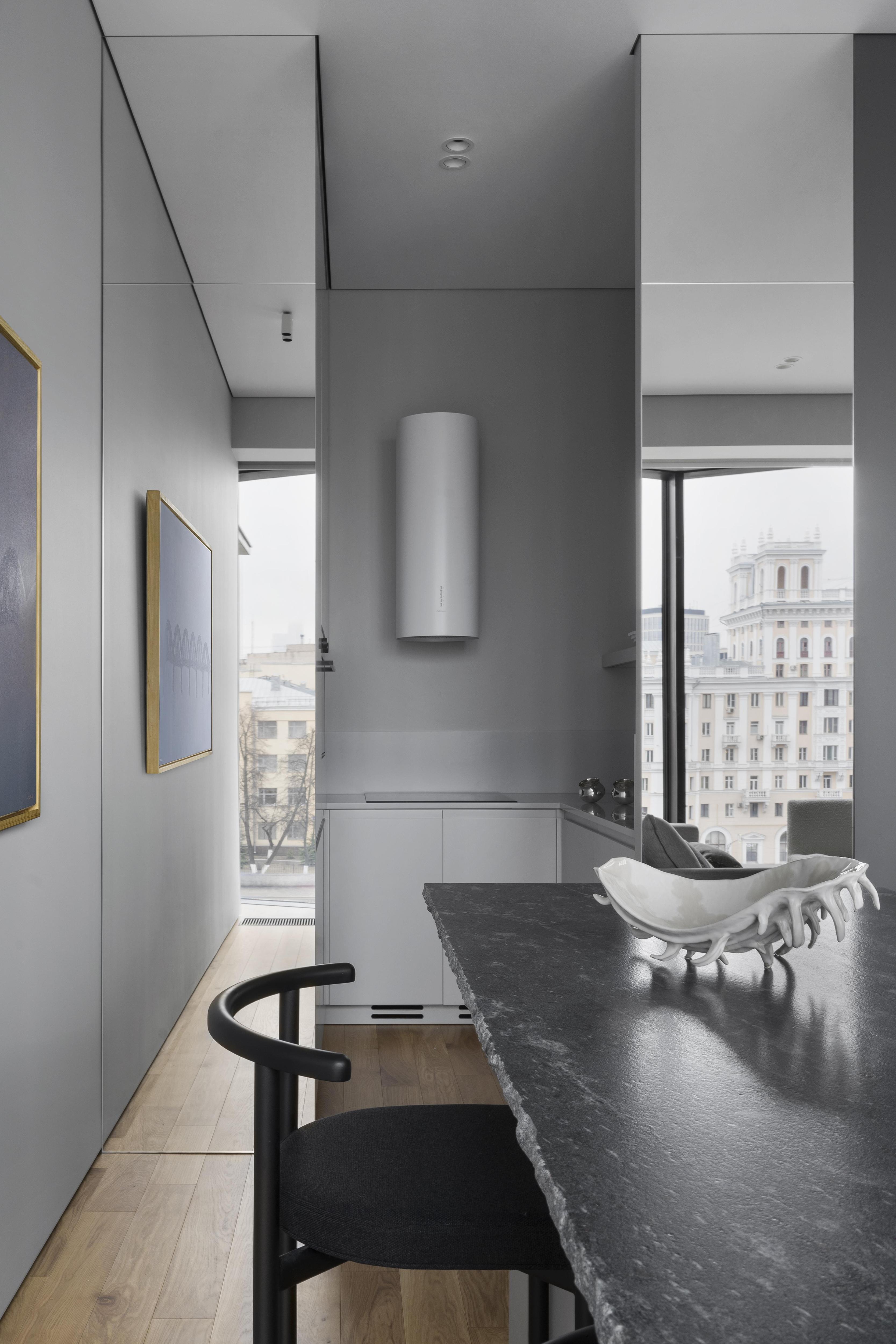 Мы хотели создать интерьер, дополняющий прекрасный вид на город — благодаря панорамным окнам граница между внутренним и внешним пространством стирается. За основу взят серый цвет, который не только хорошо обрамляет пейзаж, но и делает интерьер универсальным. Квартиру заказчик купил для сдачи, так что оформить ее надо было нейтрально, без излишеств, но и не забыть про интересные детали.