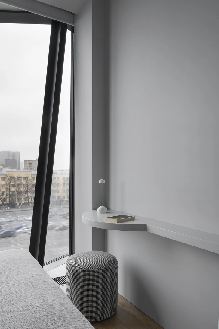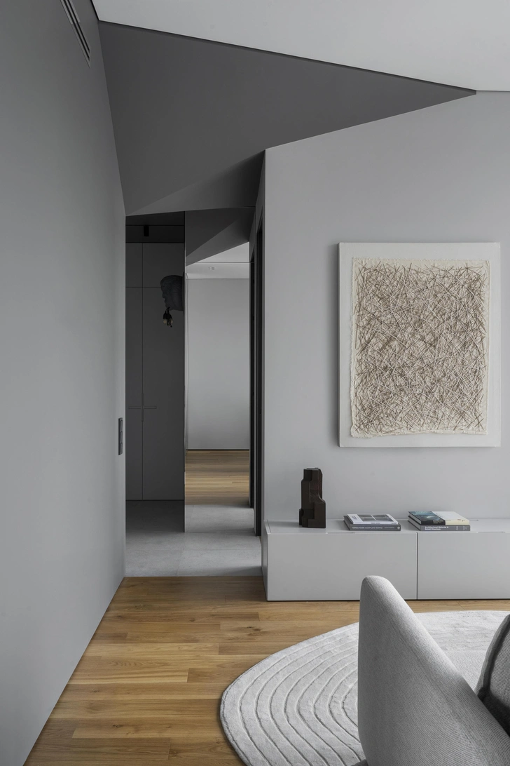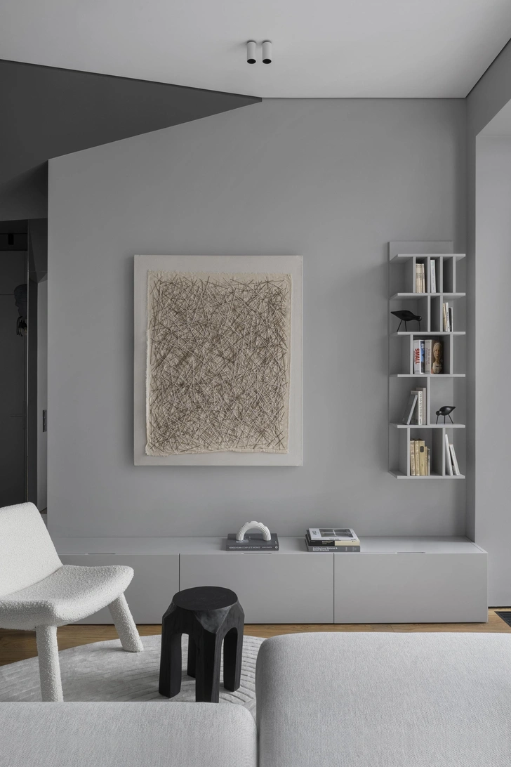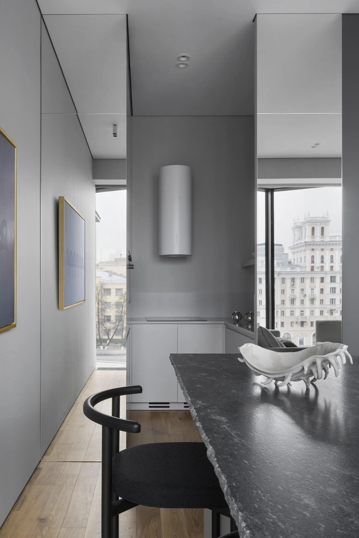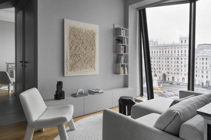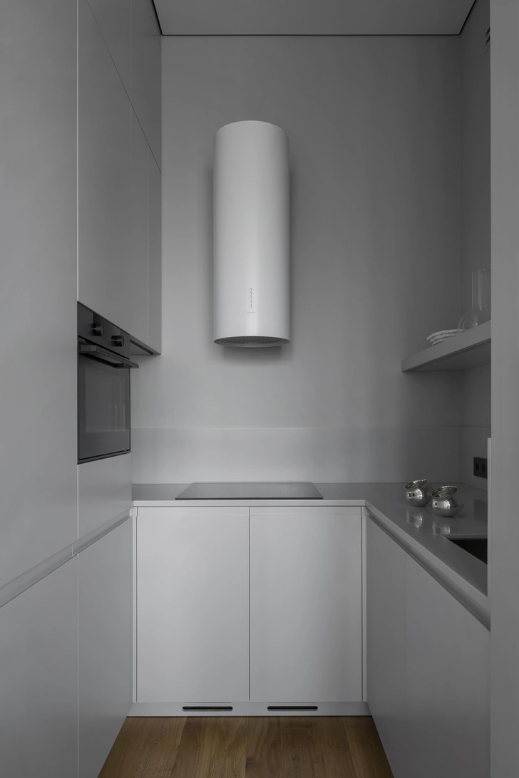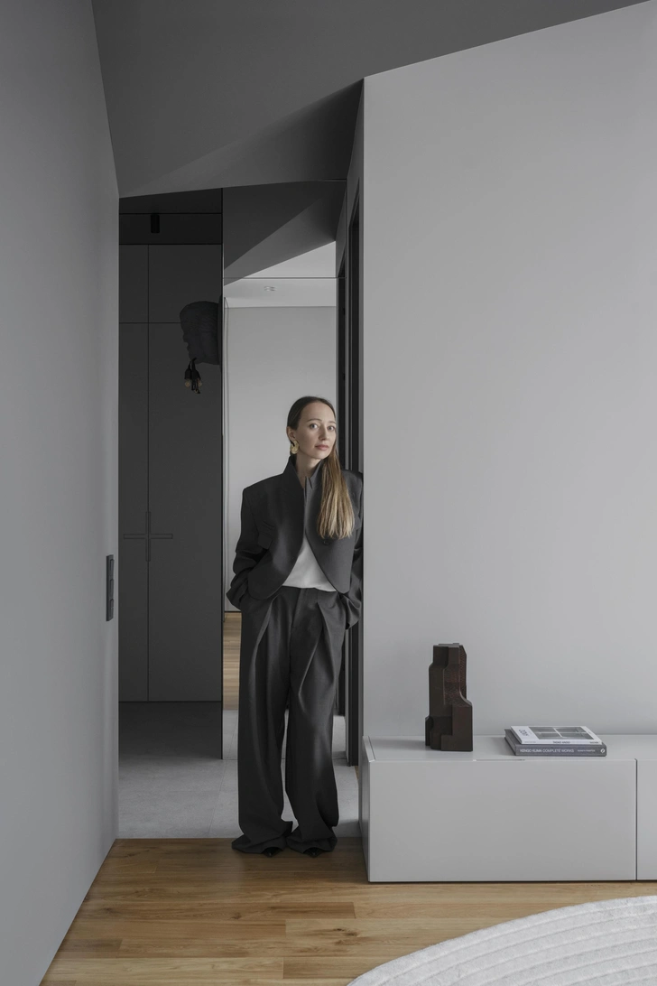 Встроенная мебель специально разработана так, чтобы оставаться незаметной и не перегружать пространство. Это позволило сохранить чистоту линий и минималистичность интерьера, где нет лишнего декора — все по делу.