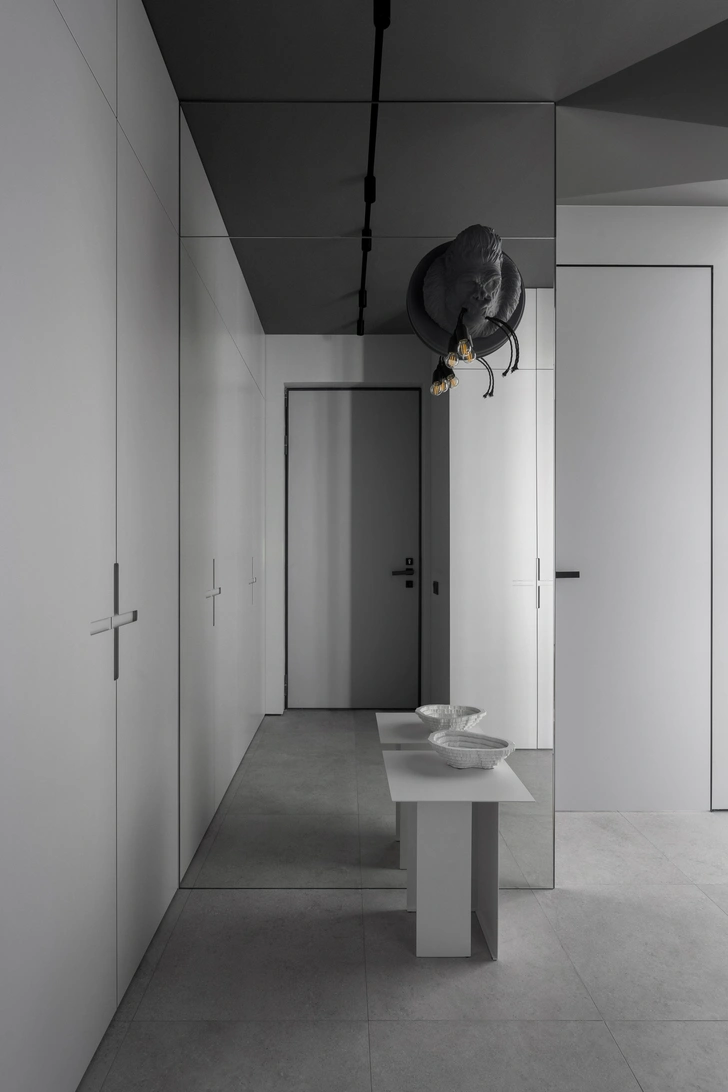 Прихожую сделали чуть более темной, на контрасте с основными зонами. Это делает переход в светлое пространство более эффектным. А чтобы прихожая не выглядела слишком узкой, использовали зеркальные панно. Неожиданным акцентом здесь стало бра в виде головы орангутанга от бренда Karma.