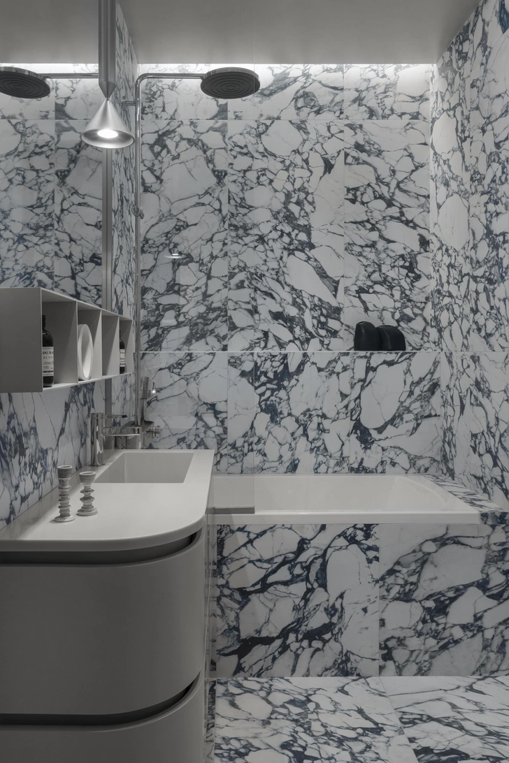 Моей любимой зоной в этом проекте стал санузел. Керамогранит с имитацией мрамора и насыщенными синими прожилками создает роскошный, изысканный вид, и при этом сочетается с общей серой гаммой интерьера. Этот контраст делает пространство особенно выразительным.