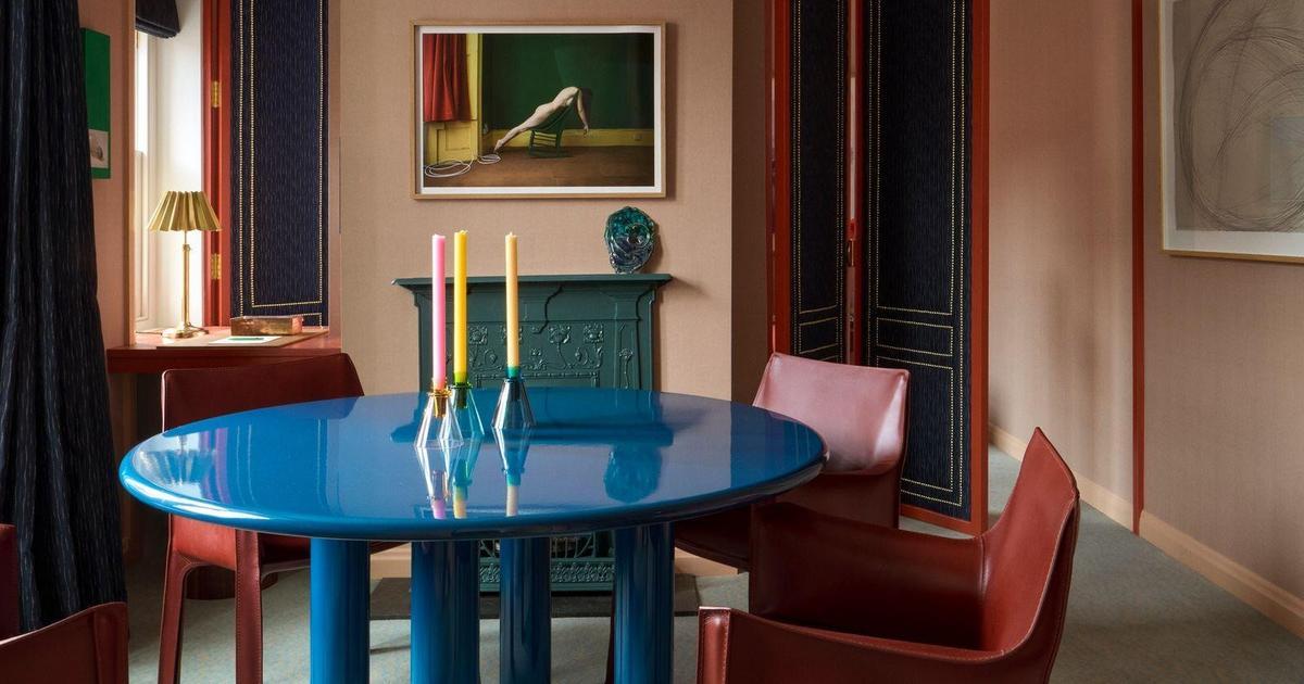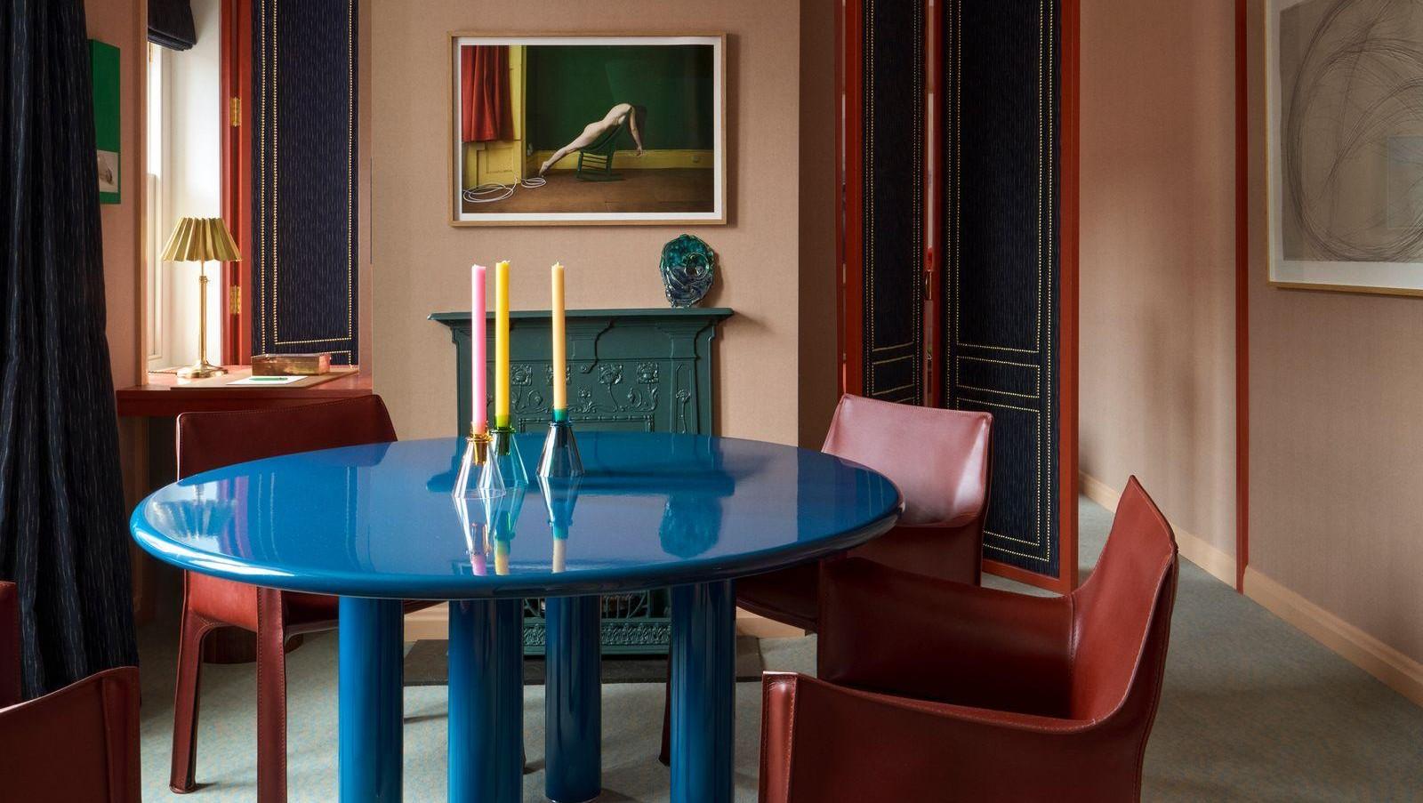 В центре столовой глянцевый синий стол Smalto, Knoll. Кресла Cab 413, дизайн Марио Беллини для Cassina. За камином находится гостиная, которую можно соединить с этим пространством, сложив двери.