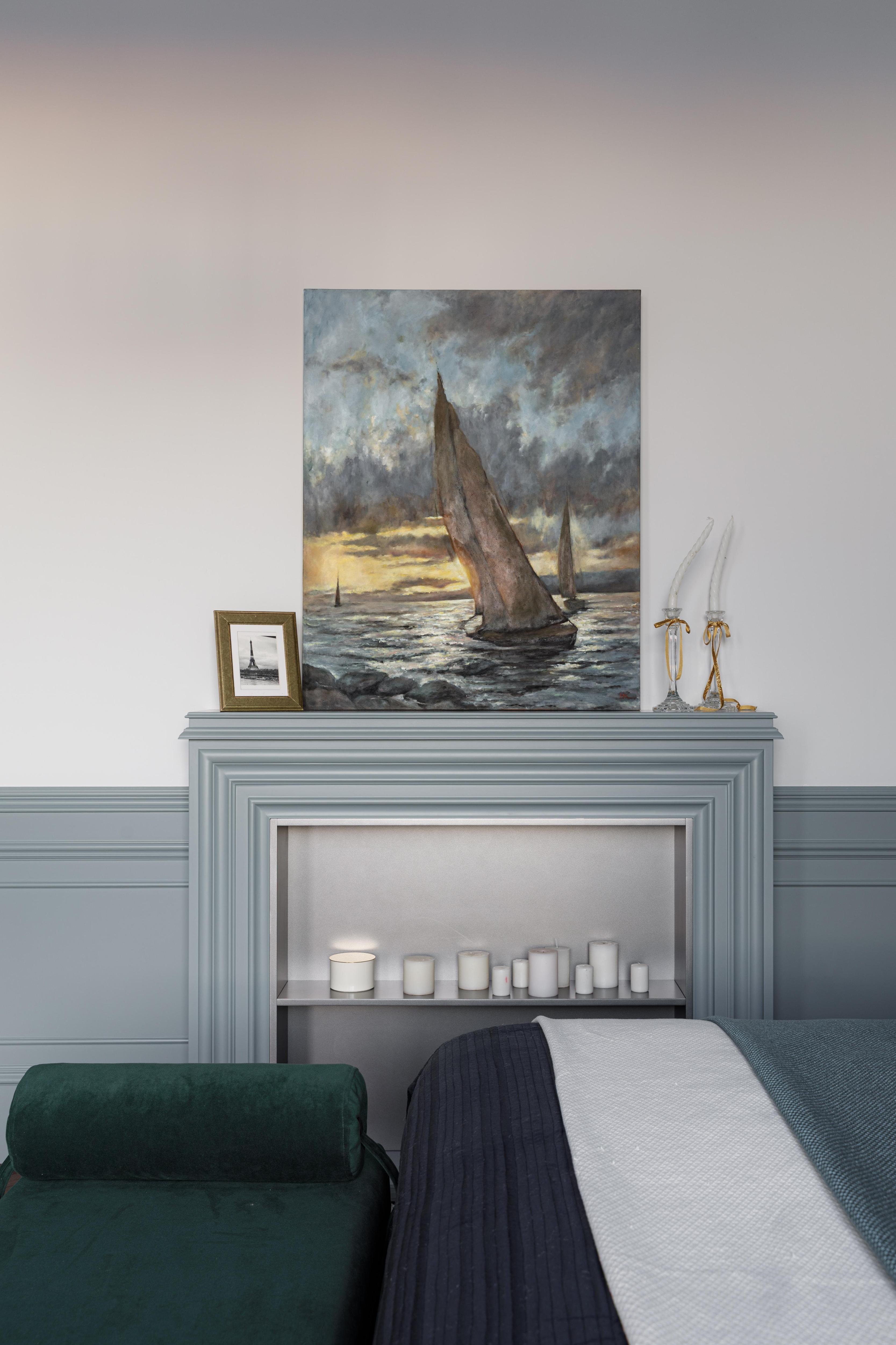 Из спальни открывается вид на побережье реки и на огромное, высокое небо. Чтобы дополнить эту прекрасную картину, мы добавили в интерьер цвет речной воды. Это легкое, безмятежное настроение поддерживает картина с парусом, она стала идеальным заключительным аккордом.