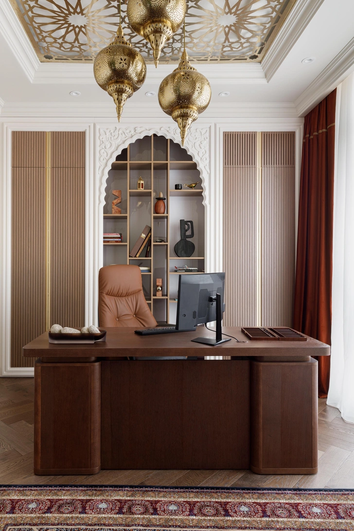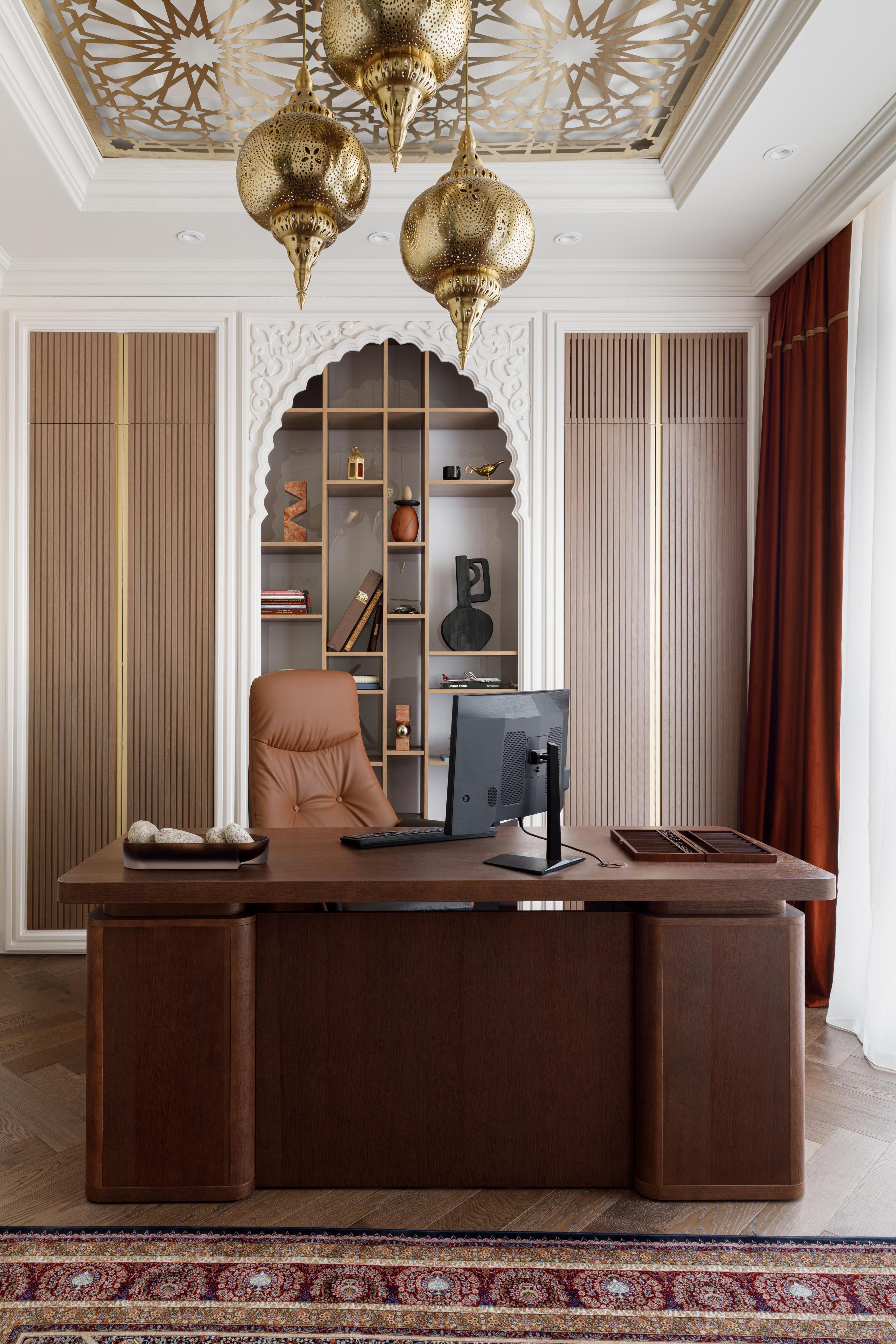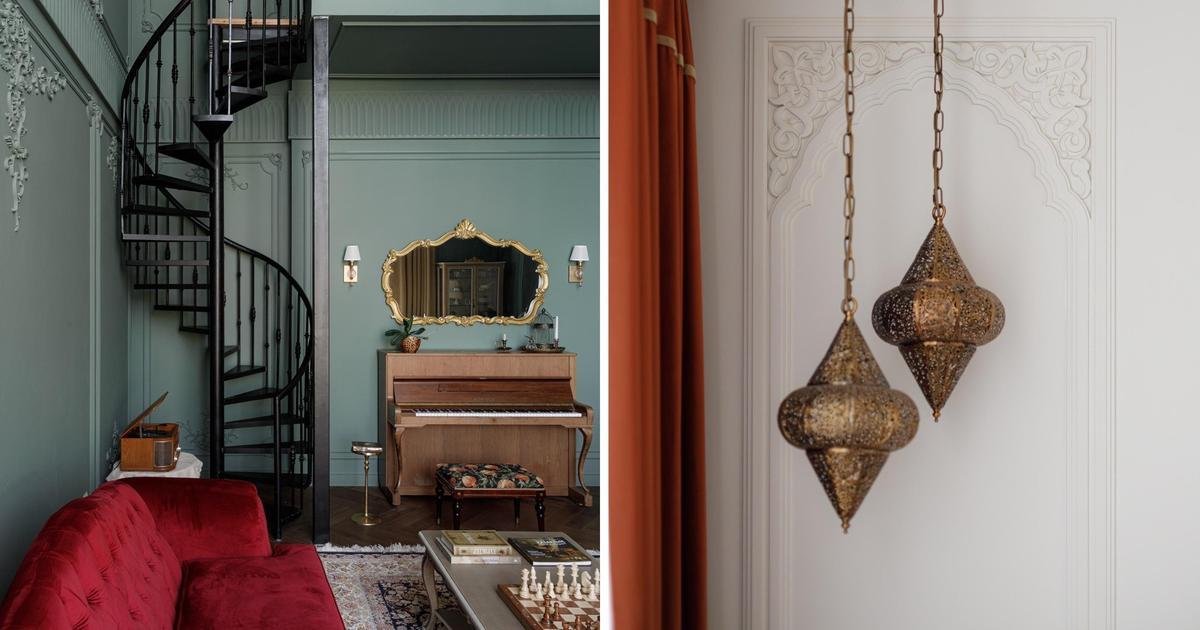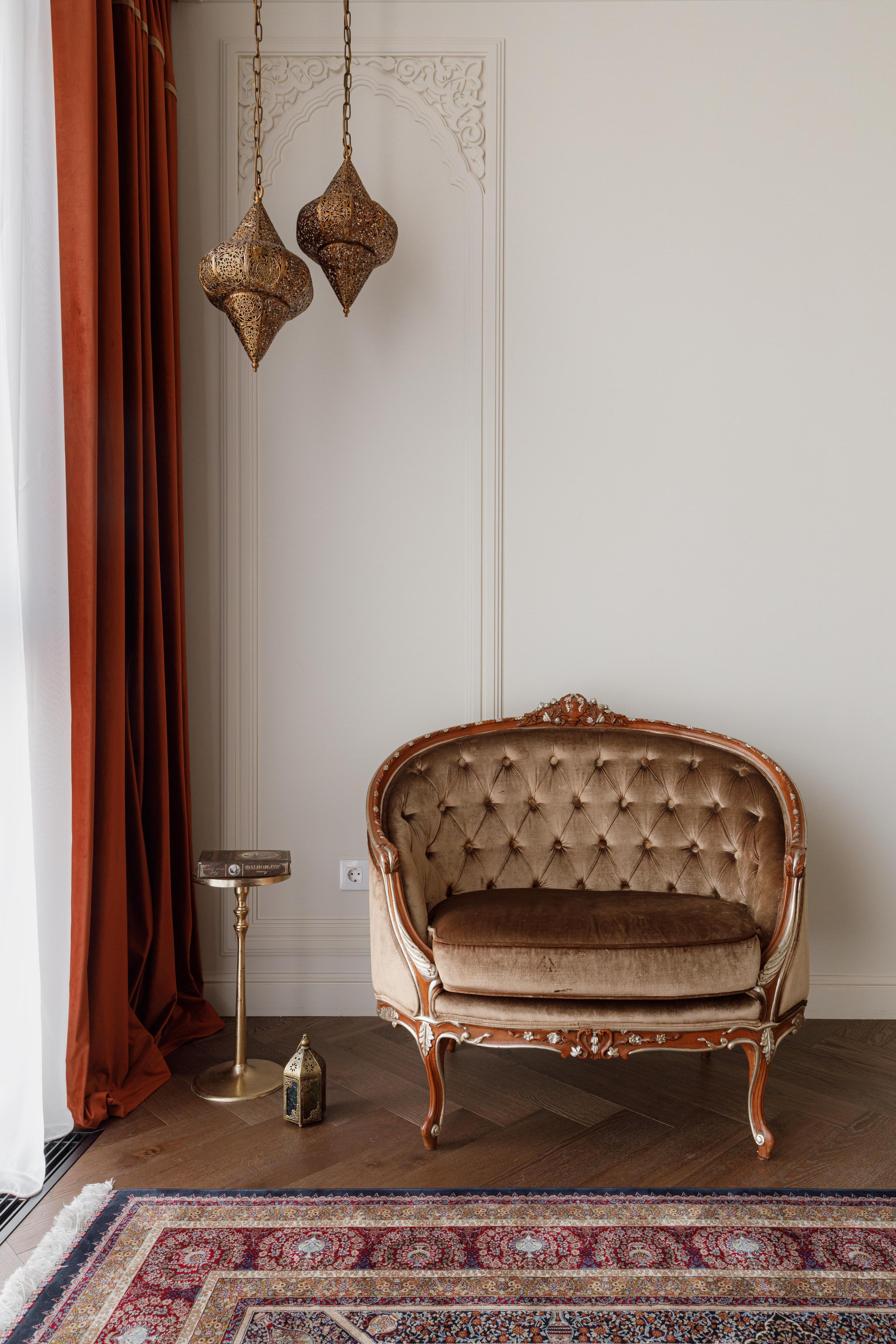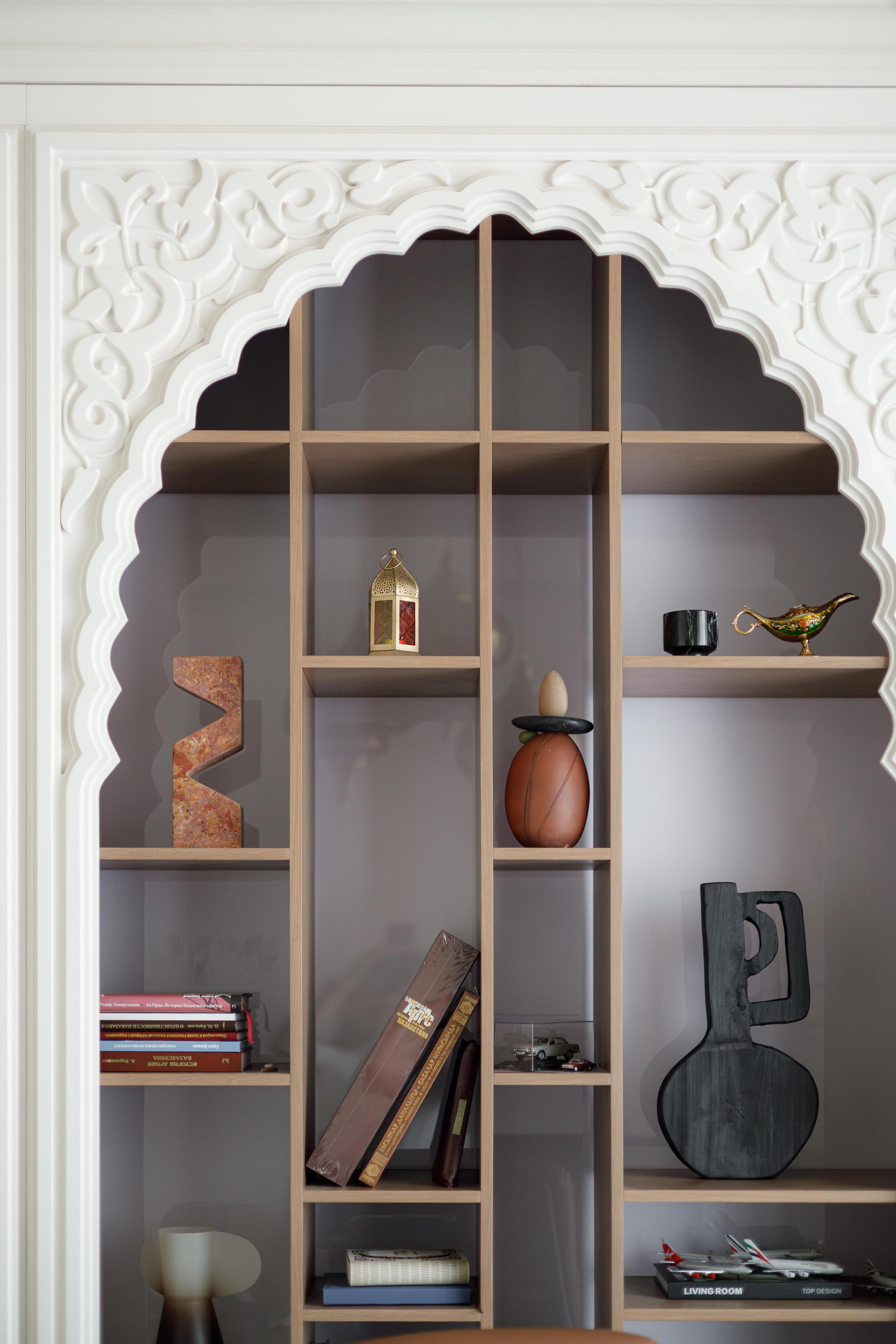 У каждого члена семьи были свои особенные пожелания, поэтому в одной квартире встретились несколько стилей и эпох. Заказчик, например, хотел личный кабинет в марокканском стиле — это было его единственным запросом, остальное он доверил жене. Казалось, что эта эстетика не совсем вписывается в общую концепцию квартиры, но все получилось органично. Дети последовали примеру отца и тоже решились на смелый шаг — они захотели оформить свою общую комнату в современном стиле, с яркими неоновыми граффити. Интересный дизайнерский вызов, учитывая, что все остальные помещения объединяет классическая стилистика.