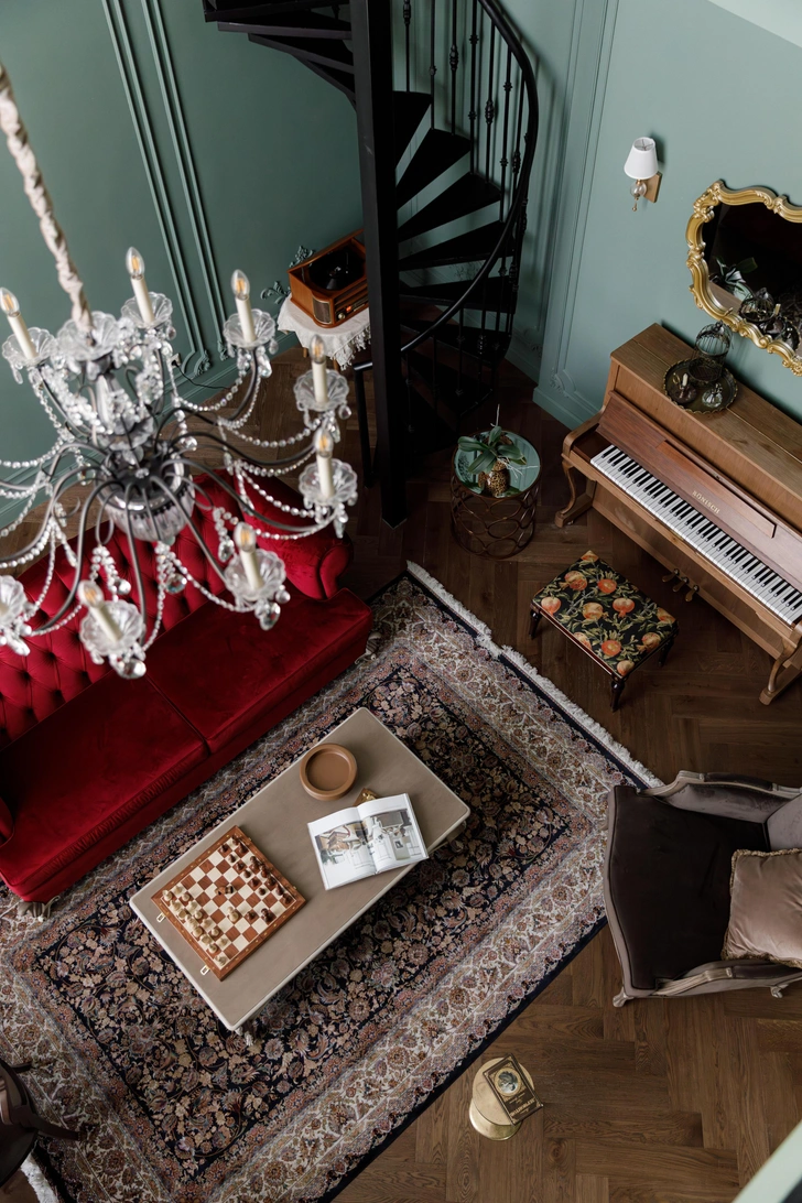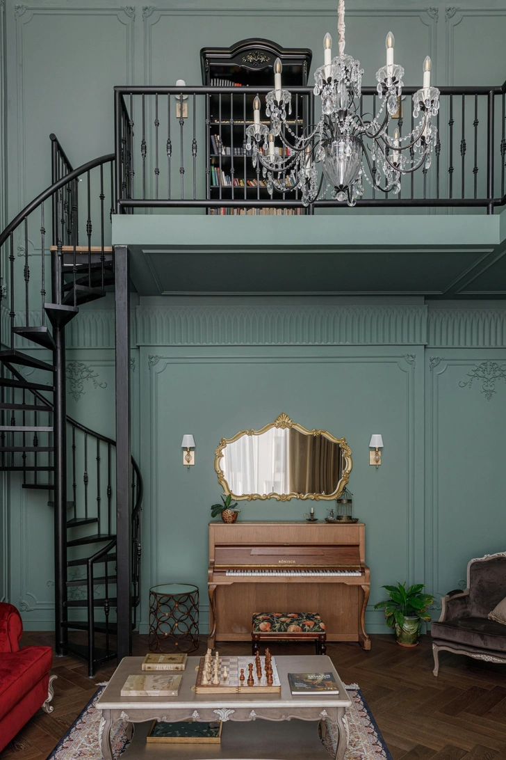 Настоящей семейной реликвией стало и винтажное пианино — оно украшает гостиную. Главная комната очень высокая, целых семь метров, и мы добавили второй уровень, где организовали семейную библиотеку. К ней ведет черная винтовая лестница — выглядит очень эффектно. Она стала одним из главных акцентов.