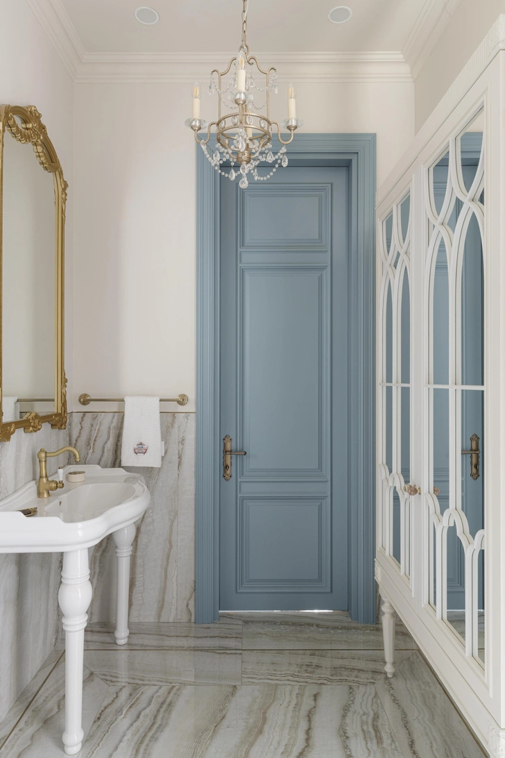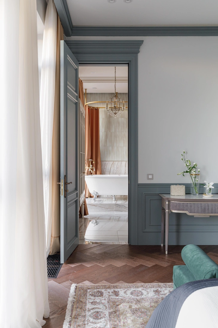 Заказчики — большая семья с четырьмя детьми. Они хотели создать атмосферу благородного европейского дома с историей, но без музейности, без помпезности. Я соединила элементы классики — молдинги, лепнину, хрустальные люстры, отдельно стоящую ванну — с более спокойной, современной подачей. Пространство получилось немного театральным, но очень теплым. Это интерьер для людей, которые ценят эстетику, детали и естественность.