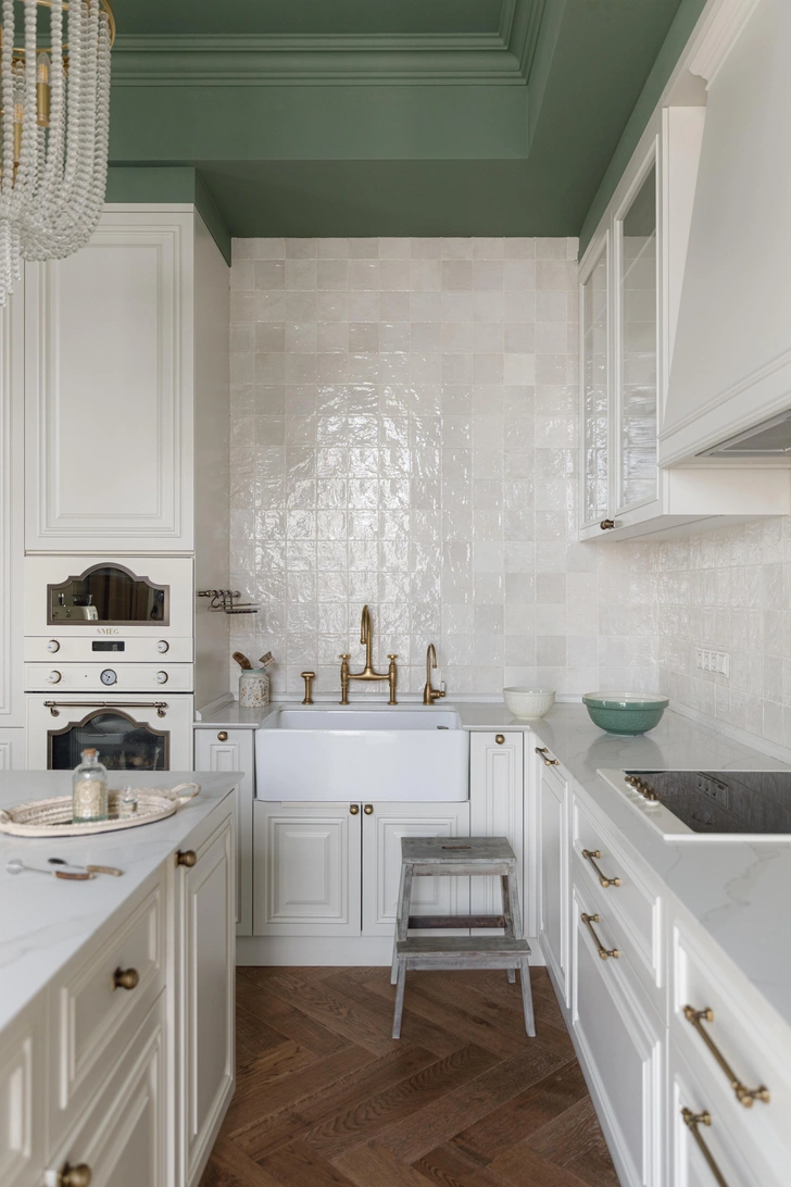 Хозяйку дома всегда манили европейские блошиные рынки, антикварные лавки, детали с историей, предметы со следами времени — все это она собрала в своем новом жилье. С ее коллекцией мы срифмовали выразительные детали: керамическая мойка, винтажные смесители, мебельные ручки, мелкая плитка и керамическая посуда.