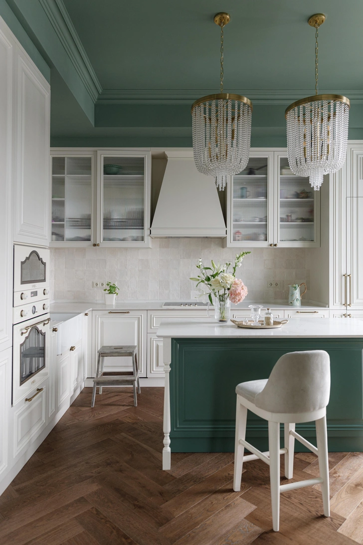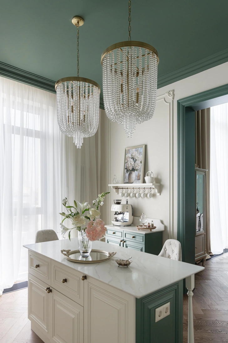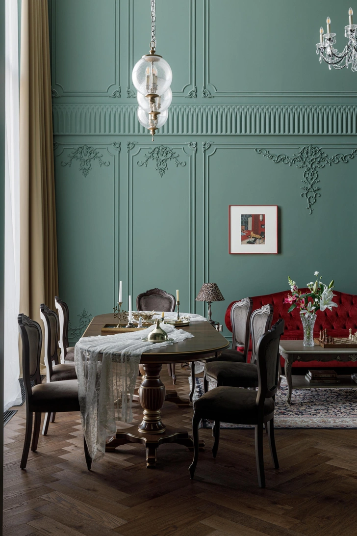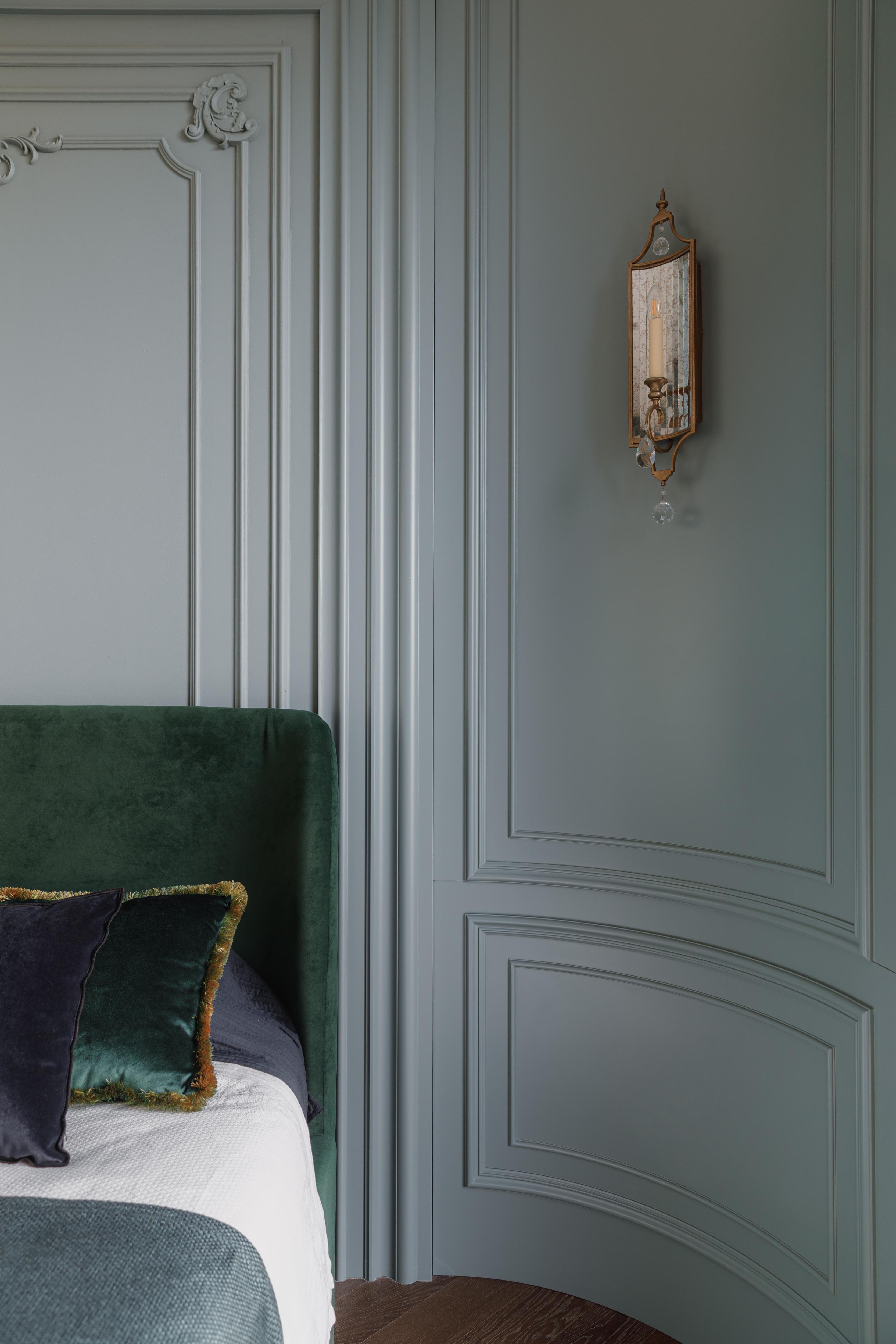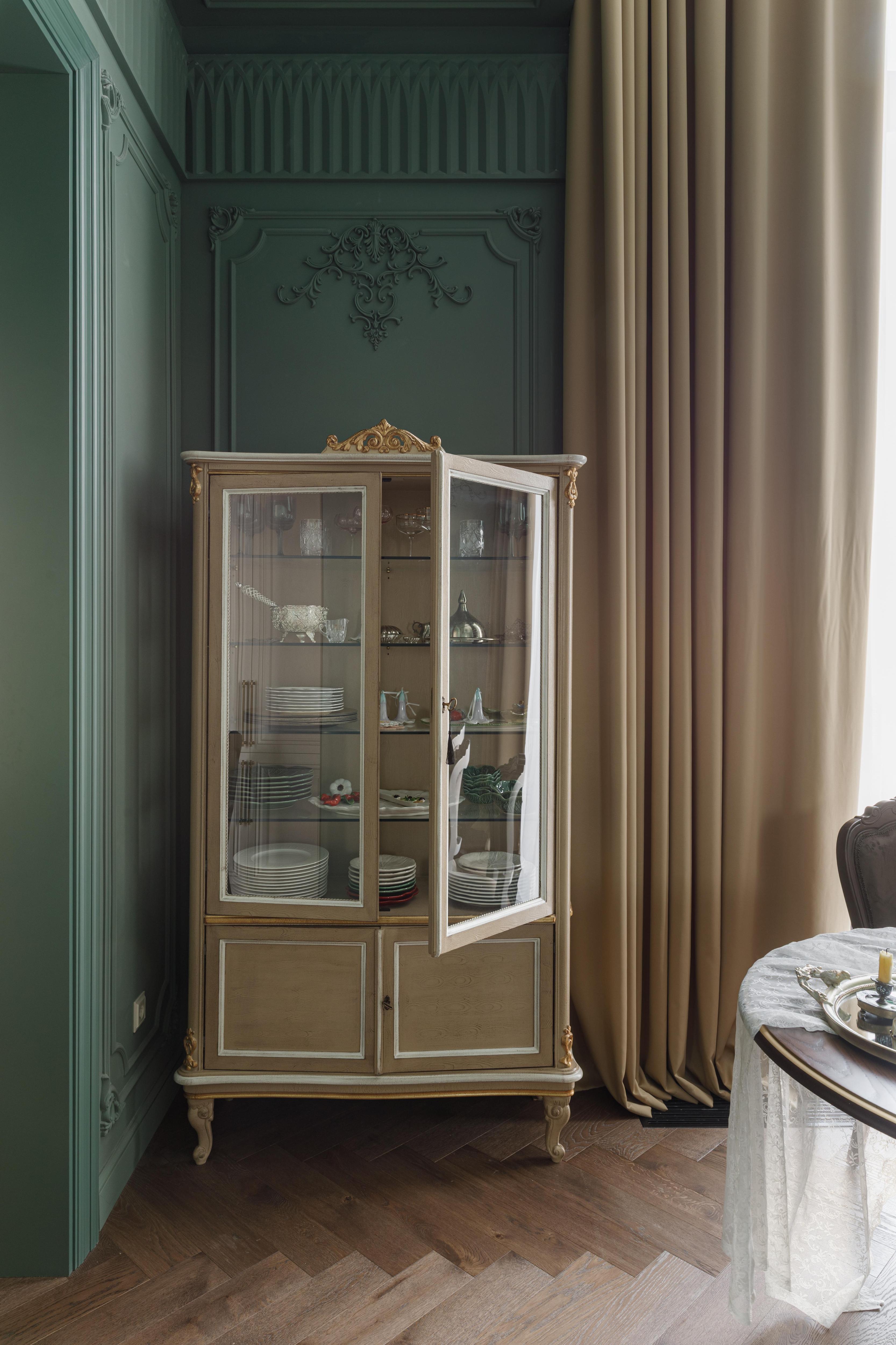 Главным инструментом стал цвет: зеленый придает интерьеру особую глубину, он выступает объединяющим акцентом. Мы долго не могли его найти и согласовать подходящий оттенок, но в один прекрасный день заказчица пришла на встречу в дубленке удивительно красивого, глубокого зеленого цвета. Мы буквально поймали его! Все-таки самый точный цвет — тот, с которым заказчик давно, который человеку действительно идет.