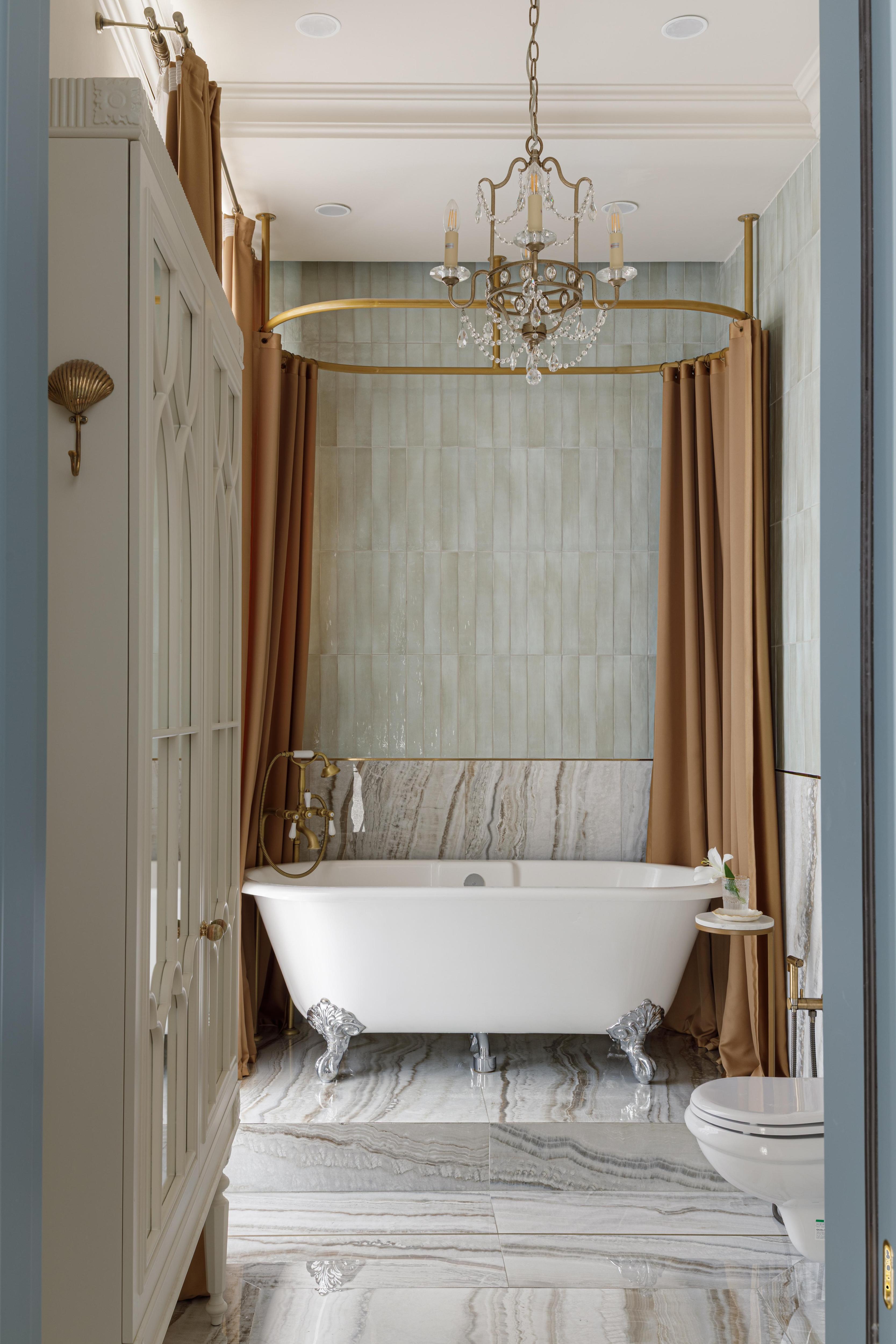 Настоящей жемчужиной стала ванна при спальне — здесь много света и воздуха. Мы расположили отдельно стоящую ванну у окна, добавили элегантную драпировку и украсили комнату зеркалами. Теперь это любимое место нашей заказчицы!
