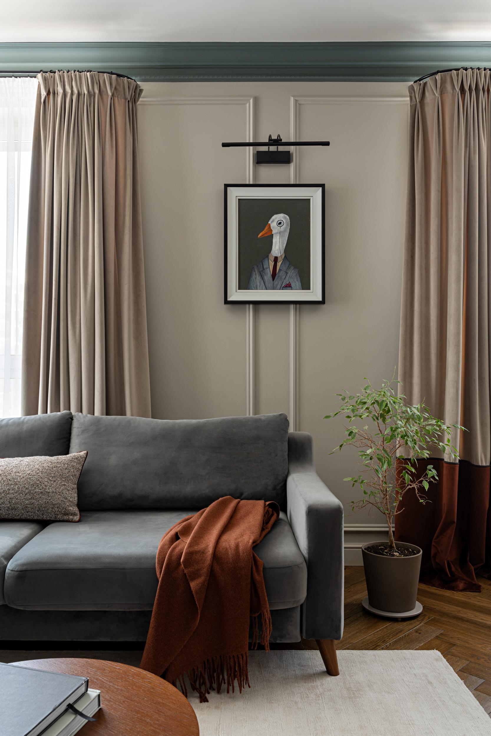 Здесь много интересных деталей. Вот, например, картина с гусем Иннокентием в гостиной. Мы купили его не сразу, долго откладывали поиски. И вот однажды одна моя знакомая художница Рузалия Габбасова написала мне с просьбой посоветовать что-то для ее квартиры. Тогда я заметила этого гуся в дальнем углу комнаты среди других работ. Уже на следующий день картина ехала на примерку к моим заказчикам! Почему Иннокентий — не знаю, назвала его так сразу, и прижилось. Полотно небольшое, поэтому мы его визуально увеличили багетом. Так он и поселился в нашем «сказочном лесу». Вторую картину я написала сама, она называется «В гармонии». Именно такой и была работа над этим проектом.