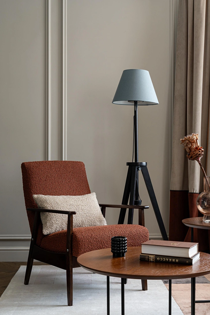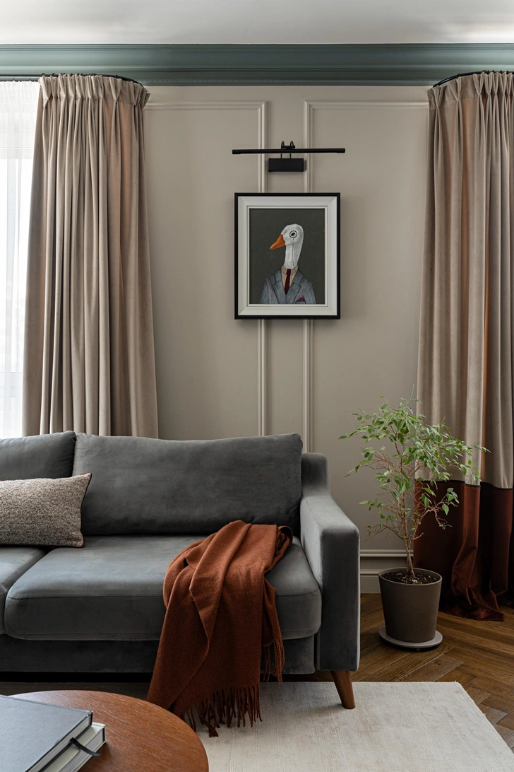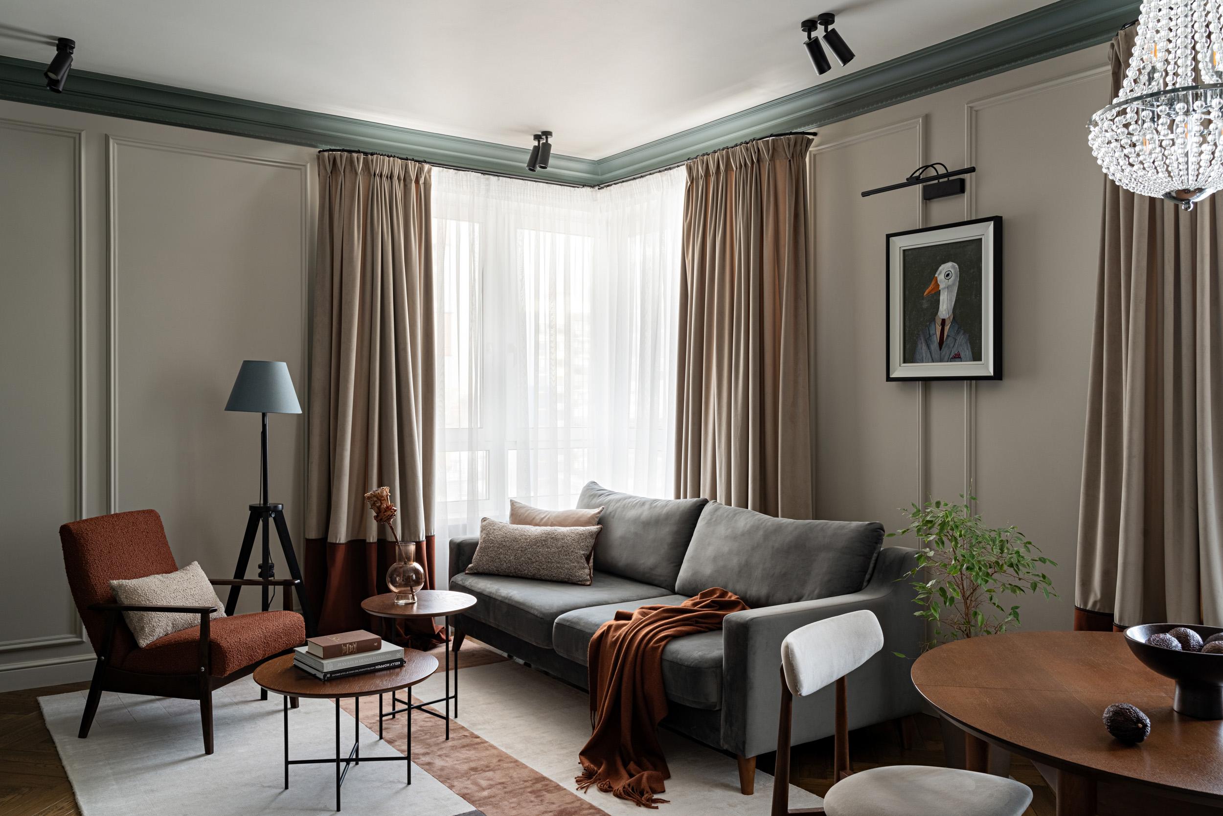 Шторы — наша особая любовь. Мягкие полотна с красивыми защипами добавляют кухне-гостиной чуточку драматизма, а детали в виде контрастных кантов между двумя оттенками полотен добавляют динамики. Есть и вещи с историей: кресло в гостиной мы нашли случайно на даче у родителей моих заказчиков. Выглядело оно плачевно: реставратор сначала даже уговаривал его не восстанавливать. Но мы настояли, и результат получился отличный.
