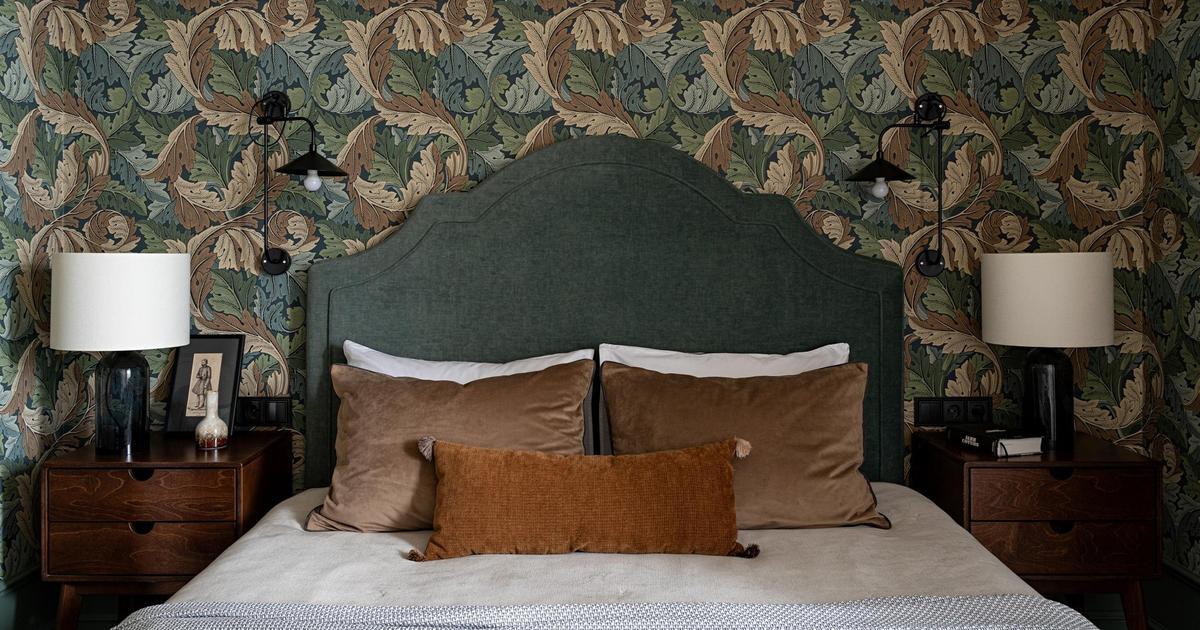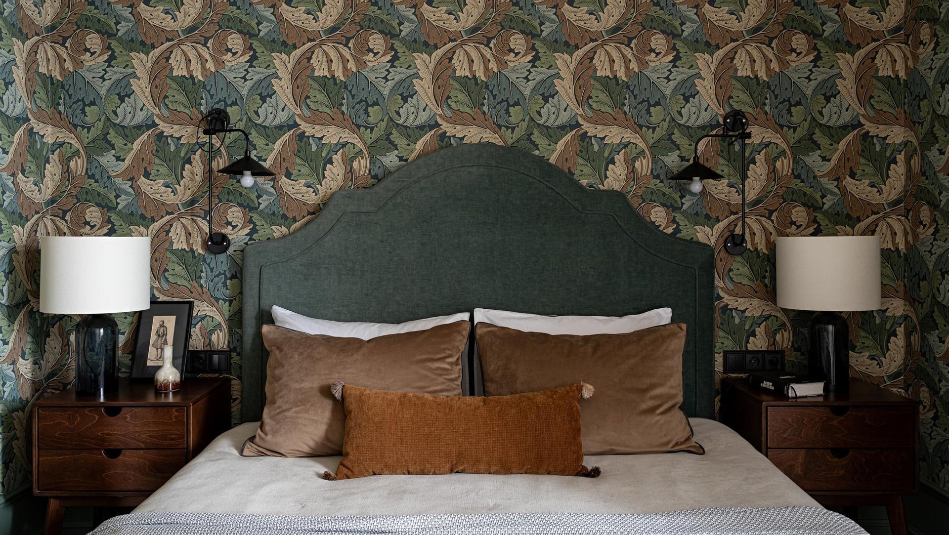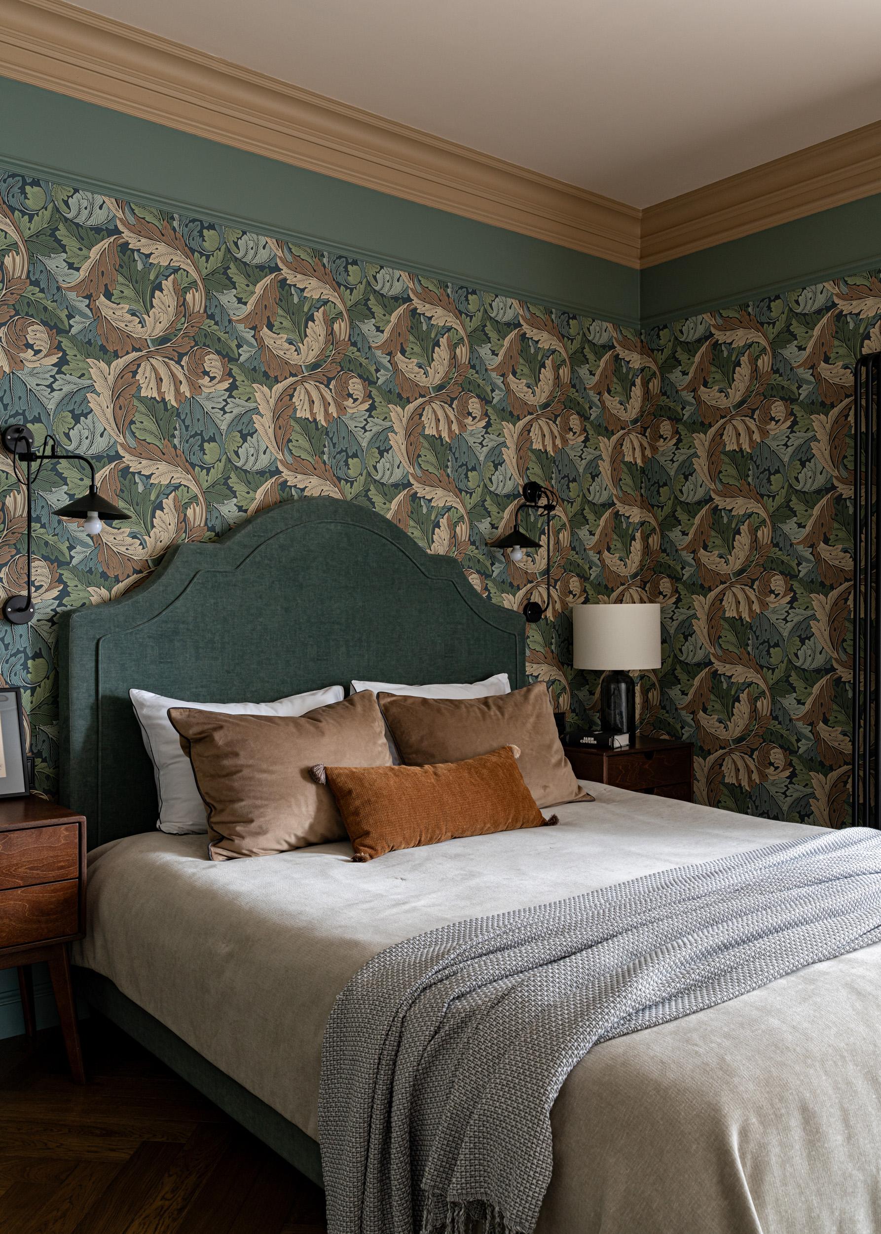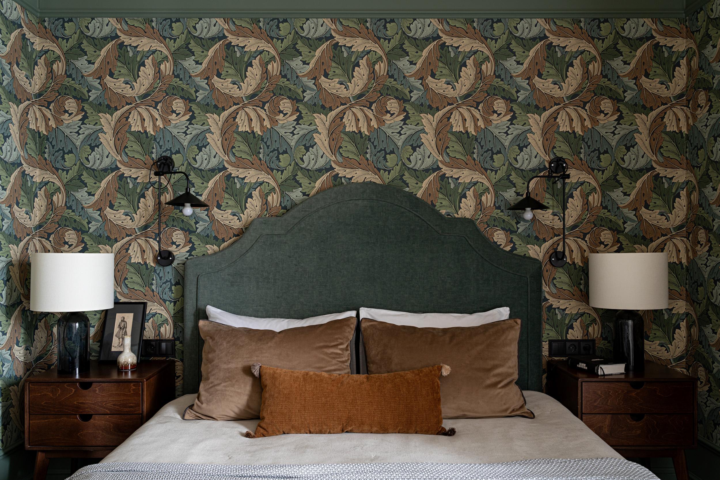 Обои, Morris & Co. Кровать, Shikana furniture factory. Тумбы, Skog Konstruktor. Лампы, Ikea. Текстиль, декоратор Динара Авхадиева.