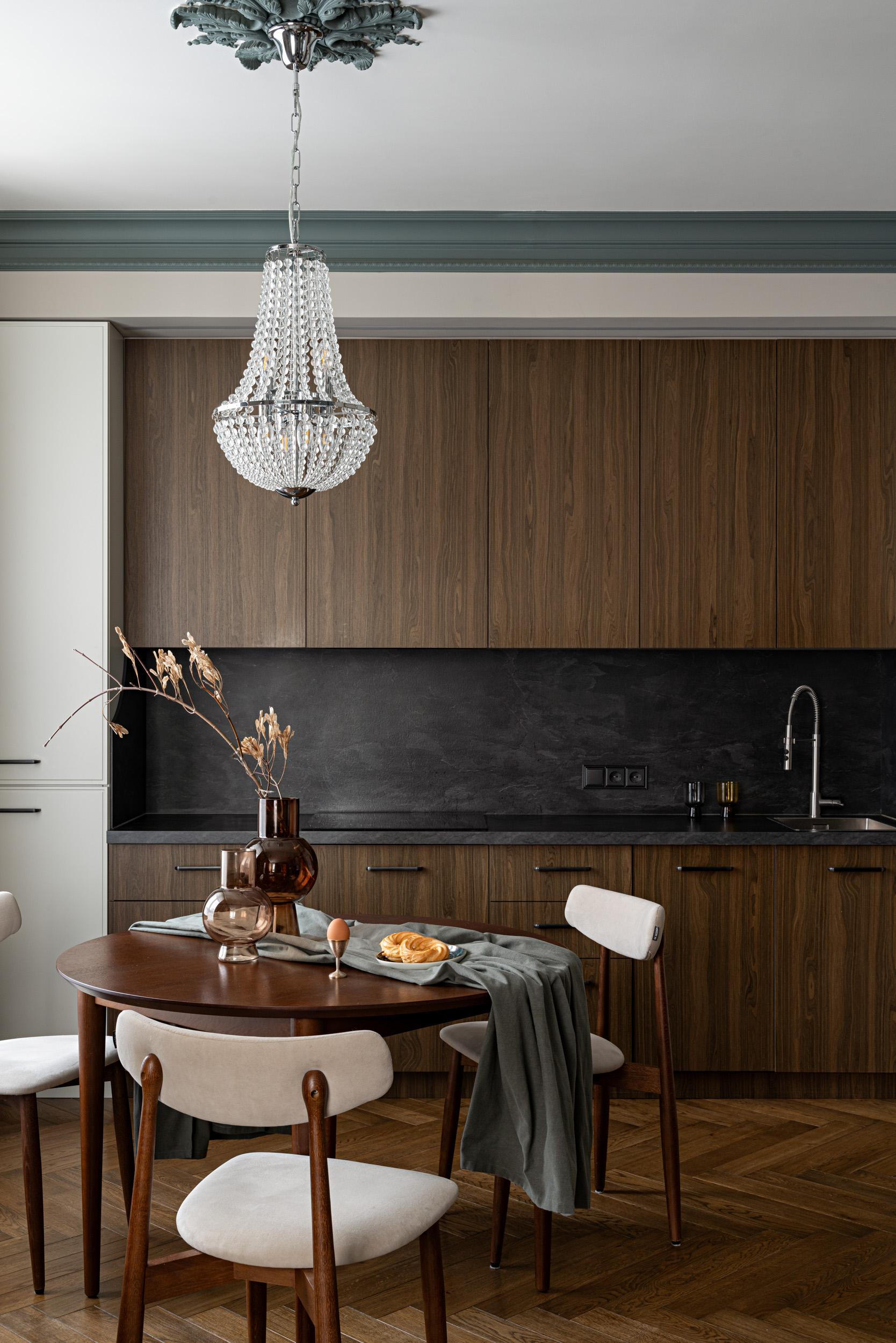 А еще посмотрите на гипсовую розетку люстры, на ее серо-голубой цвет. Рабочие боялись ее красить после монтажа, так что заказчица сделала это сама тонкой кистью. Здорово, что нам не пришлось отказываться от этой идеи — она отлично сочетается с романтичной люстрой и контрастирует со строгими шпонированными фасадами кухни.