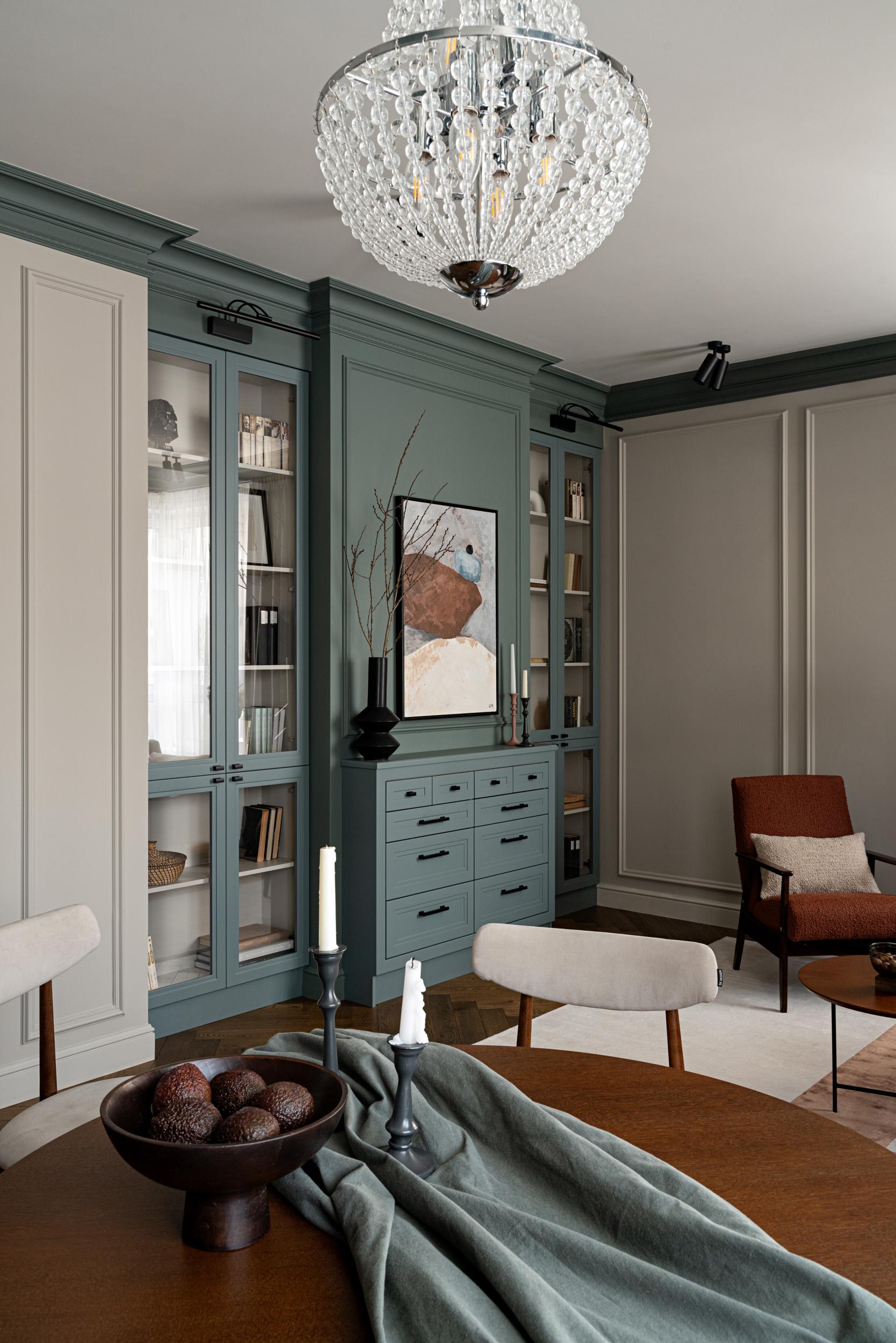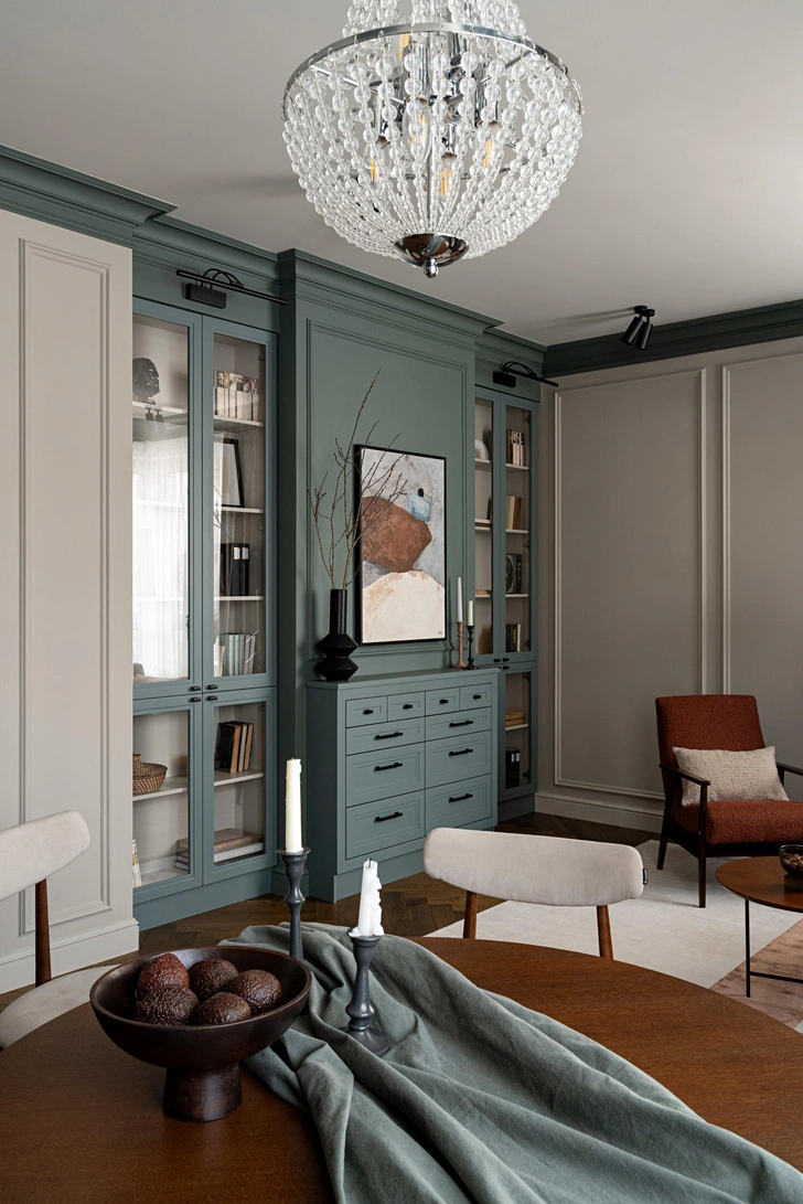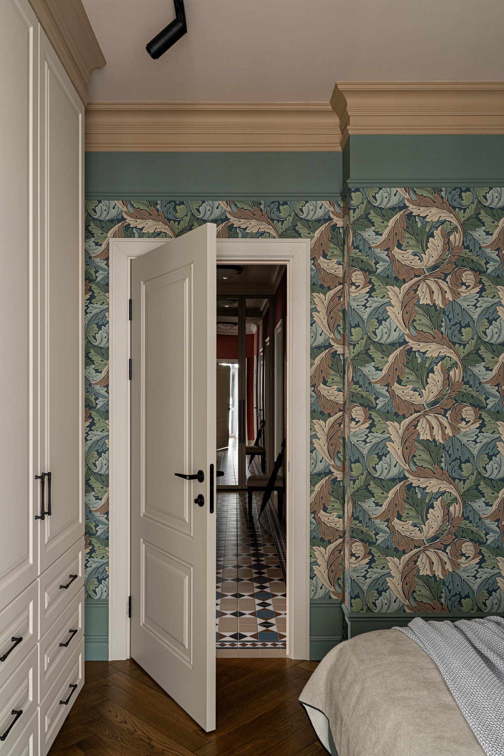 Мы хотели добавить элементы английского стиля, но мы отдавали себе отчет в том, что имеем дело с небольшой квартирой в новостройке с относительно невысокими потолками 2,7 м. В качестве основных акцентов мы использовали премиальные материалы и недорогие, но хитрые приемы, позволяющие разумно сэкономить. Работать мы начали в конце 2020 года, а закончили только в 2024 — это было связано с ограниченным бюджетом, но заказчики верно шли к своей цели. Благодаря этому мы не отступили от идеи практически ни на шаг, не отказались от отрясающего дубового паркета английской елки, мраморной столешницы в ванной, роскошных обоев с историческим принтом и потрясающих оттенков стен из палитры Little Green.