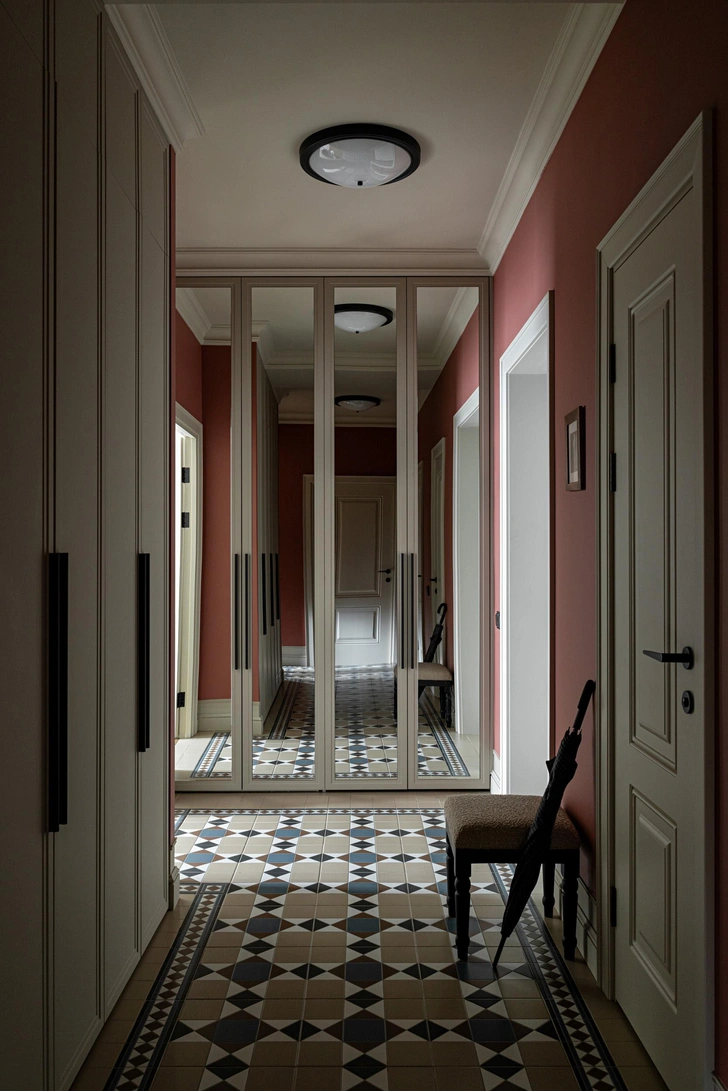 Этот проект я назвала «Сказочный лес» — здесь много зеленого, ягод, растительных мотивов и сказочных обитателей. Цветовая палитра собрала в себе множество оттенков, от насыщенного терракотового до приглушенного серо-синего. В каждом помещении доминирует свой цвет, но при этом пространство выглядит единым целым. Цвета не спорят, а скорее наоборот, подчеркивают и дополняют друг друга. Мне очень повезло с заказчиками — они не боялись цвета и моих довольно смелых предложений. Вопреки распространенному стереотипу о том, что в небольших помещениях темные цвета нежелательны, нам удалось создать расслабляющий, камерный, «обнимающий» интерьер как раз при помощи темных акцентов.