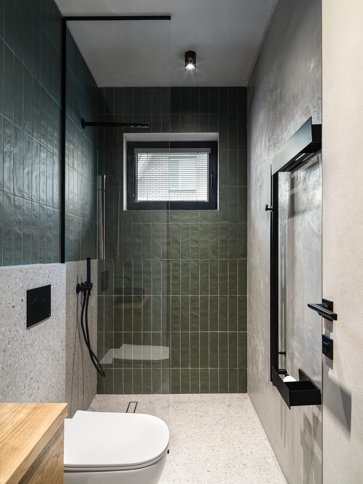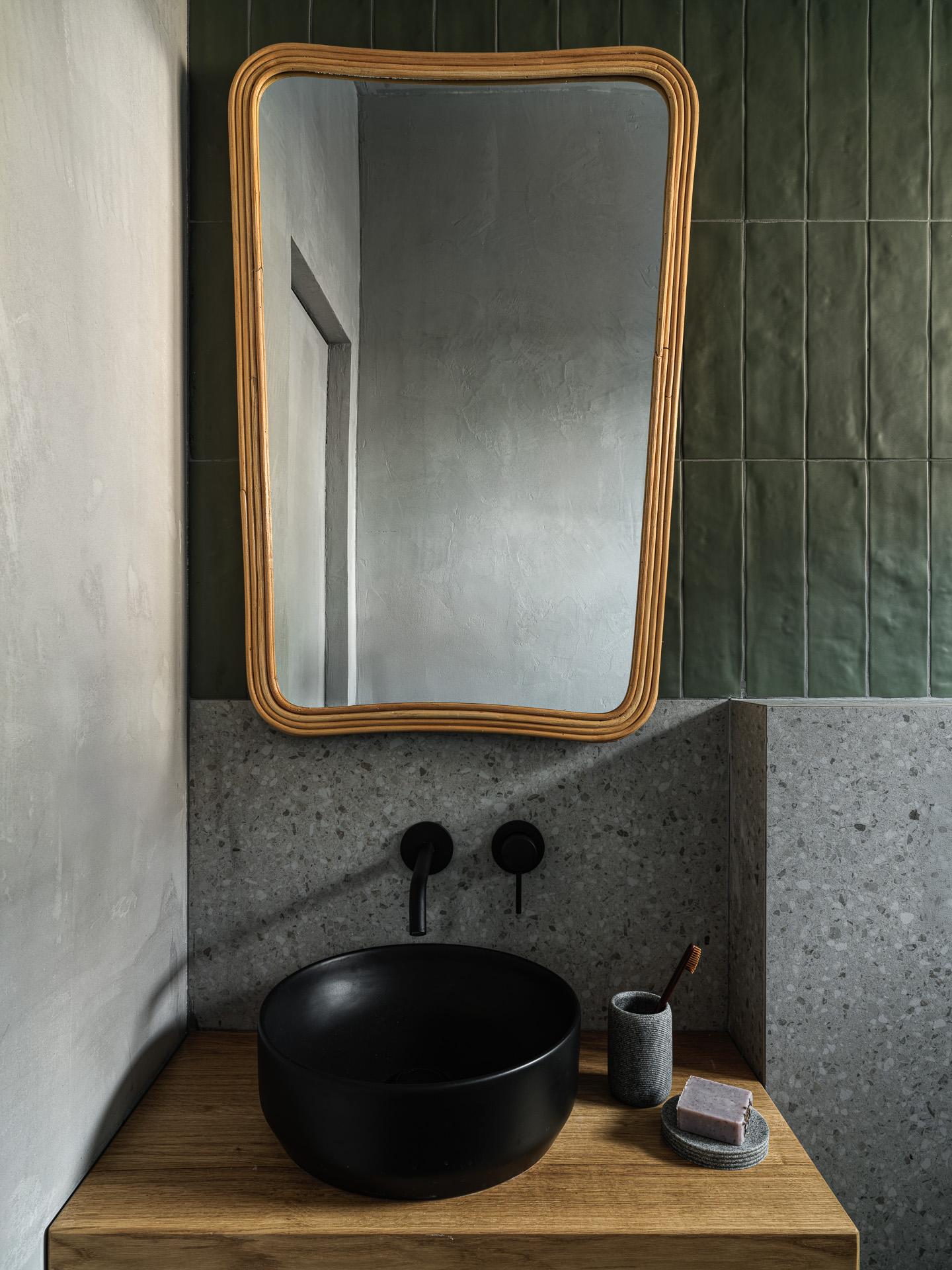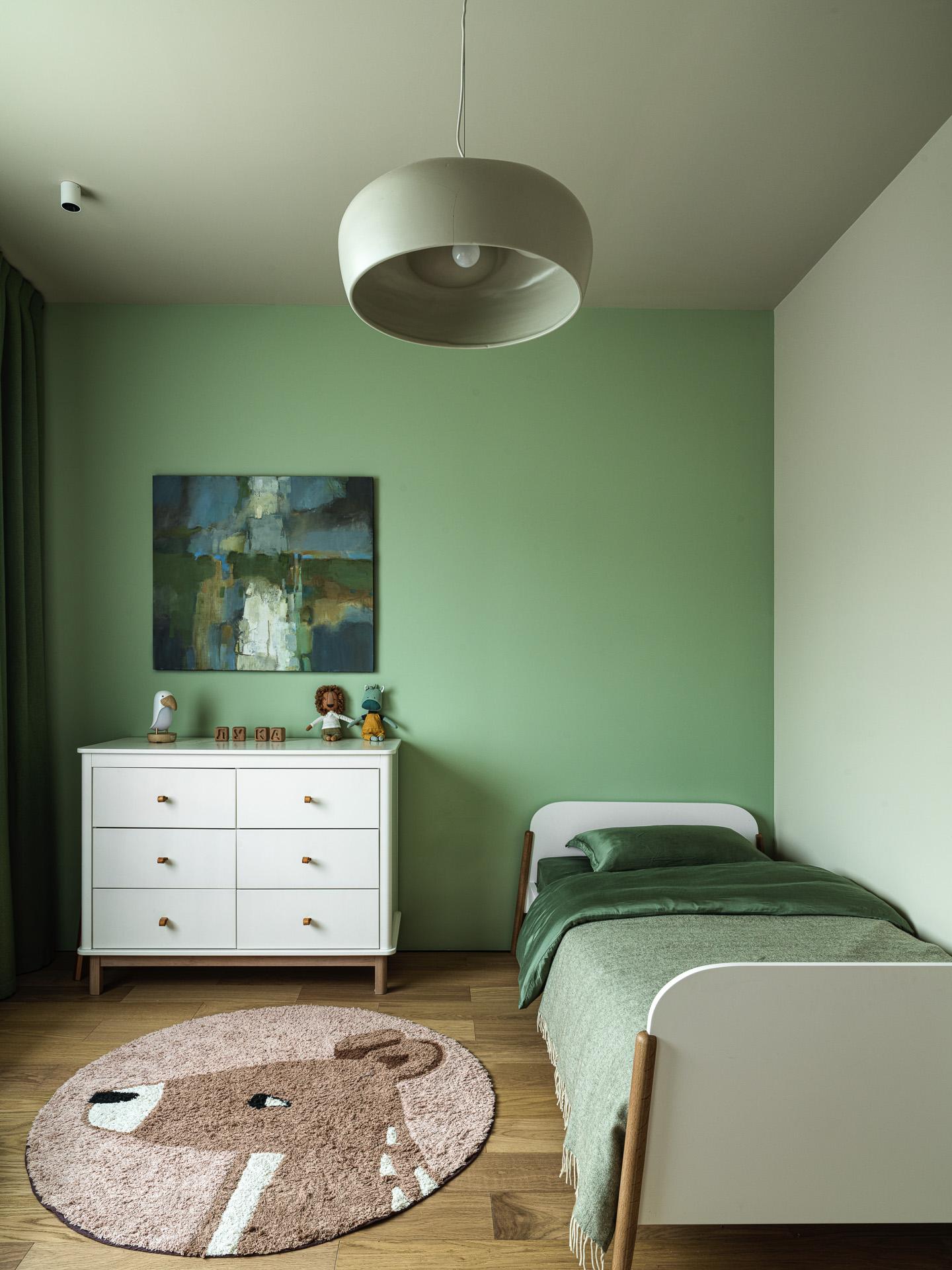 Хотя весь дом оформлен примерно в единой гамме, есть пара отличающихся зон. В детской — спокойный зеленый цвет в разных оттенках: от туманно-зеленого до глубокого изумрудного. Потолок, одна из стен и светильник здесь одного цвета, что делает комнату целостной. Так, детская выделяется, но не выбивается по стилю из общей «природной» атмосферы — все благодаря тому, что нигде нет «кричащих» оттенков. В похожей гамме оформлен и санузел.