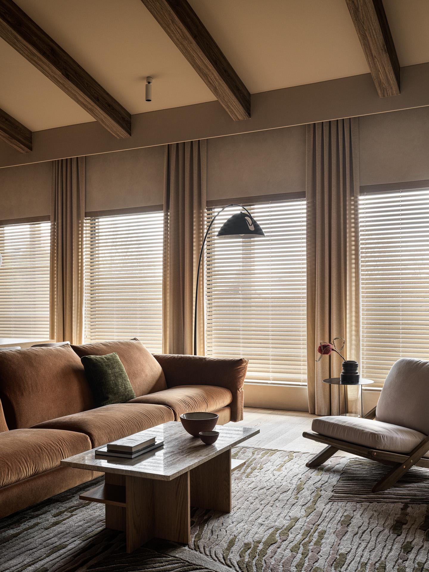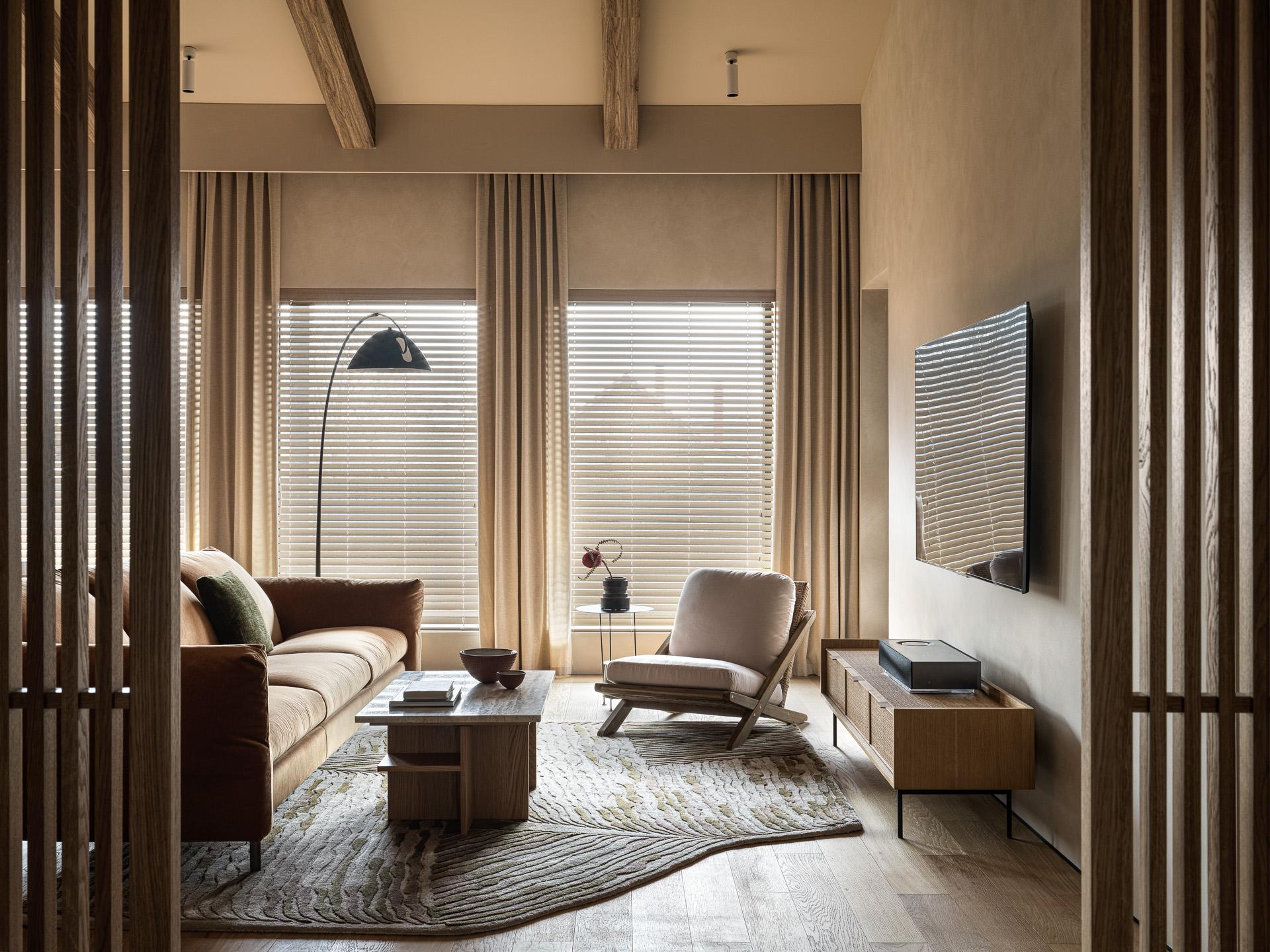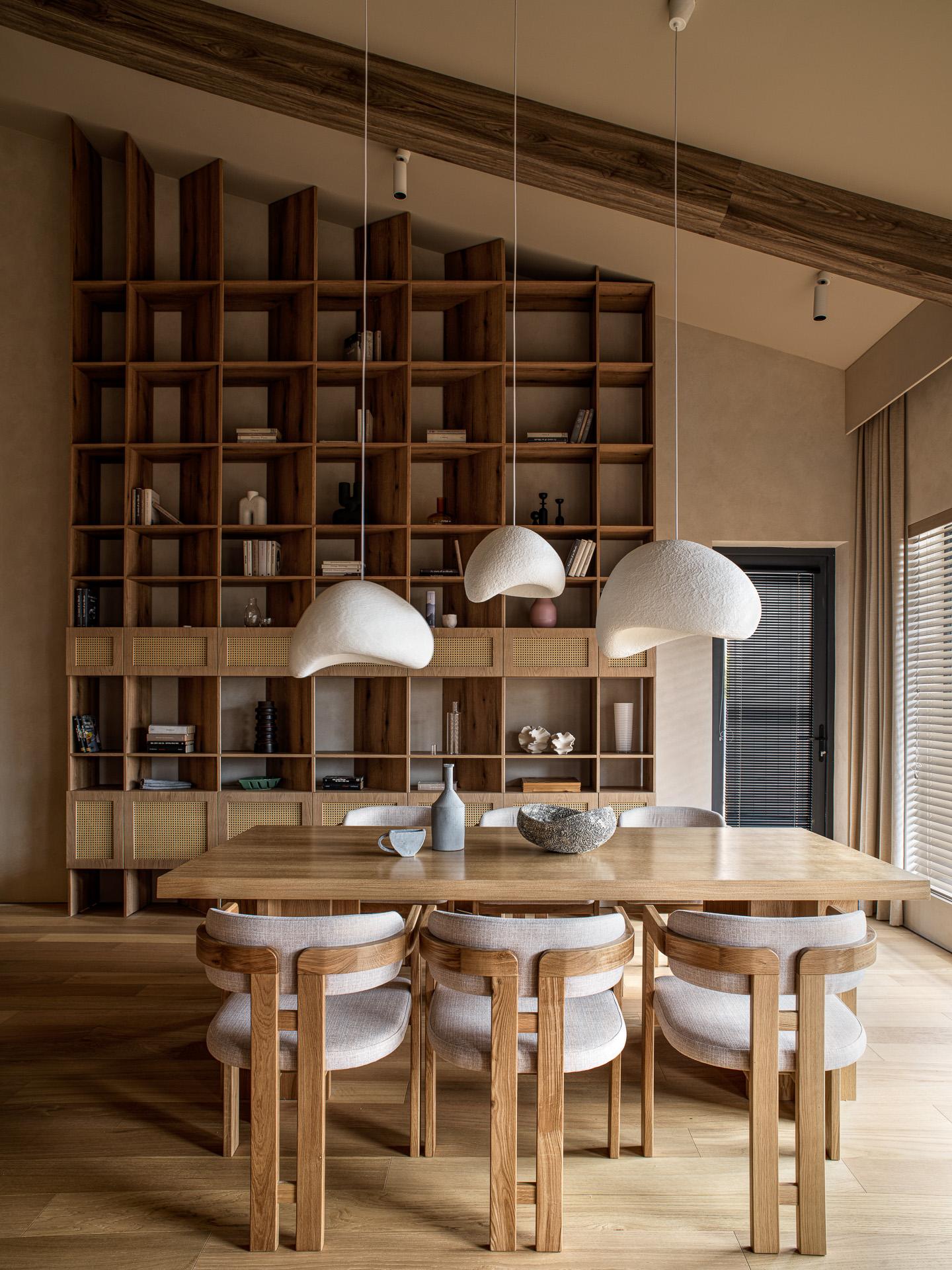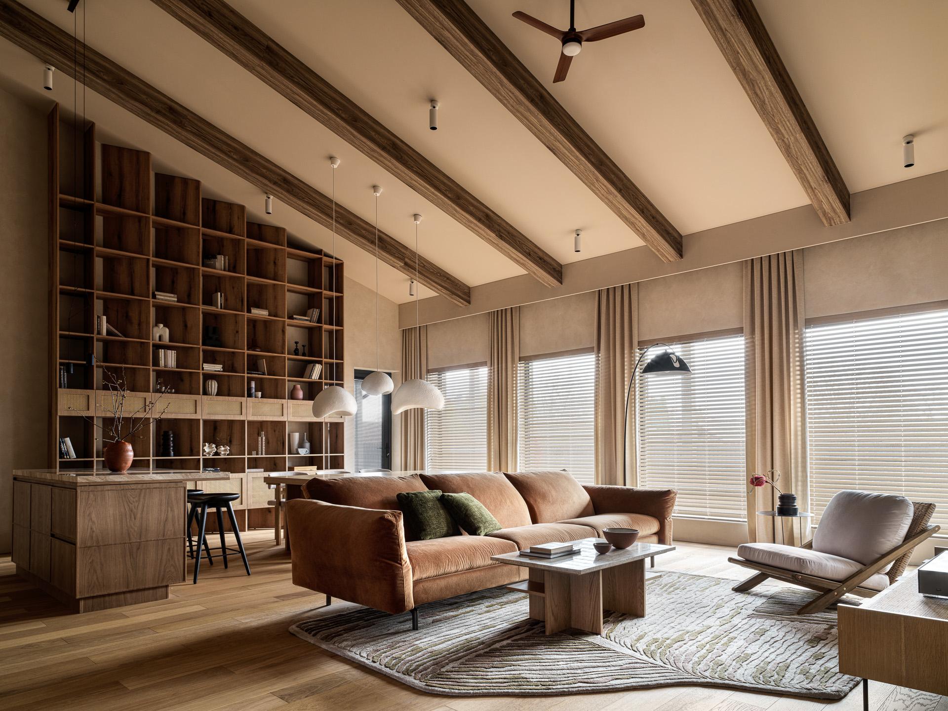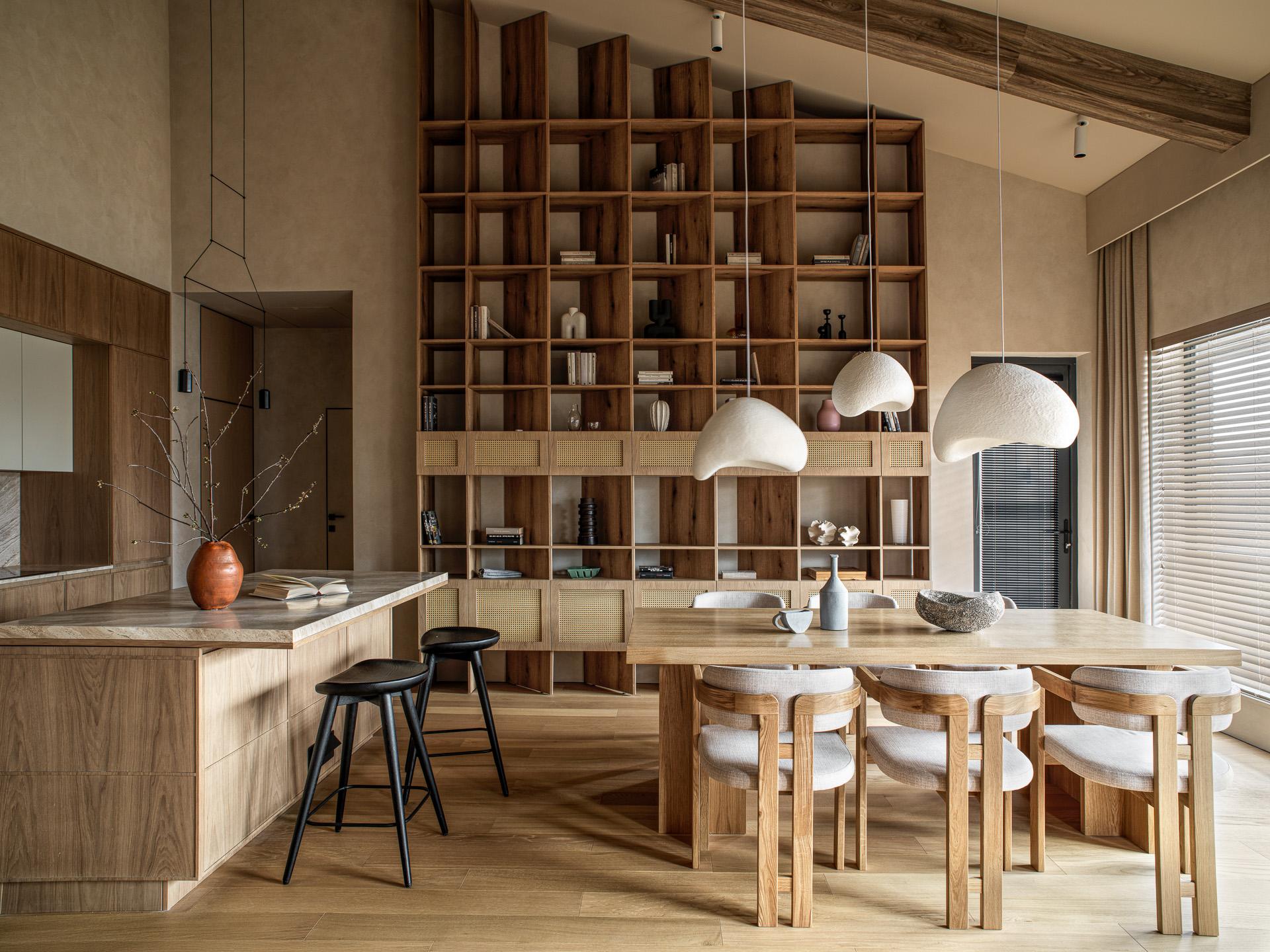 Главное украшение гостиной — это большой деревянный стеллаж во всю стену, задающий ритм пространству. Он делает его более камерным и уютным, уравновешивая его высоту.