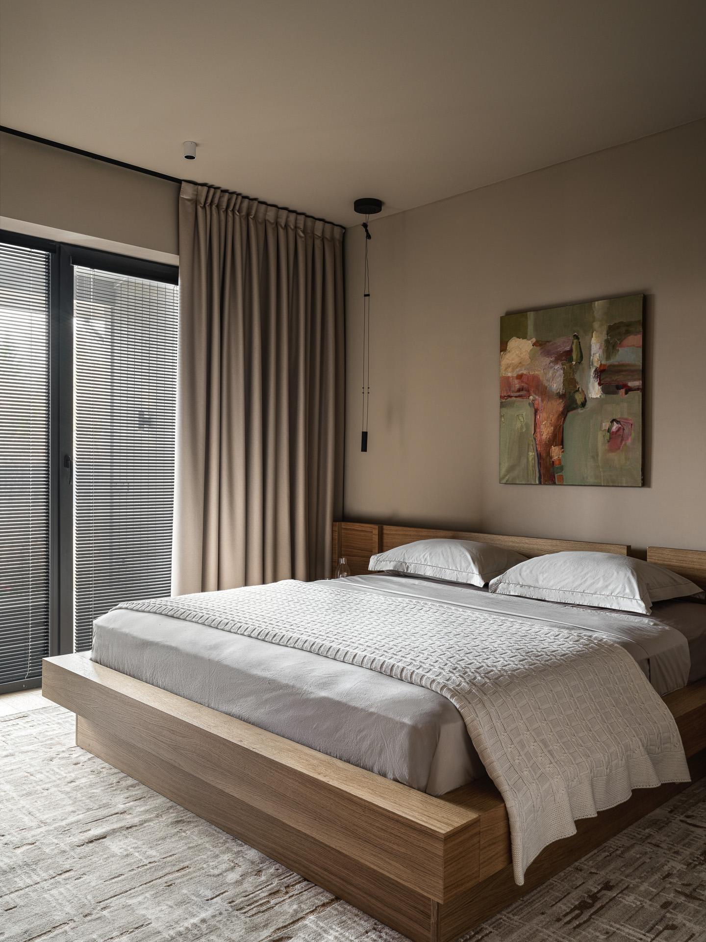В спальне потолок тоже выкрашен в цвет стен — это успокаивает и обволакивает. Хорошим акцентом стала картина над изголовьем со смелыми мазками и приятной гаммой.
