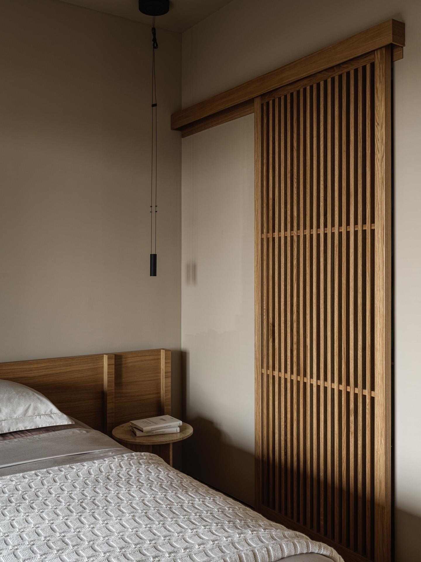 Гардеробная находится за реечными перегородками, которые тоже можно назвать акцентными.