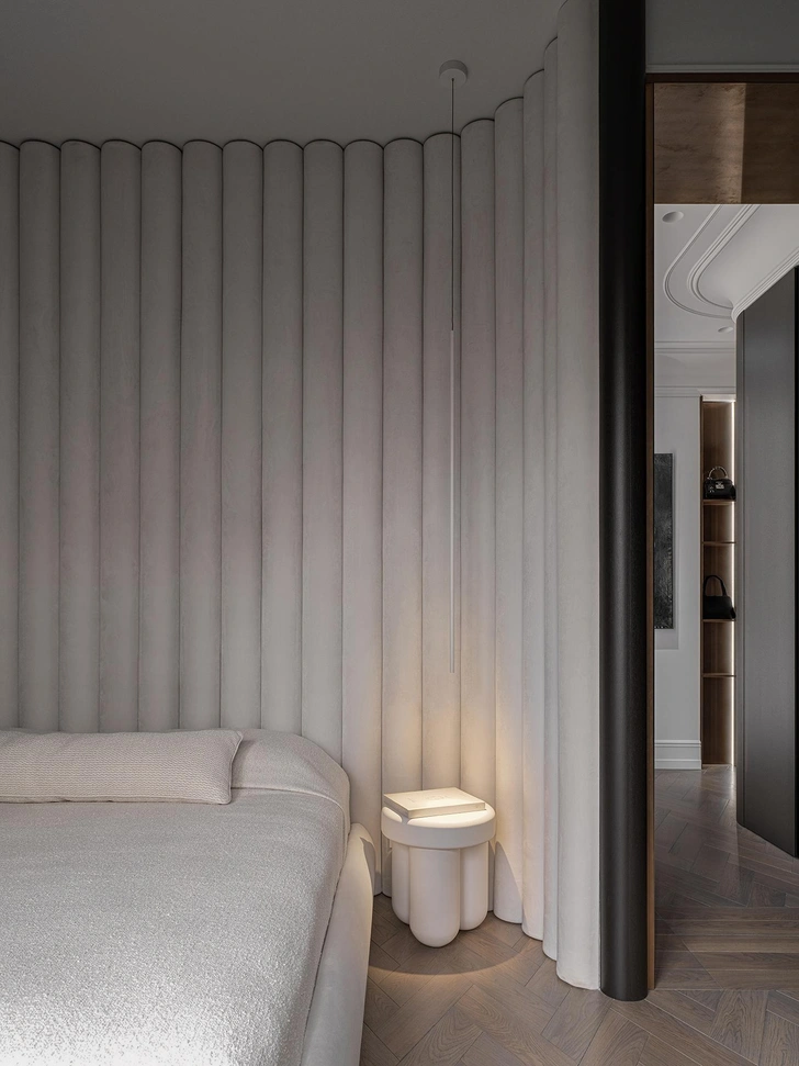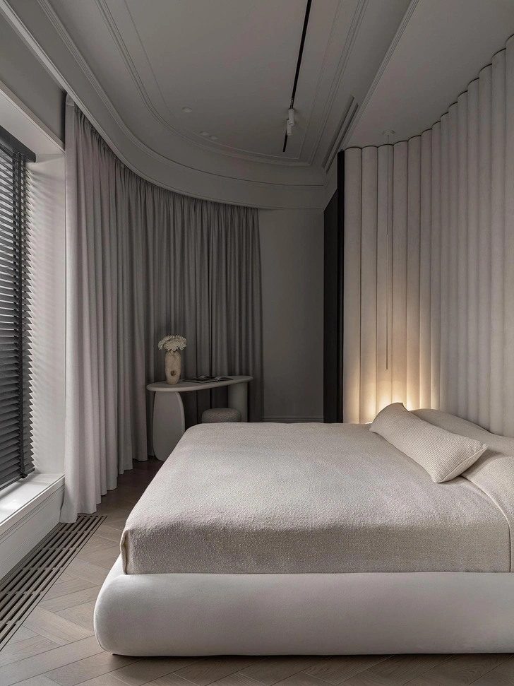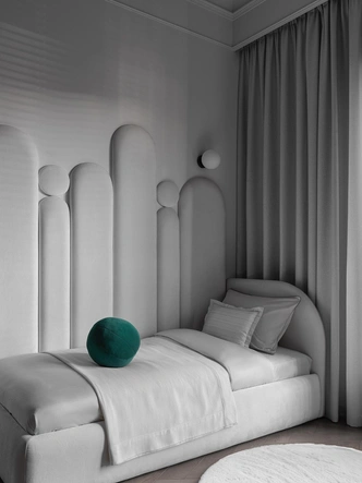 Один из самых больших радиусных элементов — в гостевой спальне. Он не только делает ее архитектуру интереснее, но и решает важную планировочную задачу: позволяет немного уступить площадь соседней спальне, при этом сохраняя полноценный вид из окна.