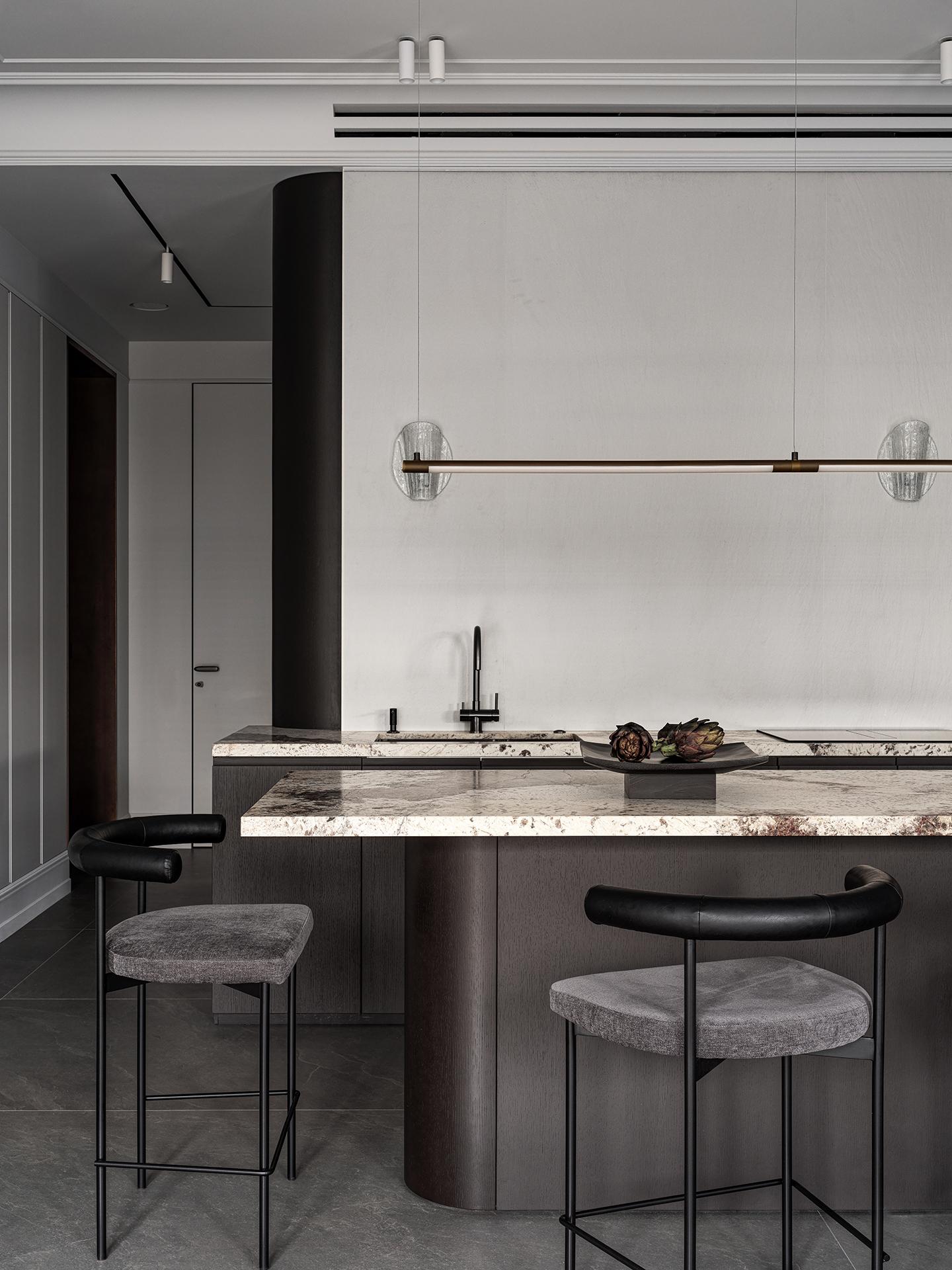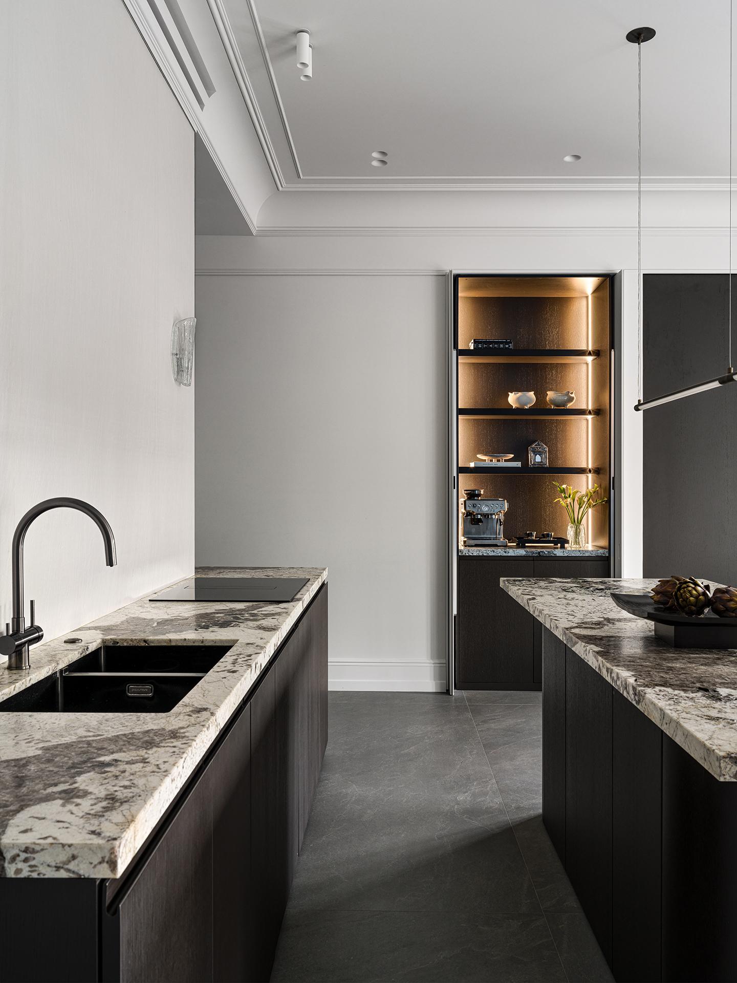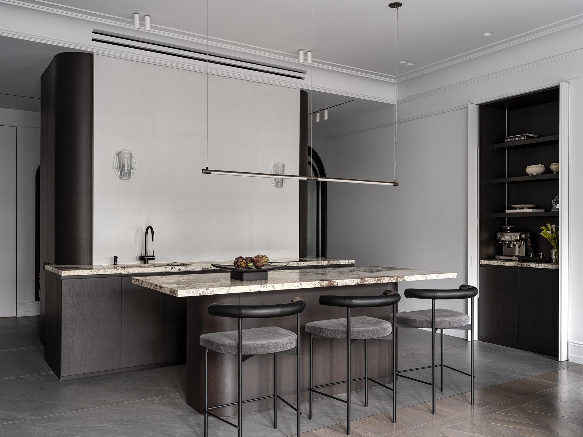 Мебель, двери и стены — все выстроено в композицию, где все элементы усиливают визуальное значение друг друга. Все благодаря симметричному и соосному расположению. Акцентами, привносящими парадности, выступают металл, бронза и кварцит Patagonia на столешницах кухни и острова, собирающий в себе всю палитру оттенков интерьера. Объема и глубины добавляет темный шпон.