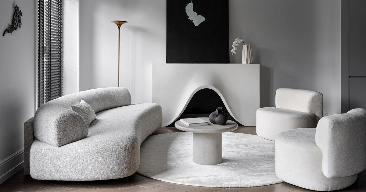 Мягкая мебель изготовлена на заказ. На постаменте ваза «Белое на белом», Наталья Коншина, галерея Backbone. Керамический кофейный столик Waterfall table, Елена Орехова, Modenature. Графика «Панорама упавшего бутерброда», Иван Языков.