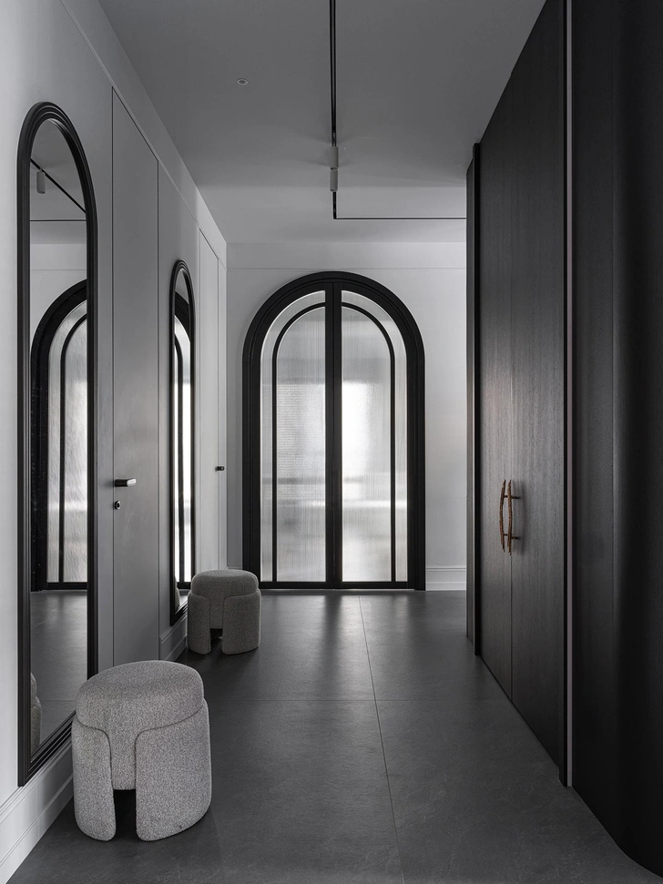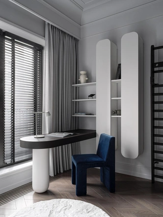 В интерьере в целом много скругленных стен и углов. На это нас вдохновила форма фасада — он немного закруглен, поэтому мы решили продолжить этот мотив. Мягкие линии повторяются не только на камине, но и в арочных формах, в пластике карниза, размывающего линию стыка стен и потолка. В центре квартиры мы разместили блок с гардеробной со скругленными углами — он выглядит акцентно и сам по себе удобен. К одной из его стен примыкает кухня, которую дополняет остров с хранением и эффектный кофе-пойнт.