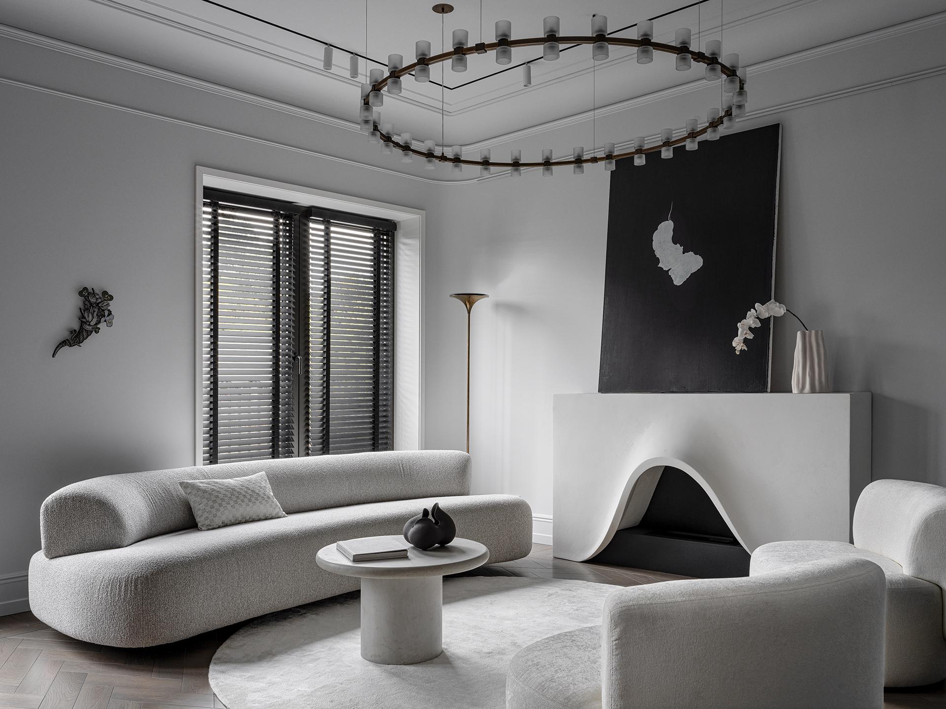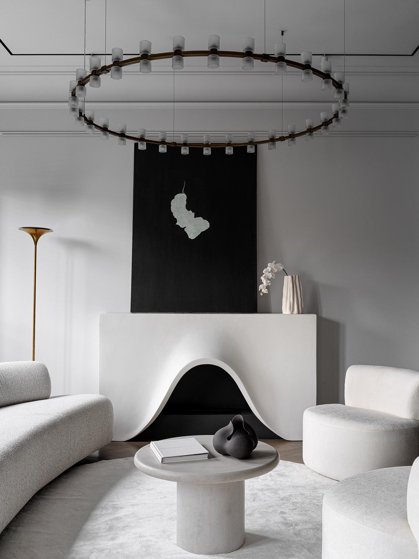 Ковер, Art de vivre. Камин изготовлен по эскизам Belousova.interior, Plumo. Люстра, диван и кресла изготовлены на заказ. Инженерная доска на полу, Luxury Floors. Краска LG223, Shallows, Little Greene. Скульптура BUD, Анна Глазова, галерея Backbone. Столик, Plumo. Жалюзи, Togas. Винтажный торшер, Италия, 1980-е годы. Ваза «Фламанд», Светлана Левадная. Картина на камине «Озеро согласия», Виктор Алимпиев. Картина слева «Гедонизм», Анна Фобия.