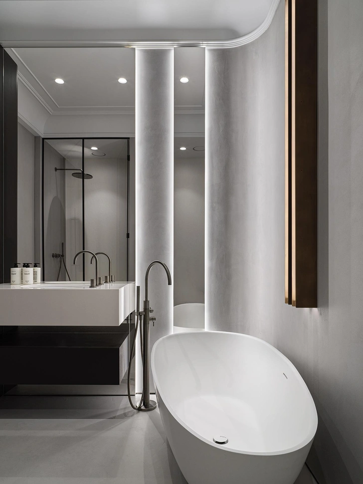 Микроцемент, Expert Deco. Мебель изготовлена на заказ. Смесители, Ritmonio. Ванна, Salini.