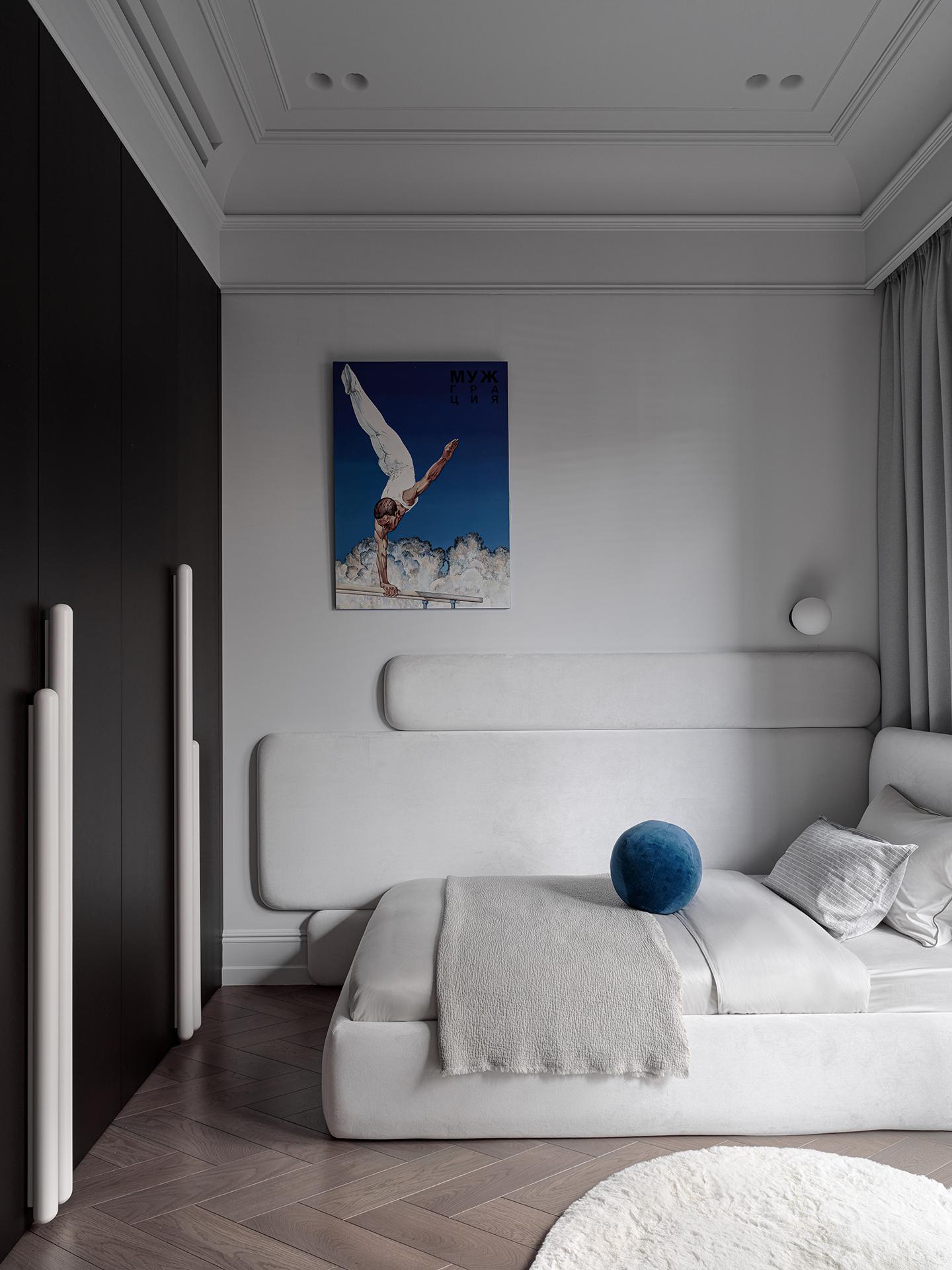 Мягкая мебель изготовлена на заказ. Ковер, Art de vivre. Текстиль на кровати, Atelier tati. Картина Василия Шумова из серии «Идеальный муж».