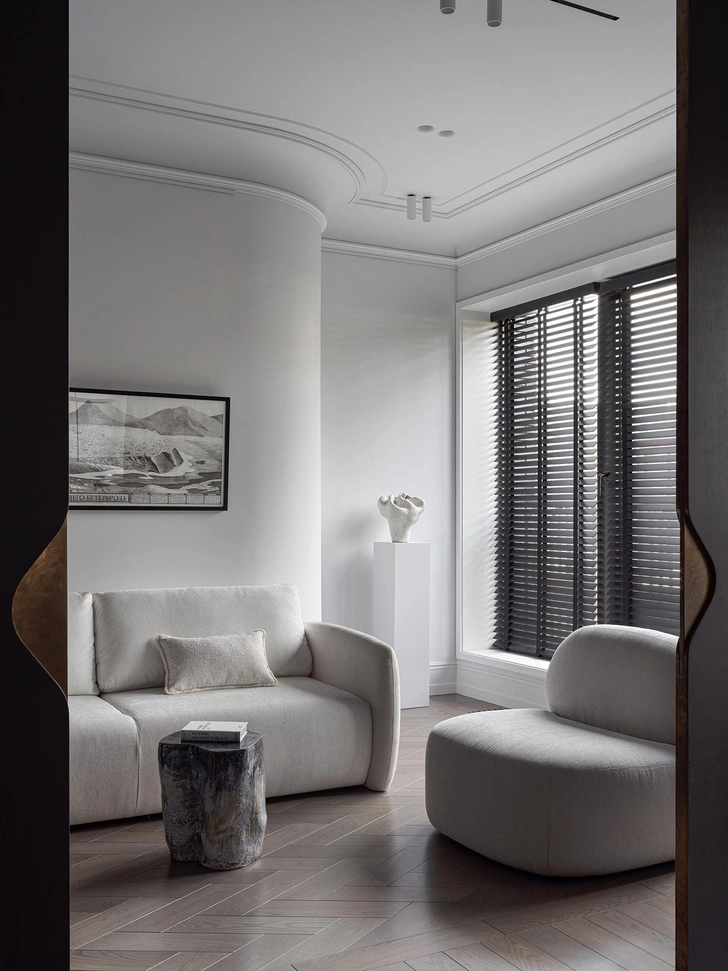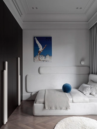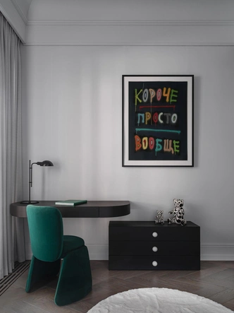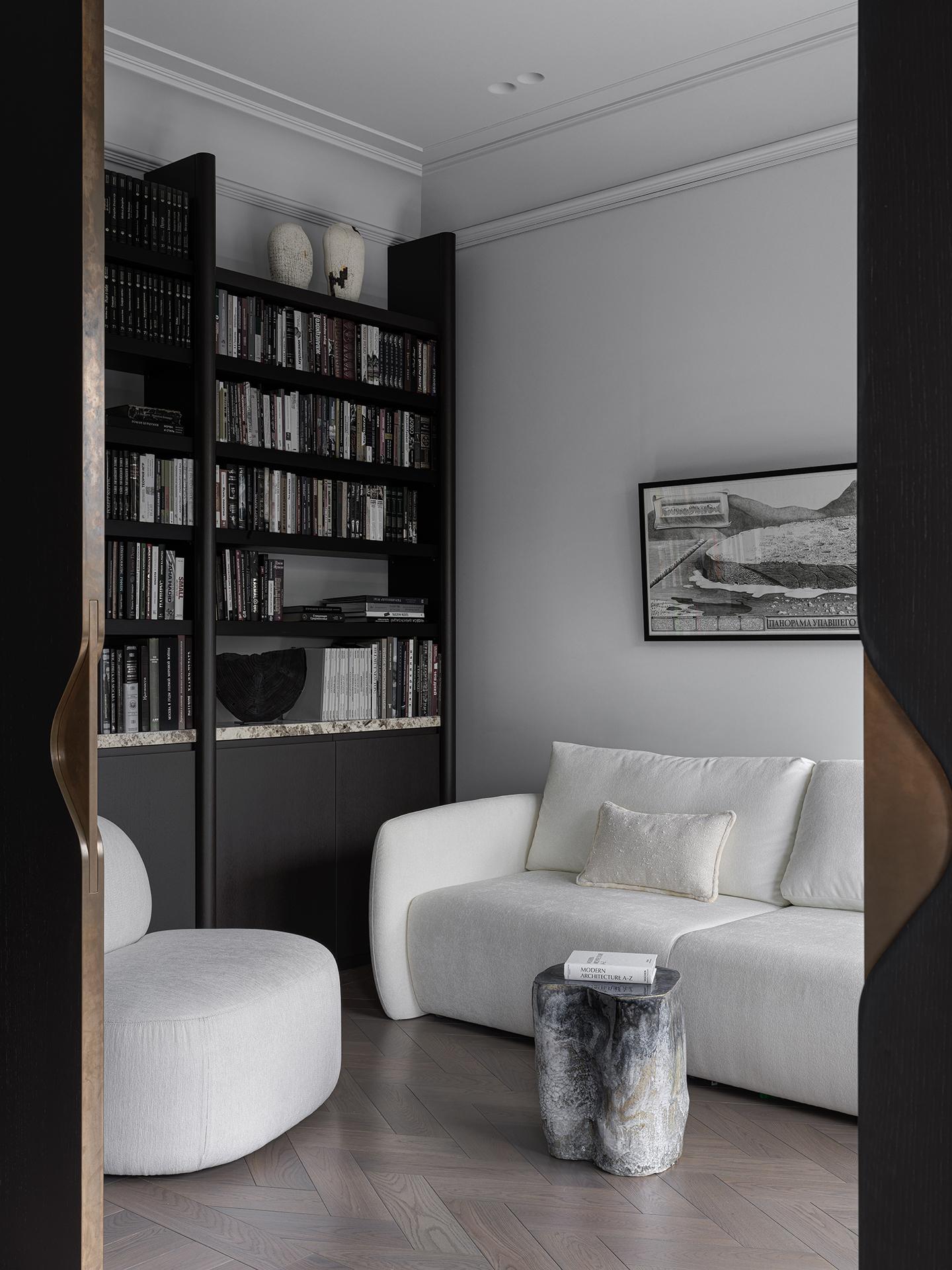 Заказчики — коллекционеры и ценители искусства, а хозяйка квартиры еще и художница. Интерьер, с одной стороны, стал чистым холстом, фоном для коллекции заказчиков, а с другой — сам по себе не лишен интересных деталей: здесь много скульптурной мебели и декора, напоминающего арт-объекты. Экспозицию, кстати, можно легко менять: картины закреплены на леске к профилю, как в картинных галереях.