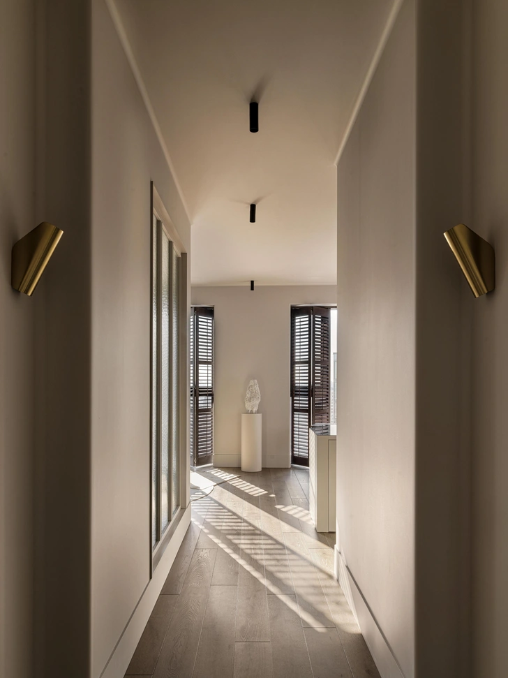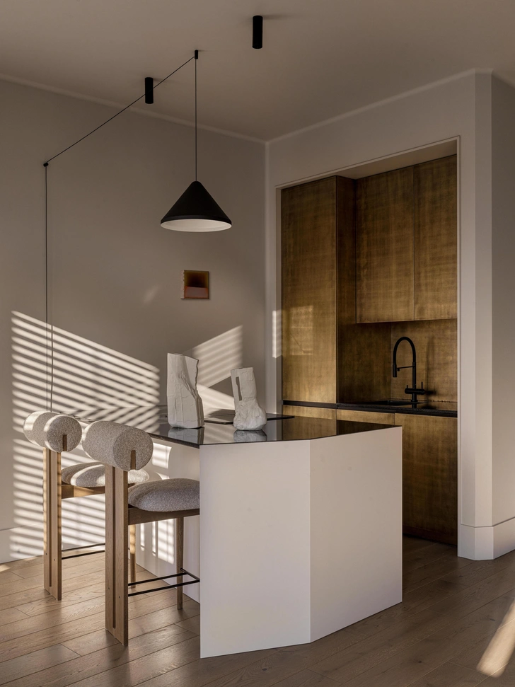 Со светом я работал как с материалом и инструментом зонирования: дневной модулируется деревянными ставнями, а искусственный выстроен через разнообразные сценарии. Это помогло создать скульптурный интерьер без избыточных перегородок, но с интересными архитектурными элементами.