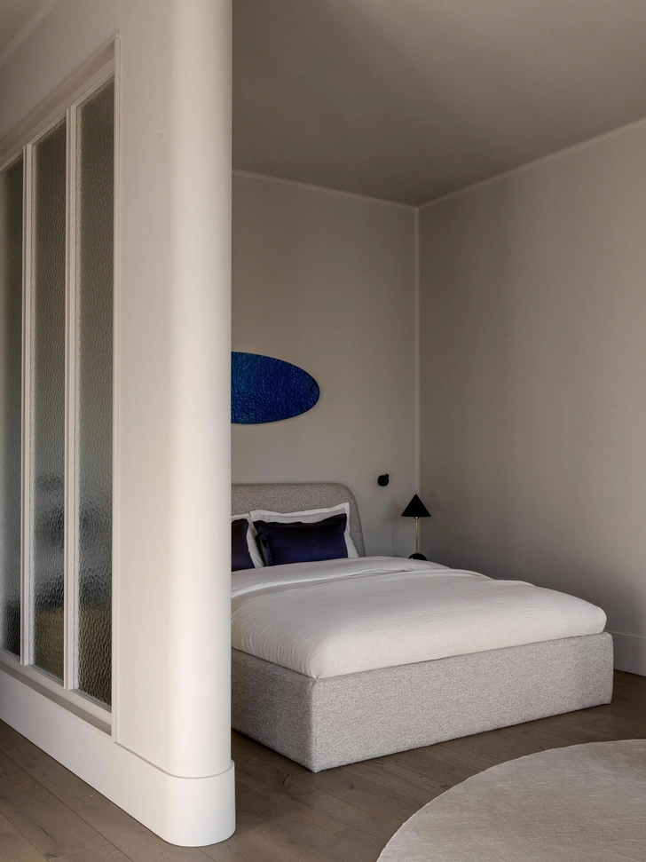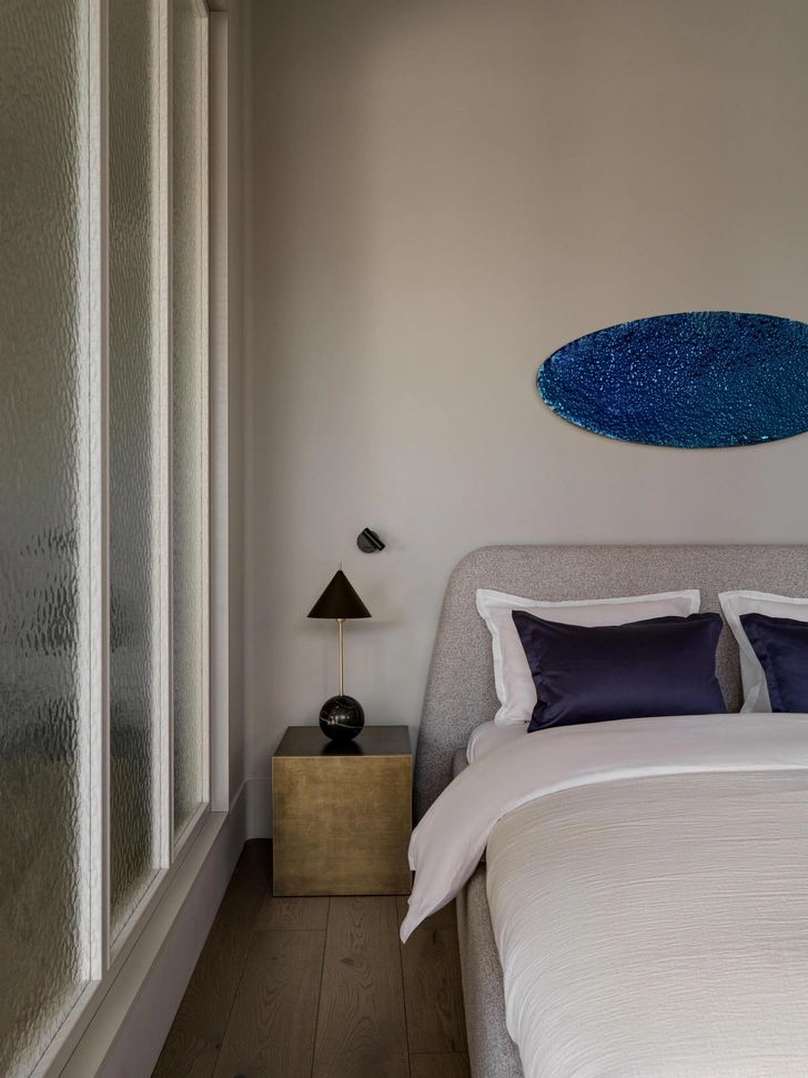 Прикроватные светильники, Kelly Wearstler, Visual Comfort. Текстиль, Atelier Tati. Мебель изготовлена на заказ.