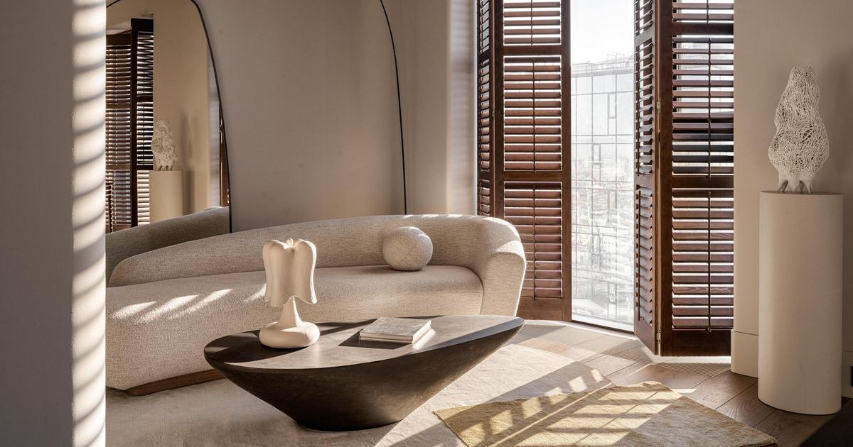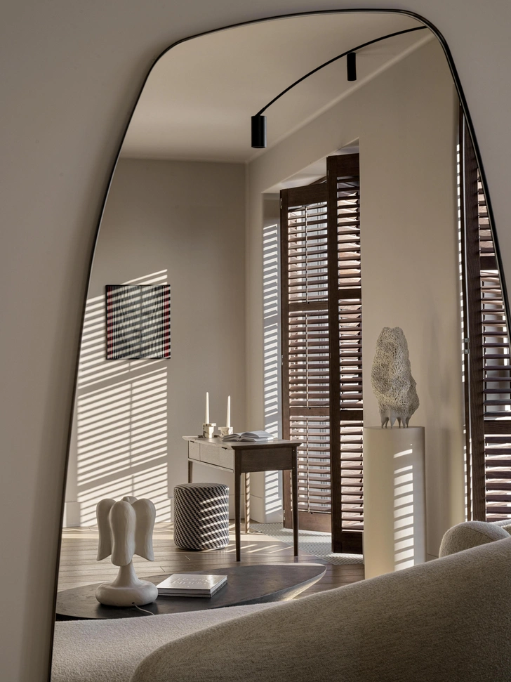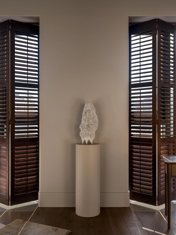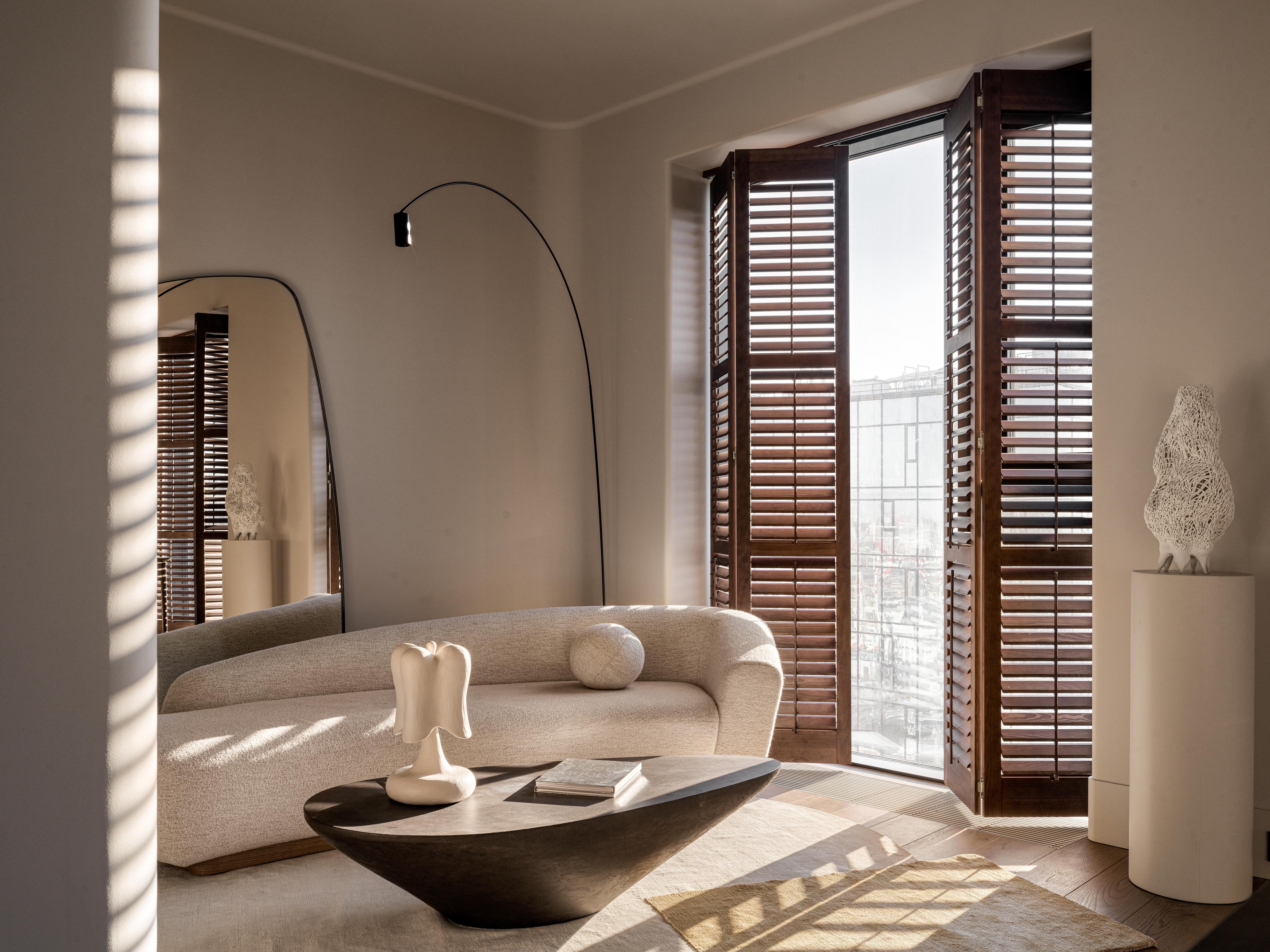 Деревянные ставни изготовлены на заказ. Торшер Fox, Nemo. Диван, Modenature. Журнальный столик, The PLY. Ковер, Calle Henzel, Dovlet house. Настольная лампа, Lamp.e.e., Евгения Базарова. Скульптура «Переход VII», Наталья Макарова, Palaty Gallery.