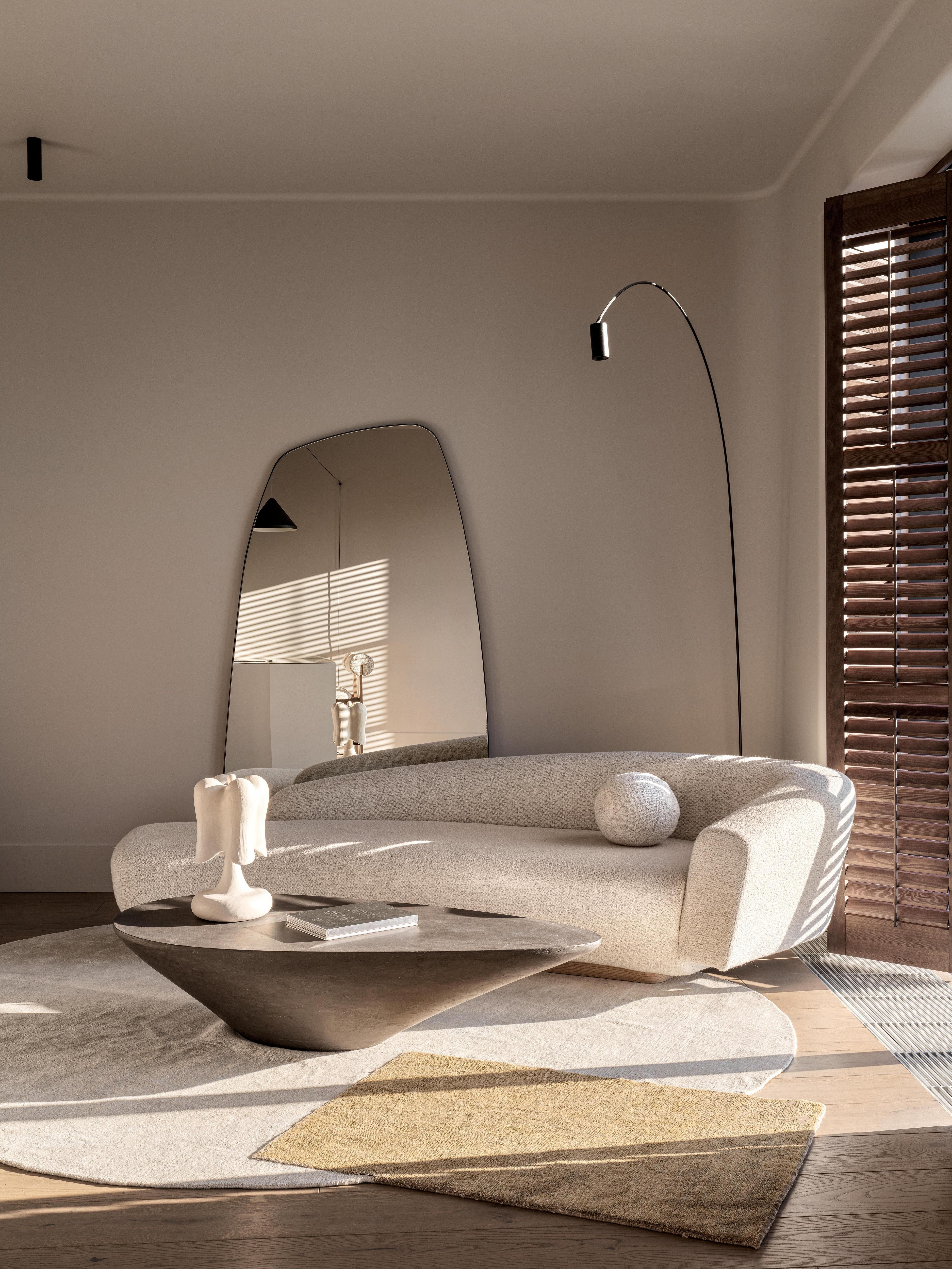 Важно заметить и округлые формы мебели и арт-объекты — в каждой зоне есть что-то индивидуальное. Одним из самых необычных предметов стала скульптура «Переход VII» Натальи Макаровой (галерея Palaty) в гостиной — смысловой центр пространства. Благодаря такой насыщенной, но в то же время лаконичной композиции фактур, форм и материалов интерьер выглядит целостно.