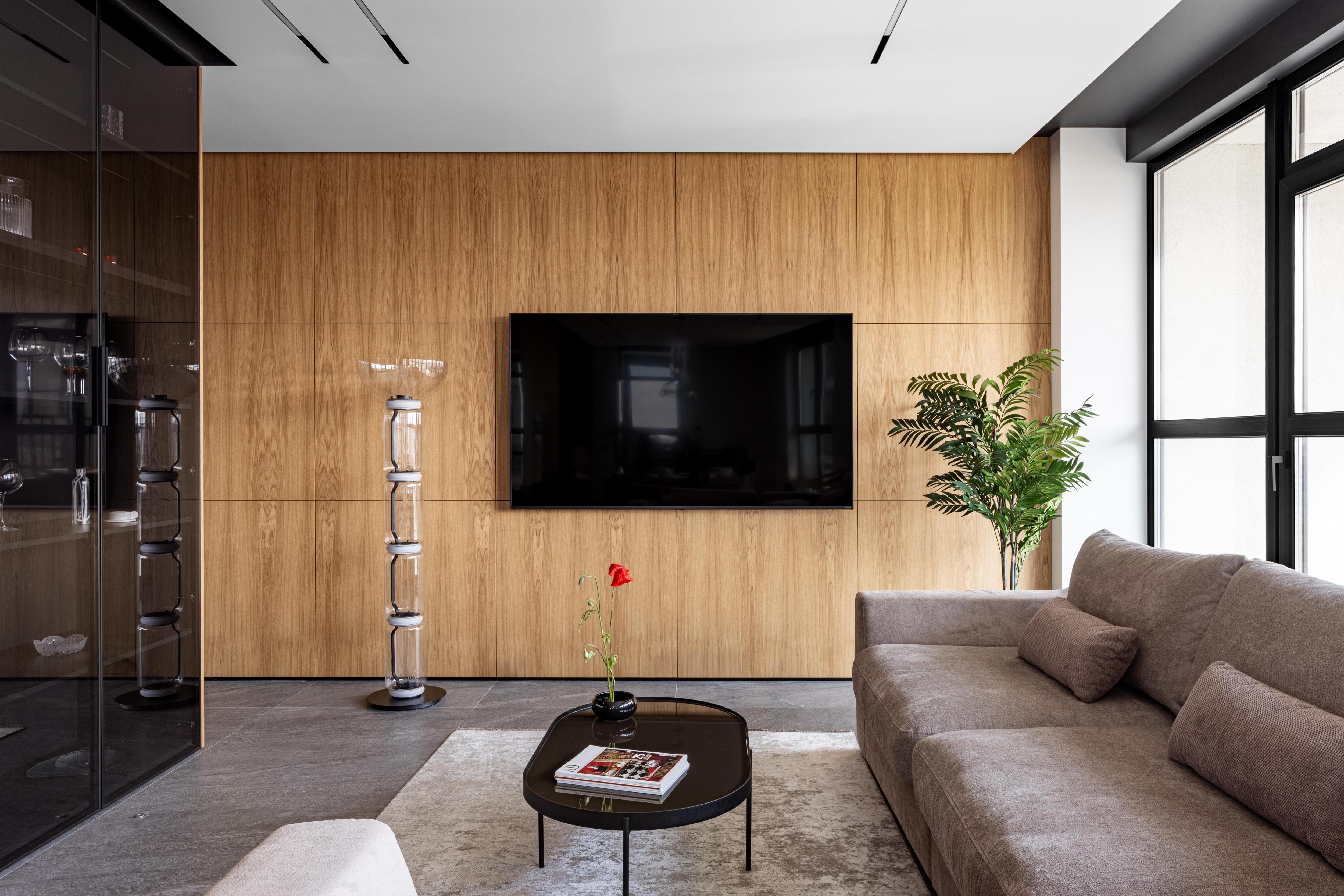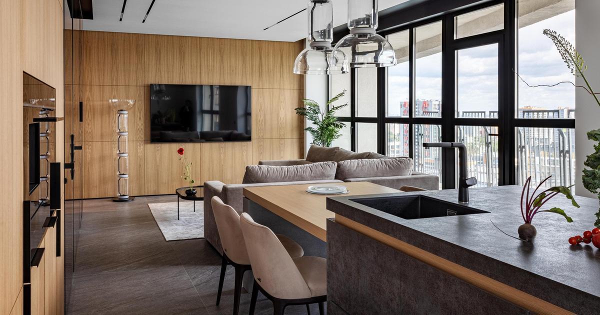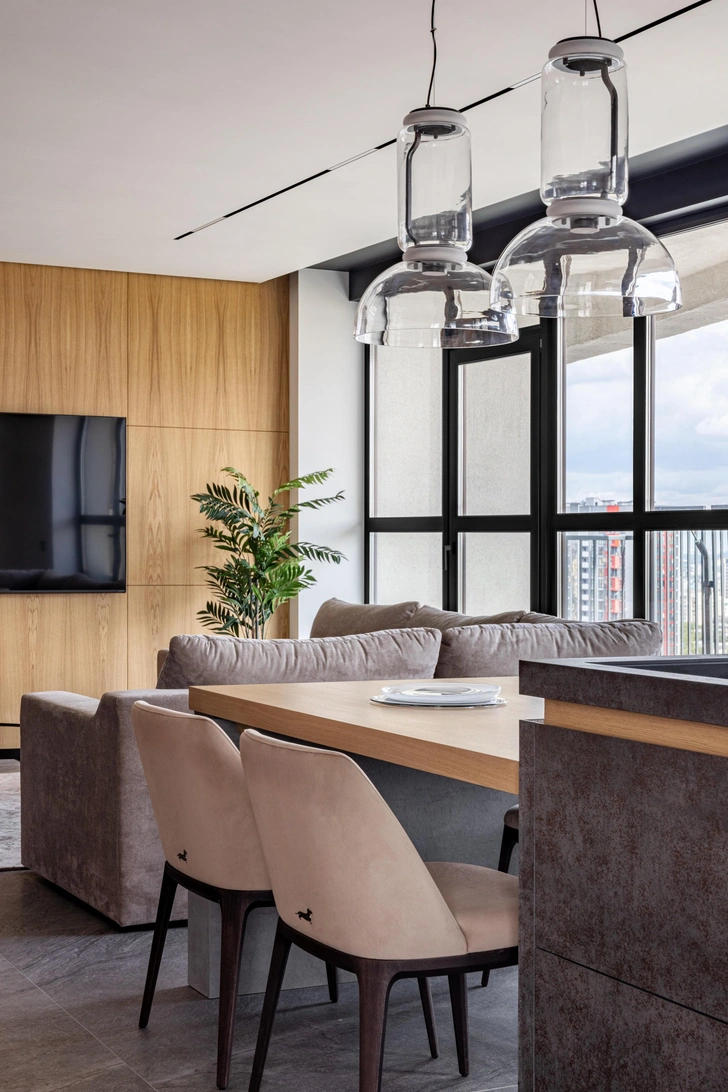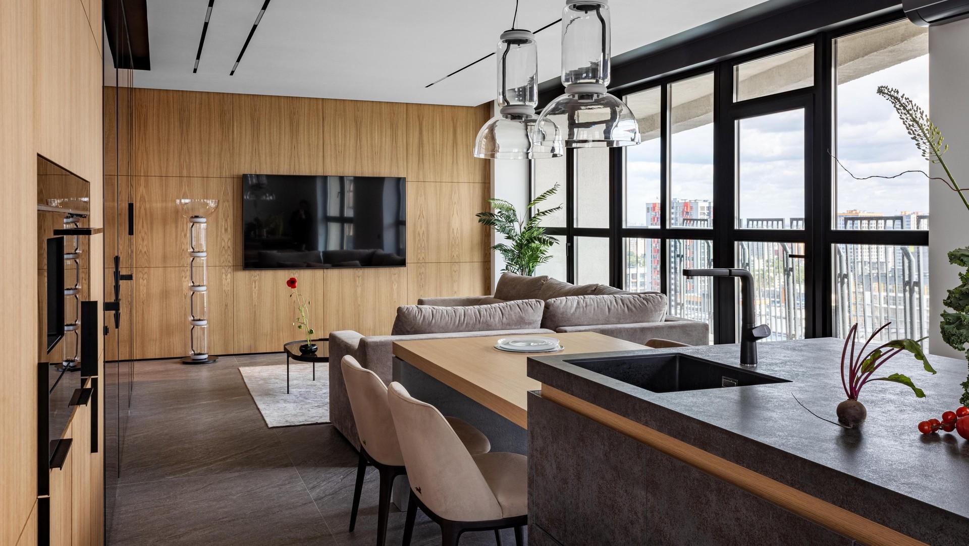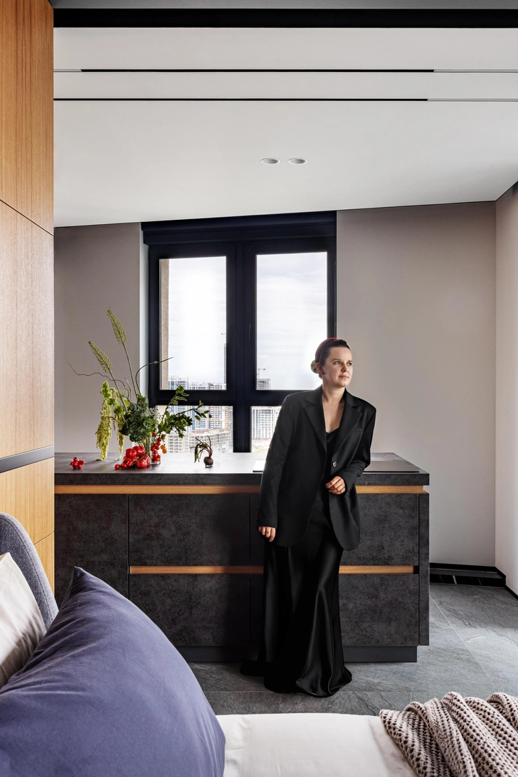 В этой квартире была очень непростая геометрия, местами без прямых углов. Но это стало для нас не ограничением, а поводом найти оригинальные решения. Чтобы в квартире ощущалась легкость, мы сделали свободную планировку — кухня-гостиная с панорамными окнами получилась очень просторной, воздушной. А спальню, гардеробную и душевую заказчики попросили зонировать.