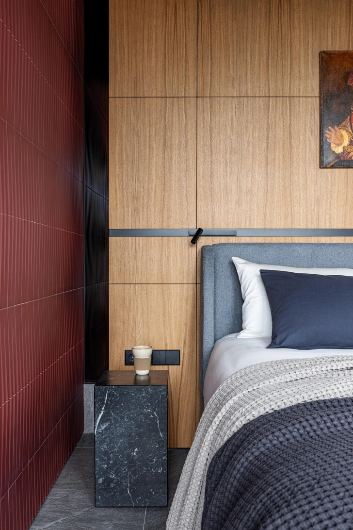 В спальне — успокаивающий бордовый цвет, напоминающий красивые зимние закаты. Здесь тоже есть большое панорамное окно, каждое утро можно просыпаться с прекрасным видом на город, смотреть на первые лучи солнца или на дождь, радугу.