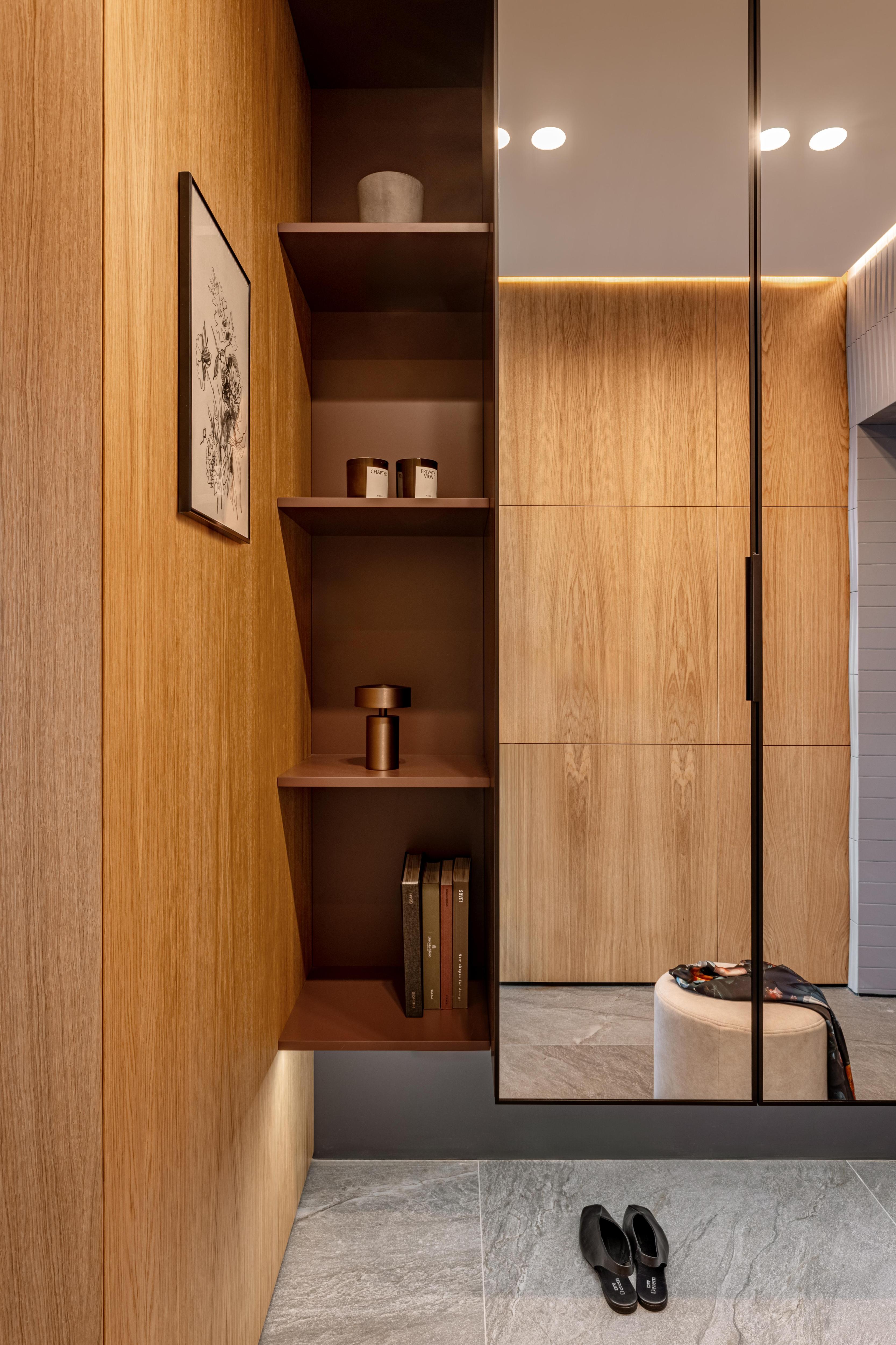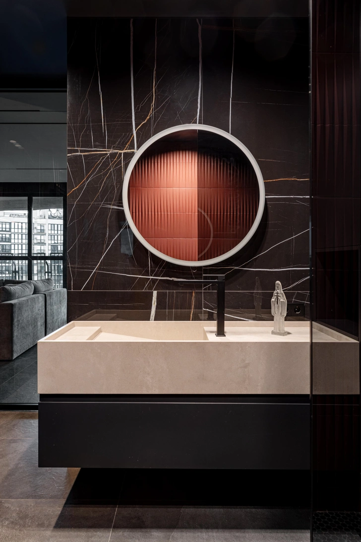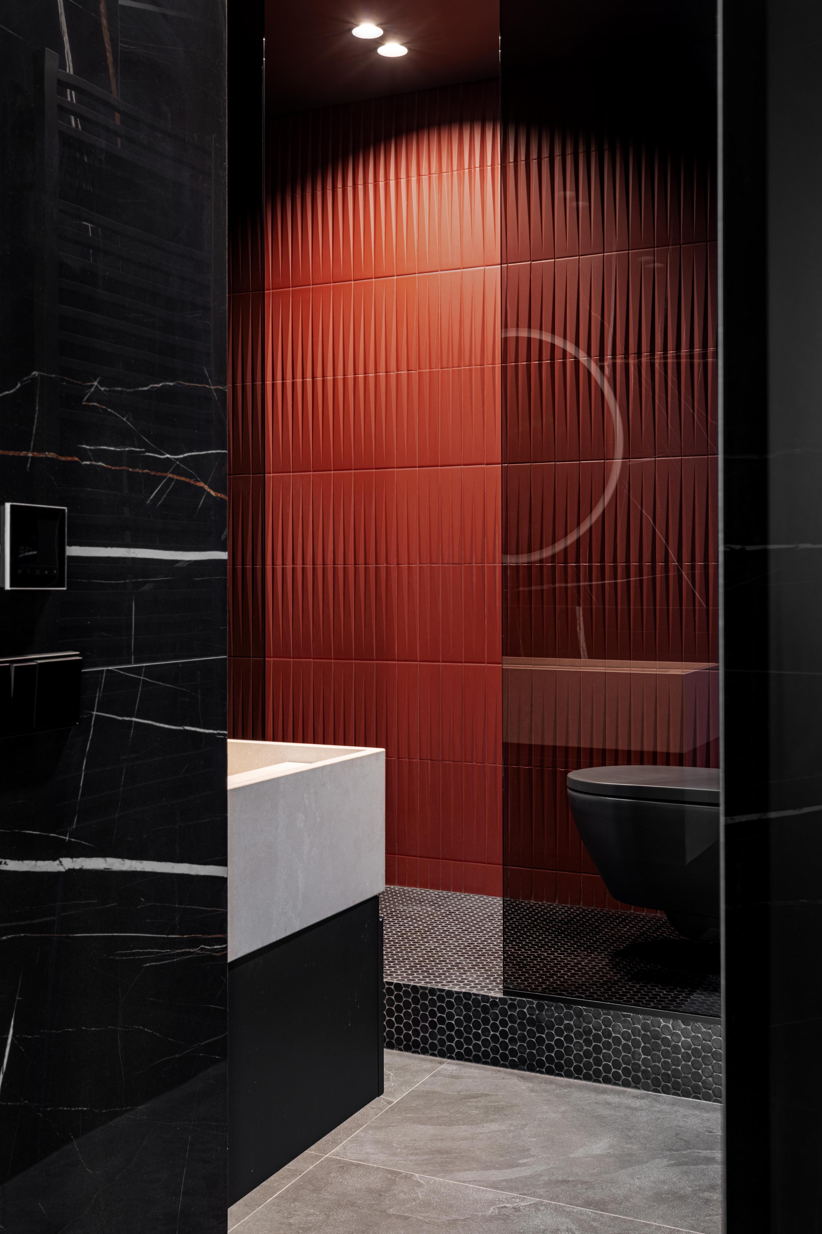 В ванной, как и в спальне, тот же благородный красный акцент, придающий интерьеру целостности. На контрасте с другими зонами здесь больше глубоких оттенков. Вместе со светом выглядит даже театрально: чуть драматично, но очень уютно.