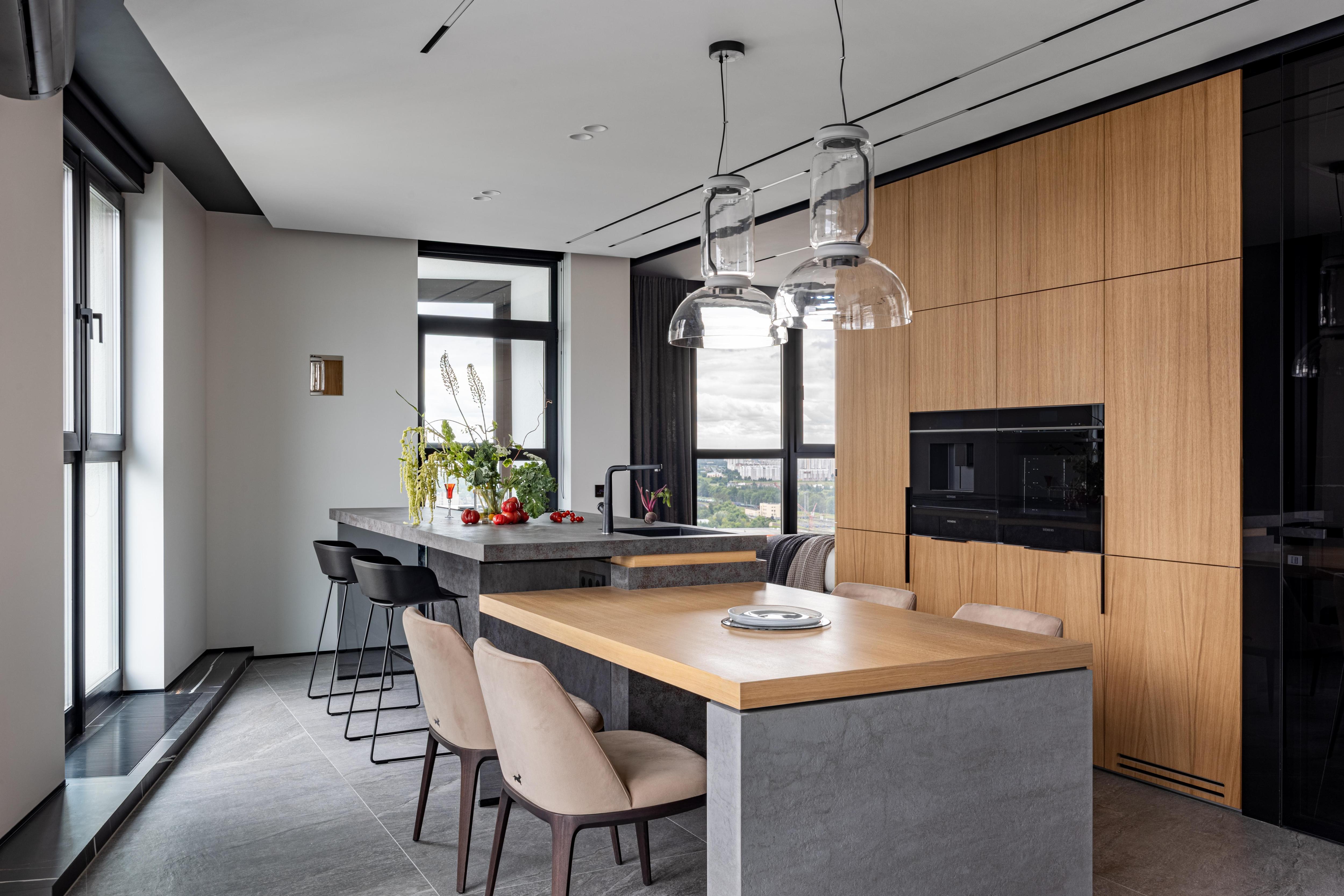Работая над кухней, мы всегда думаем не только об эргономике, но и о визуальной чистоте: мелкая техника и чайник скрыты, у них есть специальное место, но при этом их не надо долго искать. В острове мы предусмотрели варочную поверхность со встроенной вытяжкой, которая не нарушает чистоты линий. А за высокими фасадами шкафов — духовой шкаф, кофемашина и даже подогреватель посуды. В общем, все для ценителей маленьких утренних ритуалов.